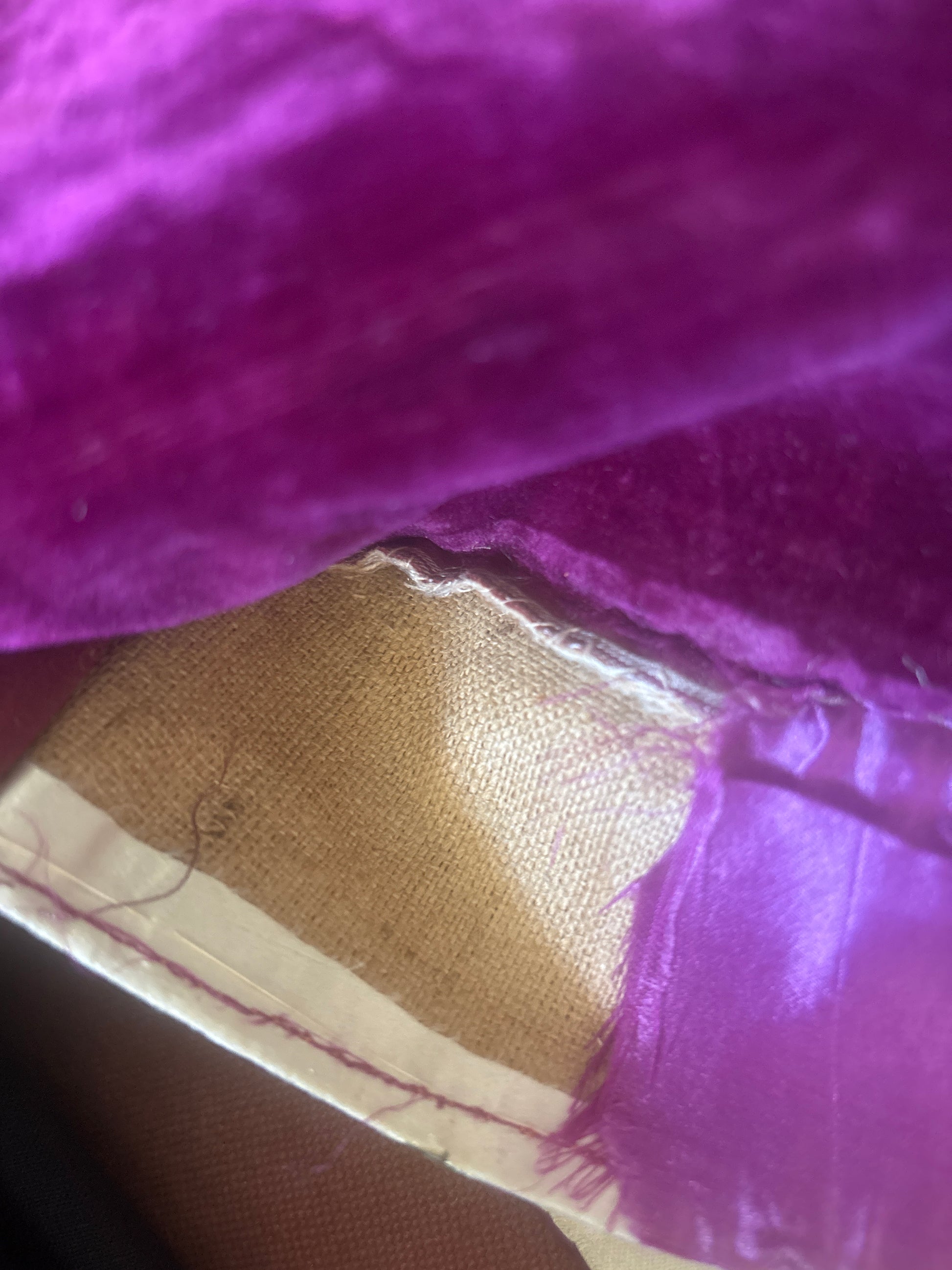 This is a hand-stitched probably ceremonial or formal jacket, likely French and dating from the early 19th century. It is made from magenta-pink silk velvet: the colour is deeper and more saturated in person than it may appear in photographs, closer to a rich fuchsia or magenta depending on lighting. It features a cream silk collar and front panel, which is embroidered by hand with flat gold metal strips in a scrolling floral and foliage design. The embroidery is couched directly to the surface and remains bright and largely intact. Inside the collar is a layer of coarse plant-fibre canvas used to give structure—this kind of internal stiffening is a tailoring method seen in garments from this period, especially in more formal or symbolic clothing.