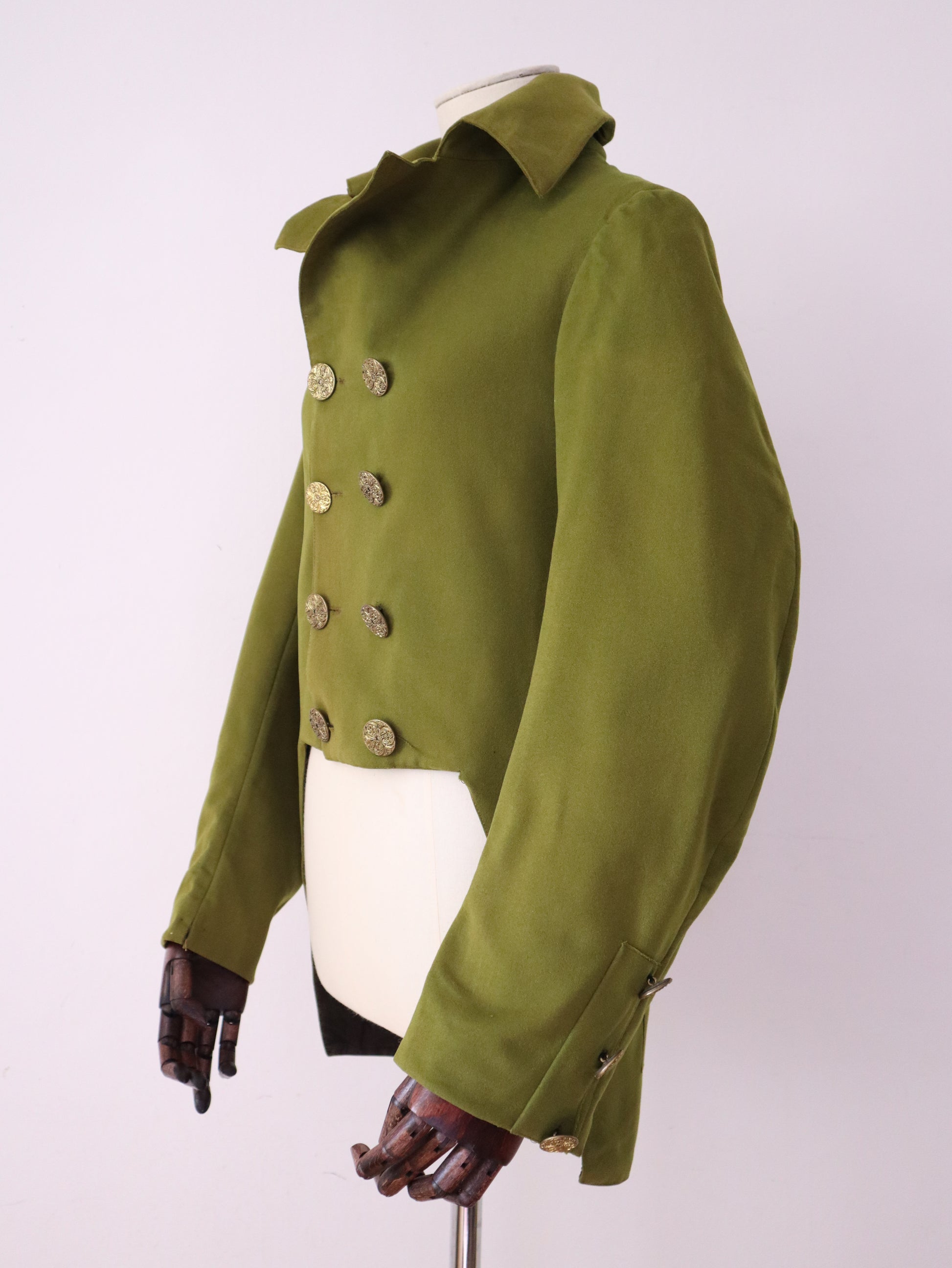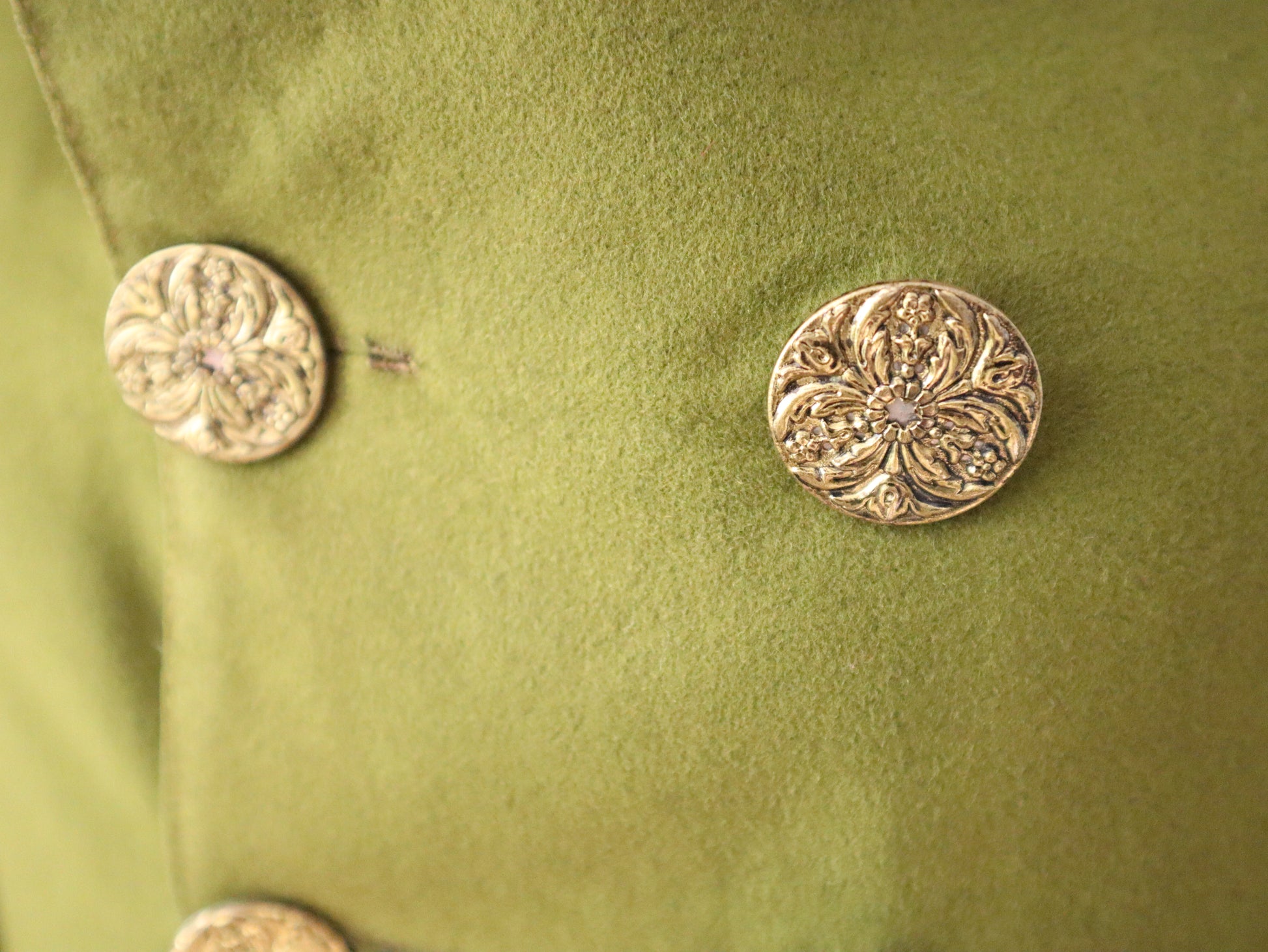 The fabric is a bright green wool, fully lined in cotton. The coat fastens with eight 19th-century metal buttons featuring ring backs and decorative designs. The double row of buttons allows it to be worn left over right or right over left. Two buttons are placed at the back waist, in keeping with the traditional tailcoat silhouette.