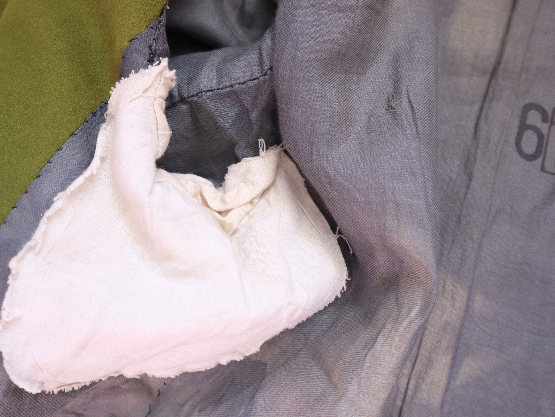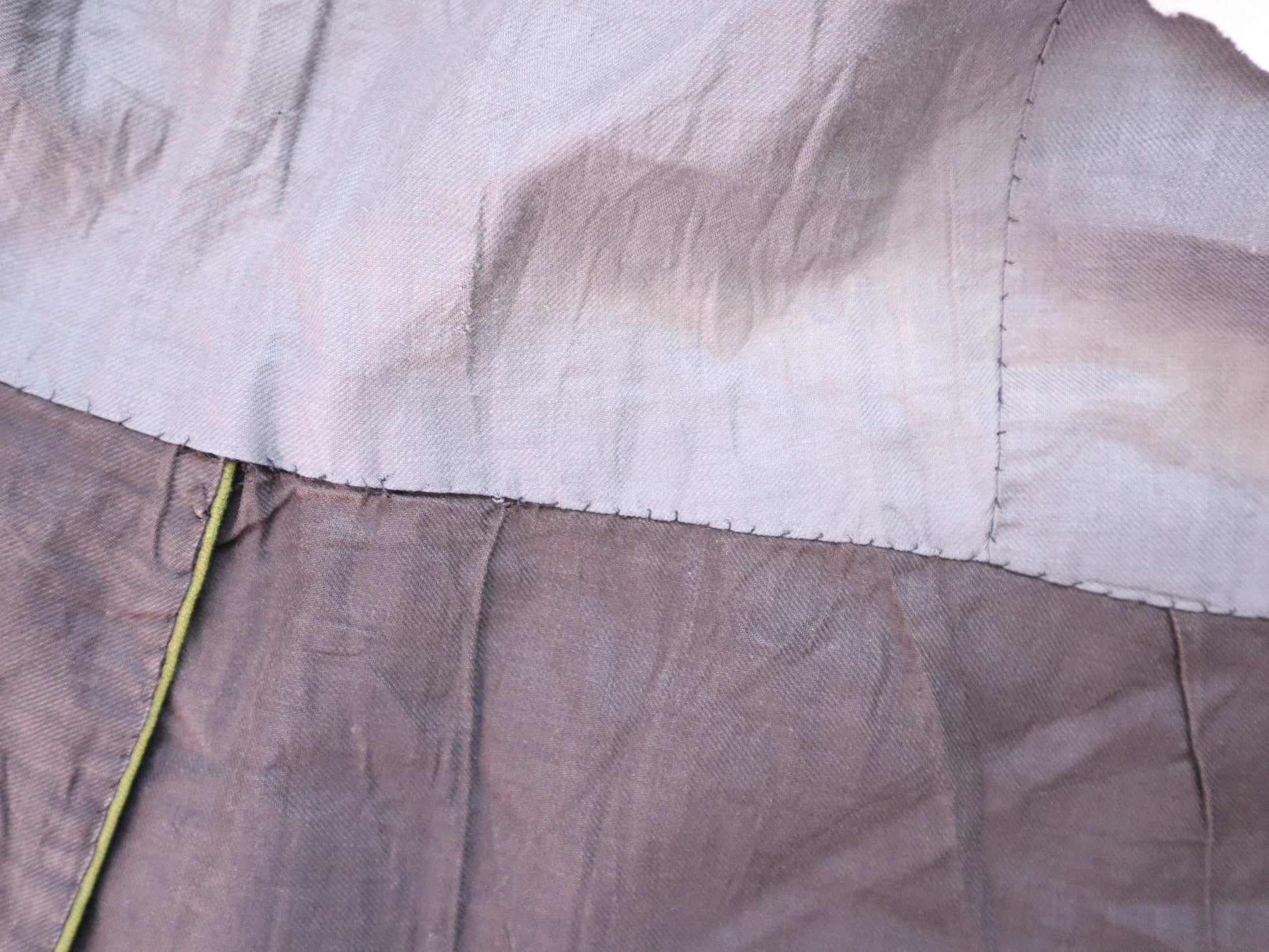 - Additional hand-sewn repairs at the back of the neck and right sleeve seam