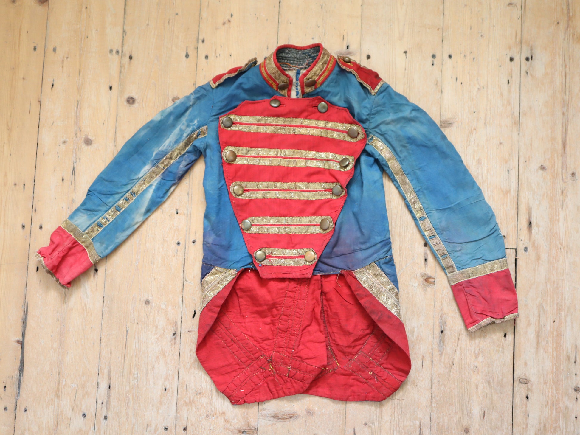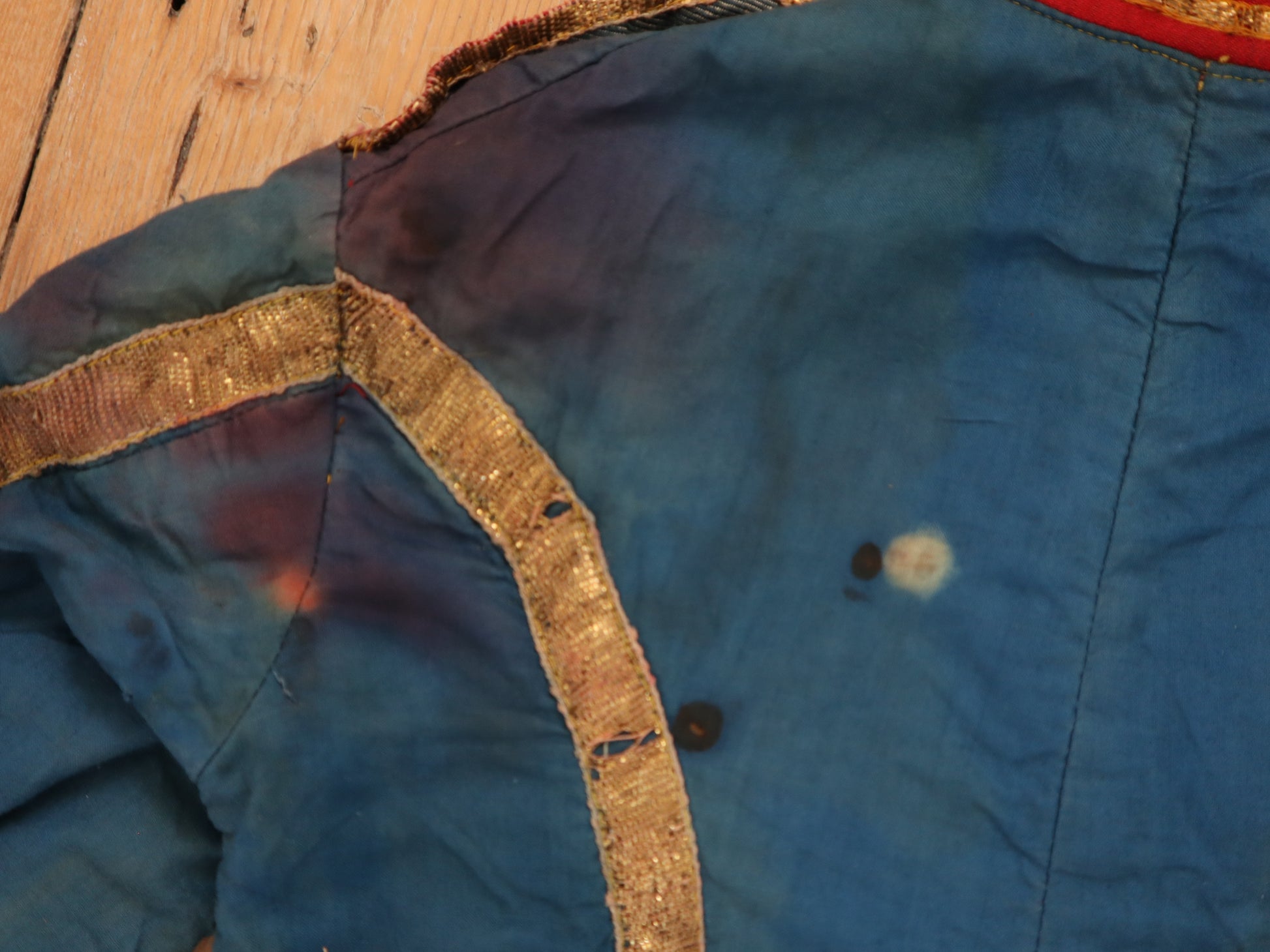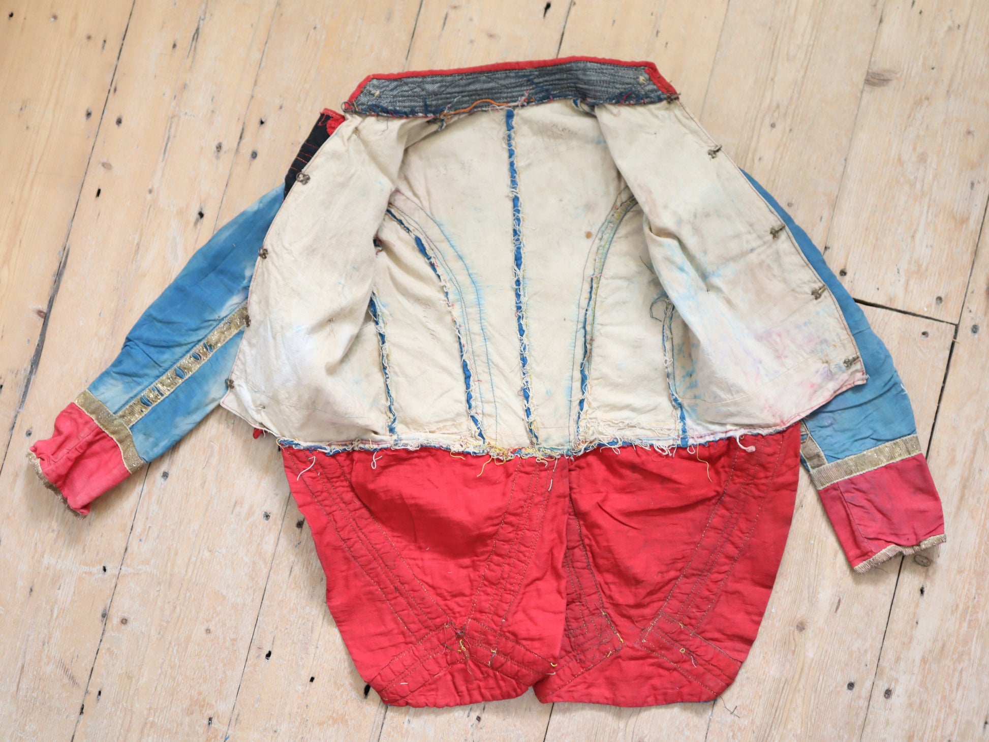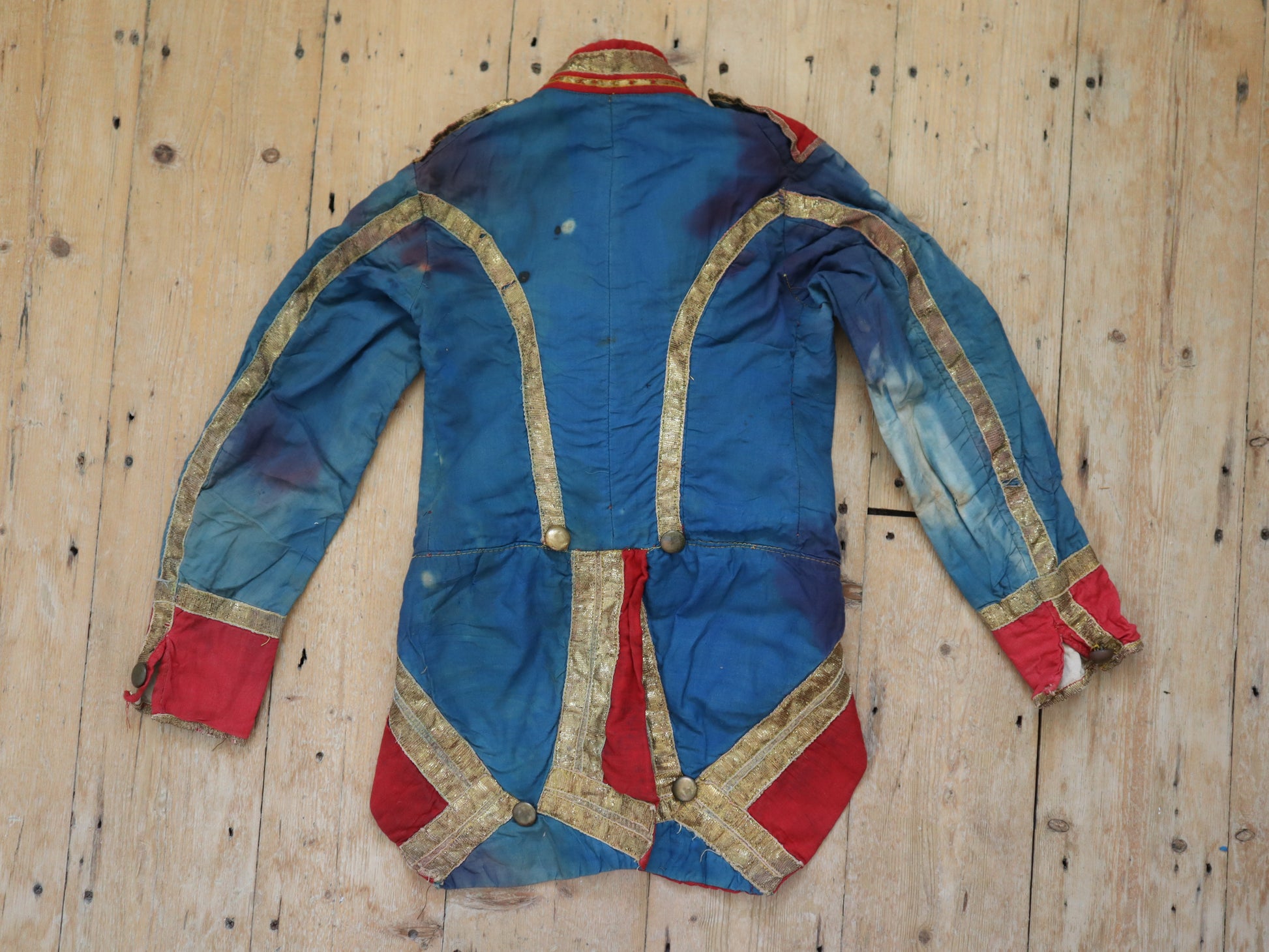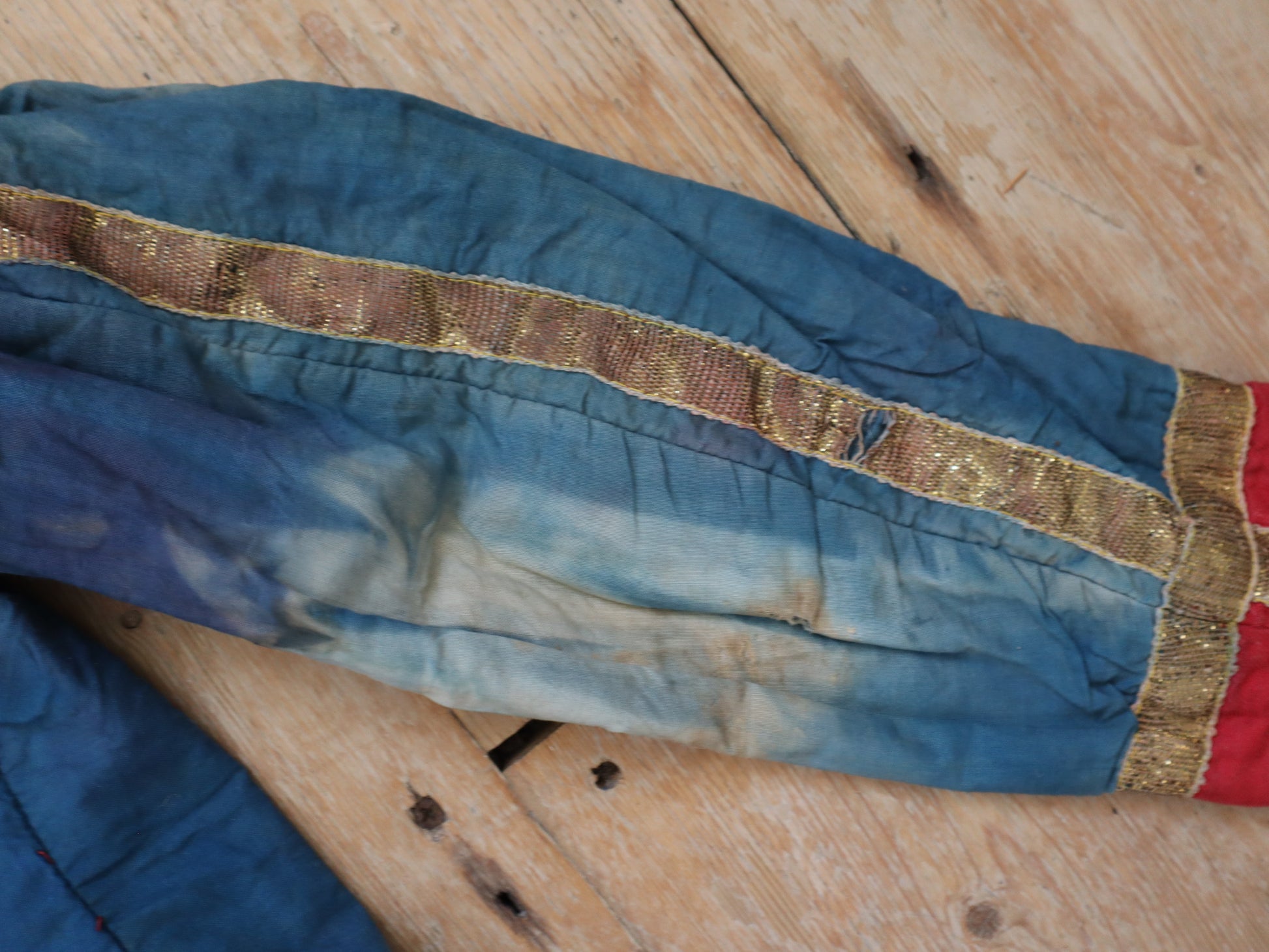 Antique French Theatre Costume 19th Century Military Style Indigo Blue Red Sun Fade Gold Ribbon Trim