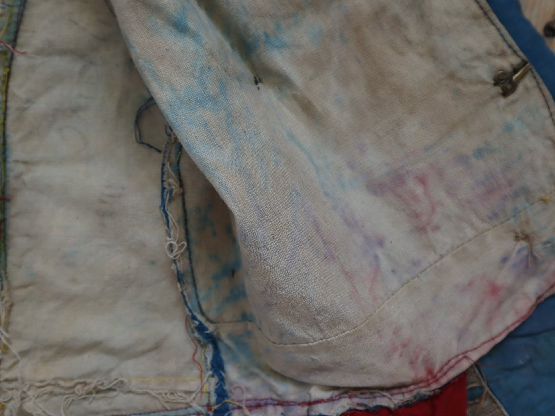 Condition: Freshly laundered with cool water a gentle detergent. This has lots of colour fade on the right sleeves and a patch on the back. There are many small marks and discolouration. Please inspect the photos and ask any questions you have.