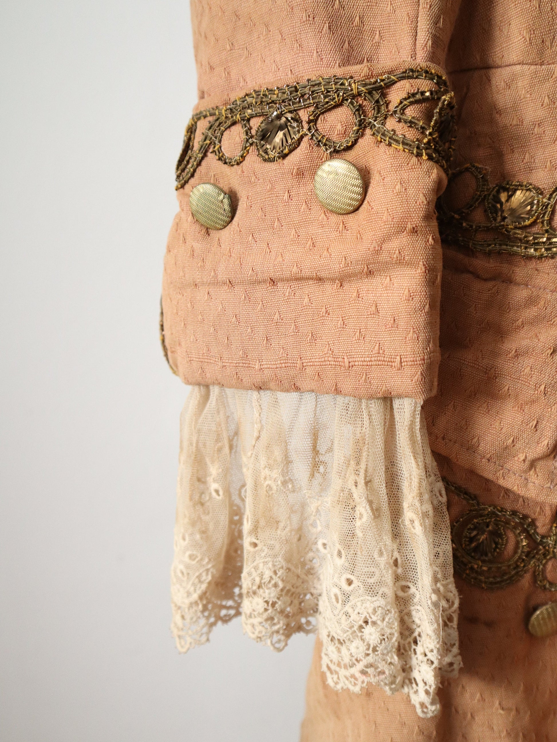 Made from a beautifully textured peach cotton, the jacket features wide turn-back cuffs with lace trim, decorative pocket flaps, and ornate gold metallic thread embroidery throughout. The front and cuffs are finished with bold gold-tone metal buttons, designed for stage impact. It’s fully lined—grey cotton in the bodice, yellow cotton sateen in the lower half—with the original Aristide Boyer Marseille costumier’s stamp inside.