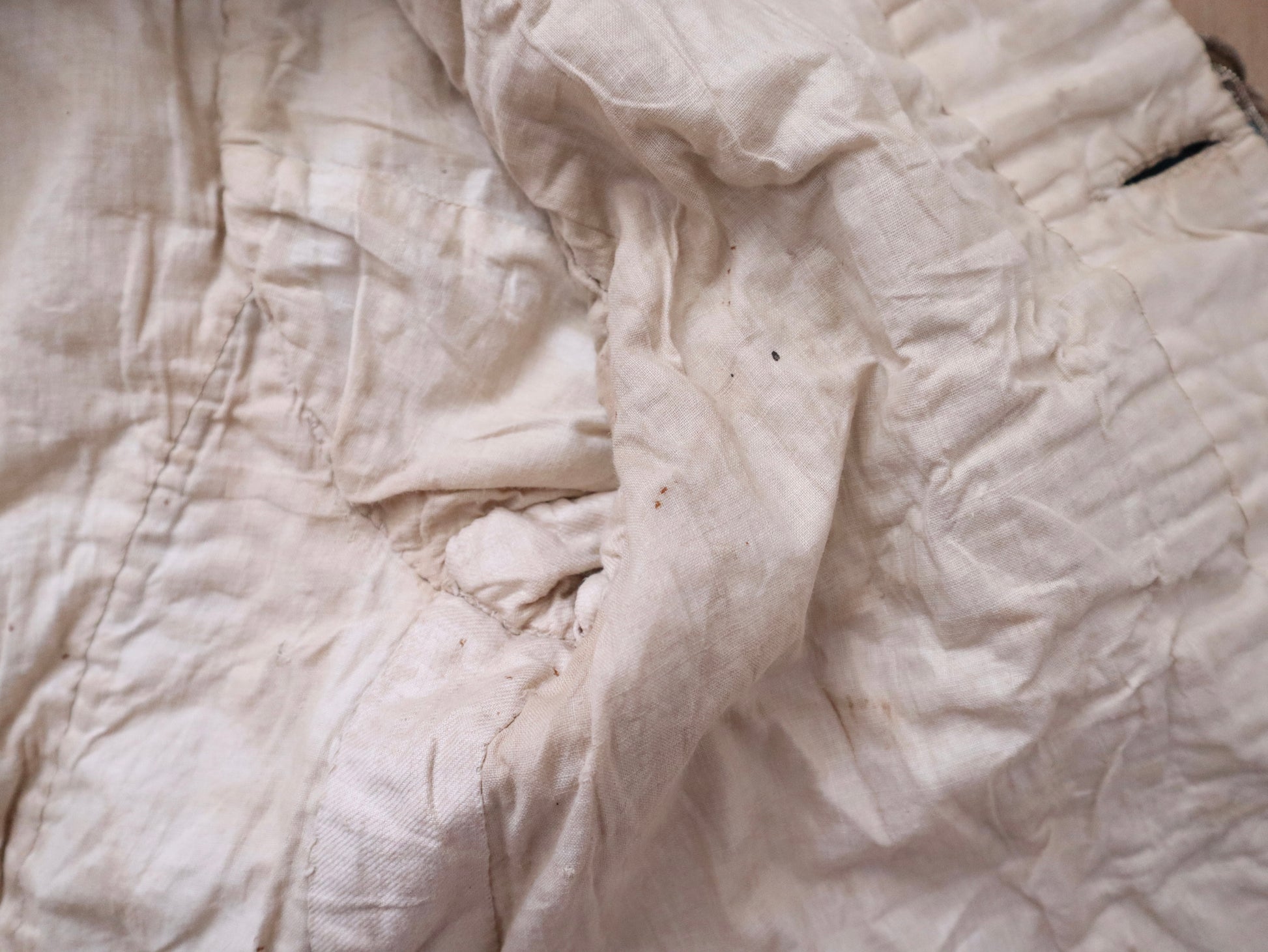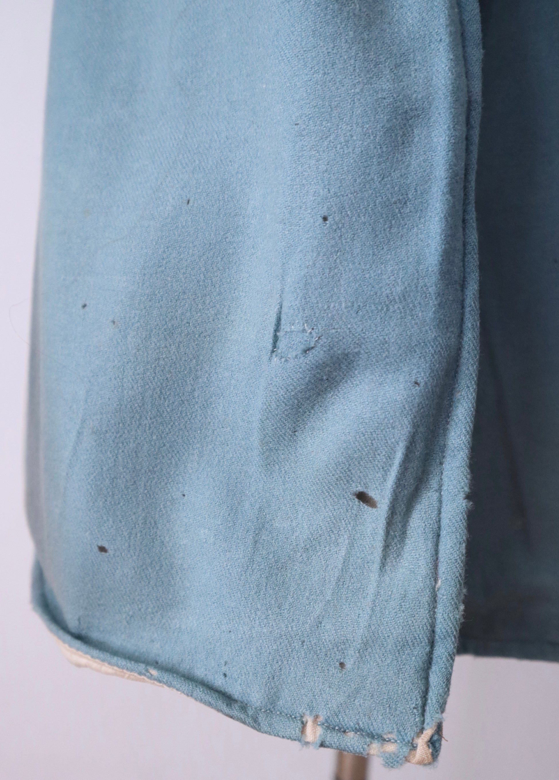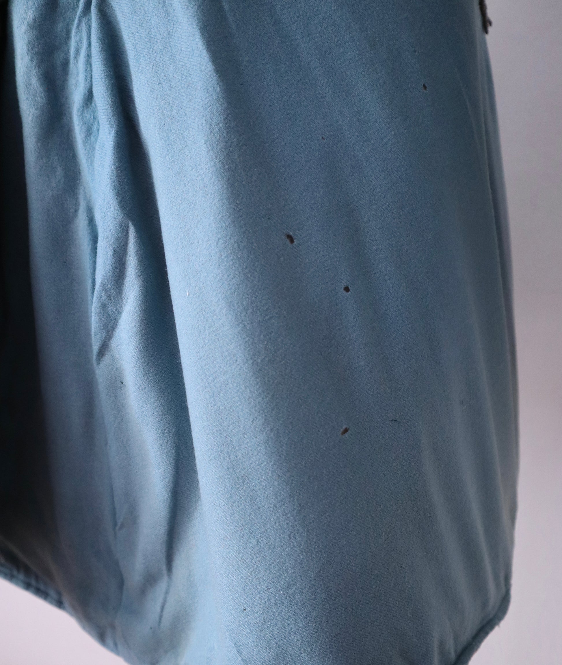 - On the front waistband, the right side has a cluster of holes; the left side shows moth nibbles and some fading