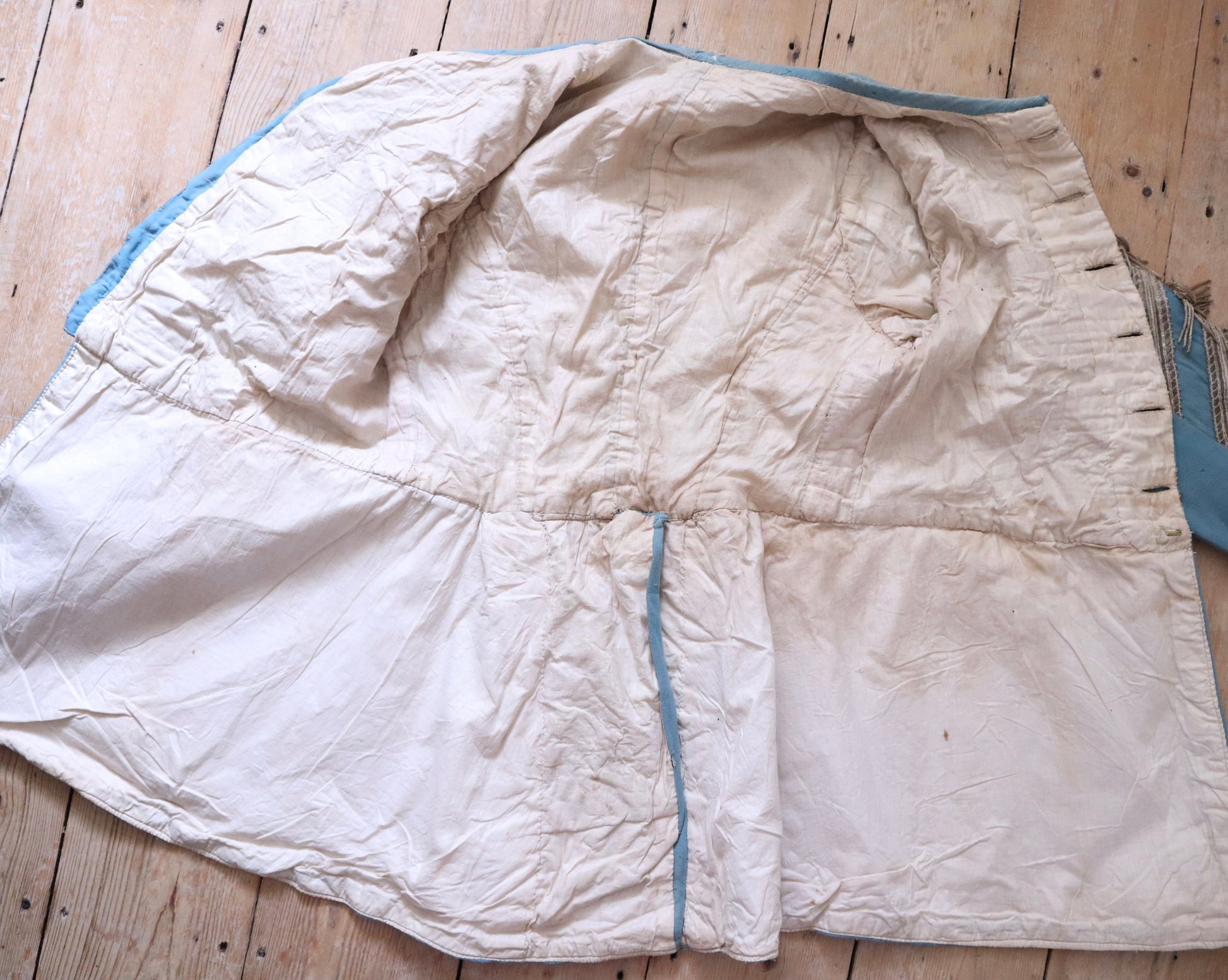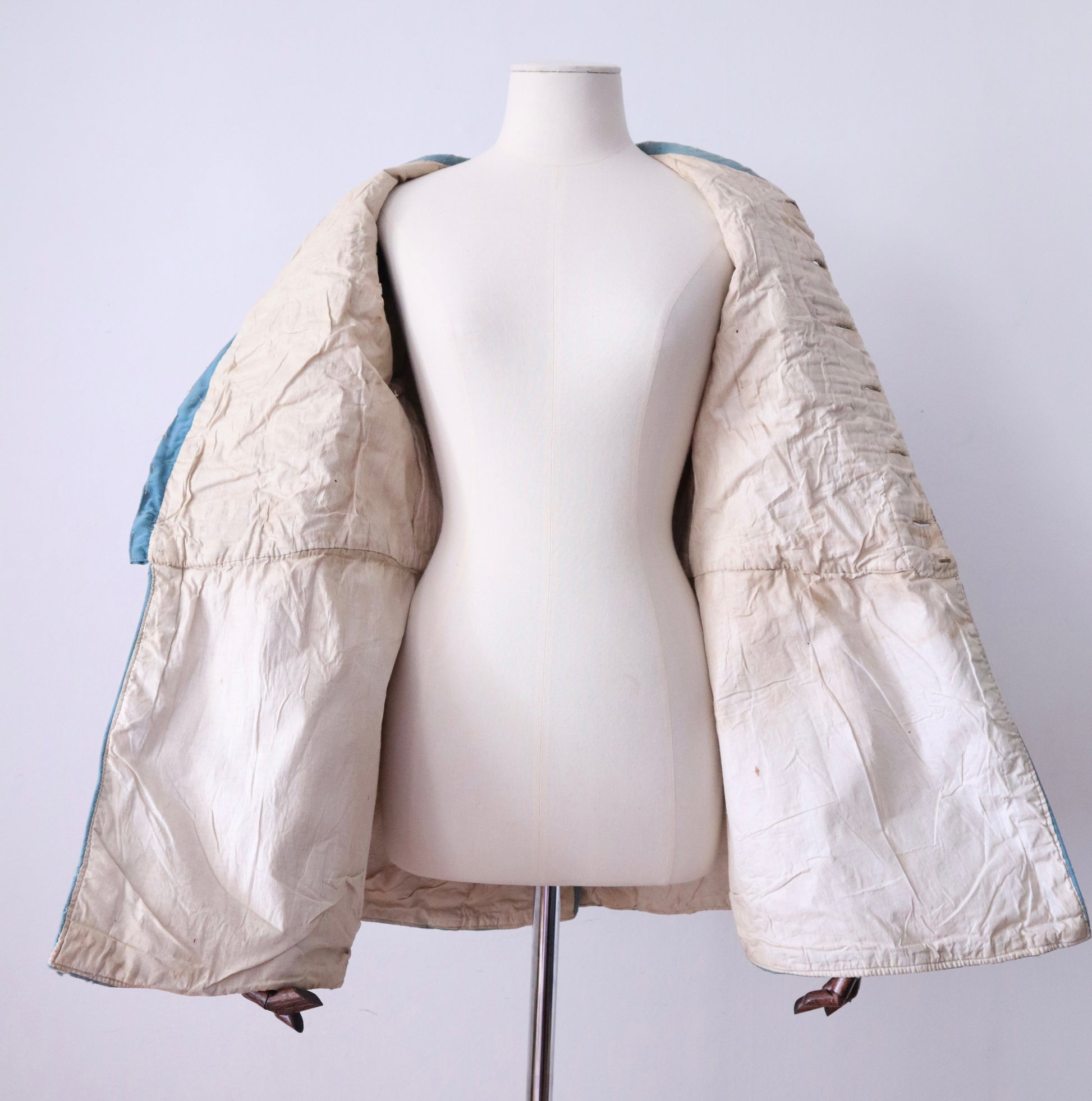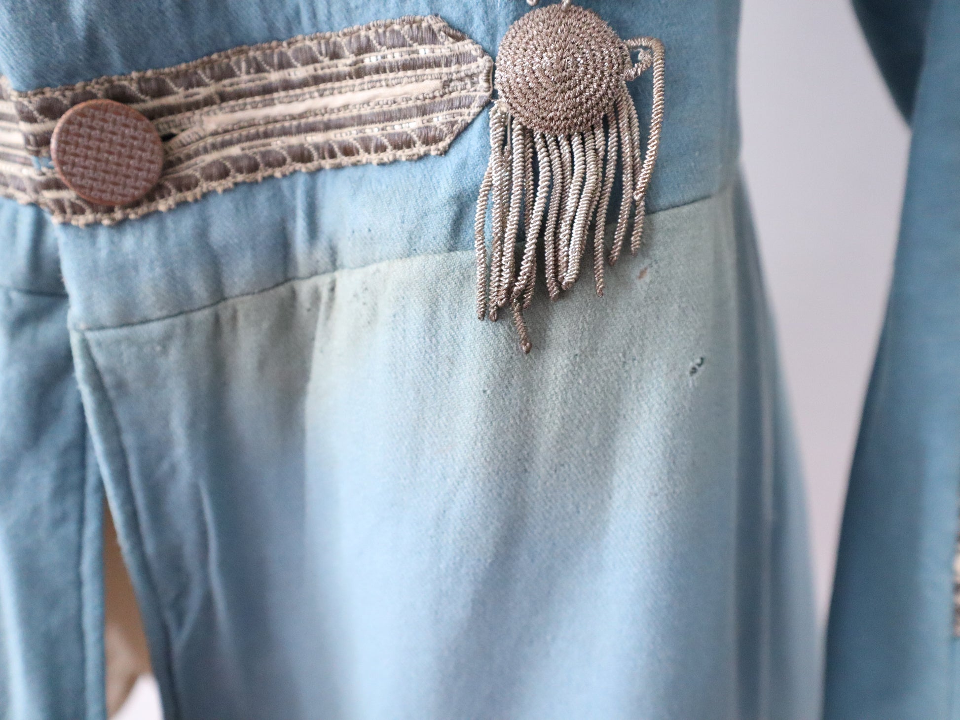 The outer fabric is a lightweight wool in powder blue. The interior is fully lined in cotton. Decoration includes silver-tone metallic passementerie: