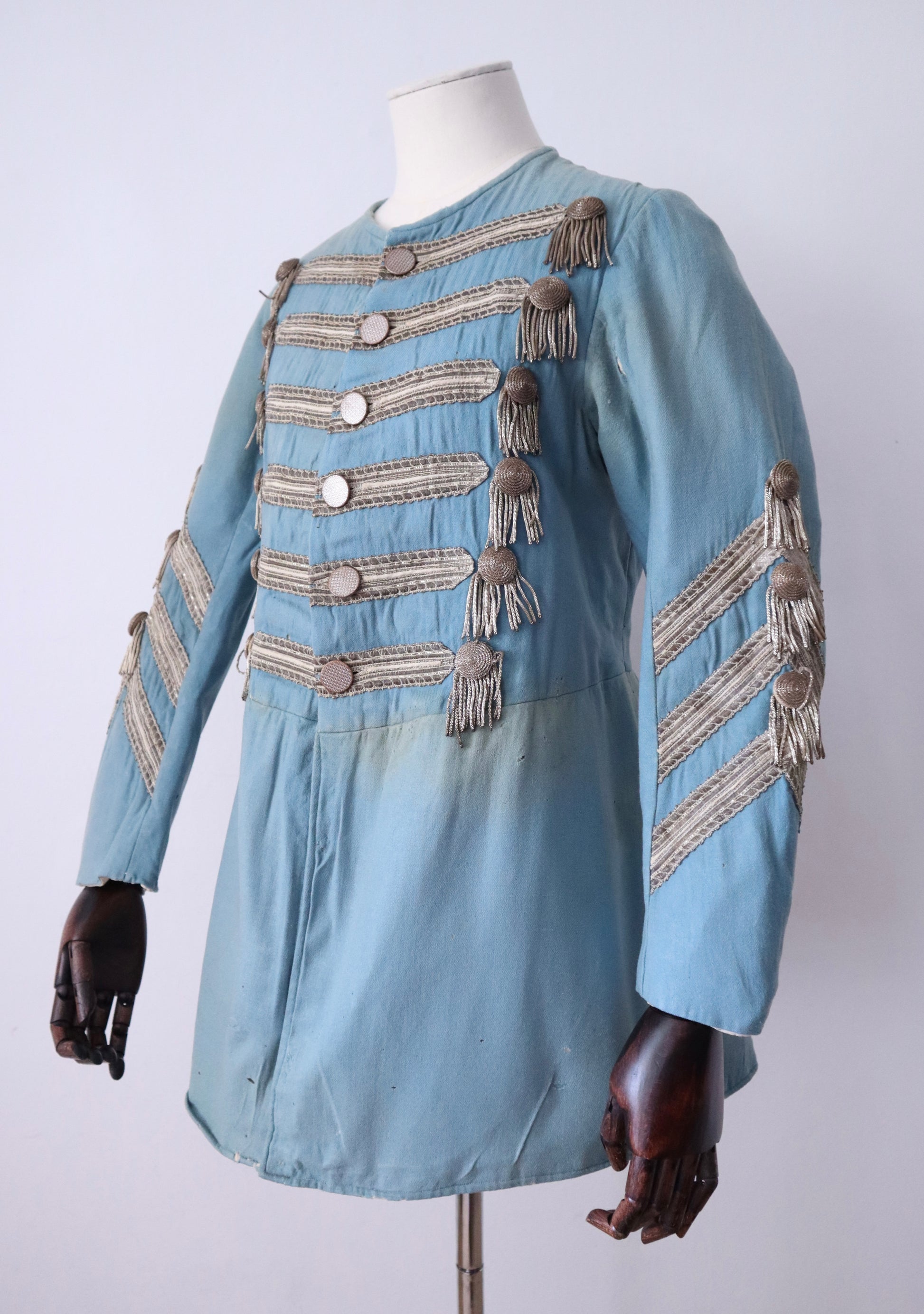 Antique 19th Century Theatrical Military-Style Jacket | Hand-Sewn Powder Blue Costume Coat Metal Ribbon Trim Tassels