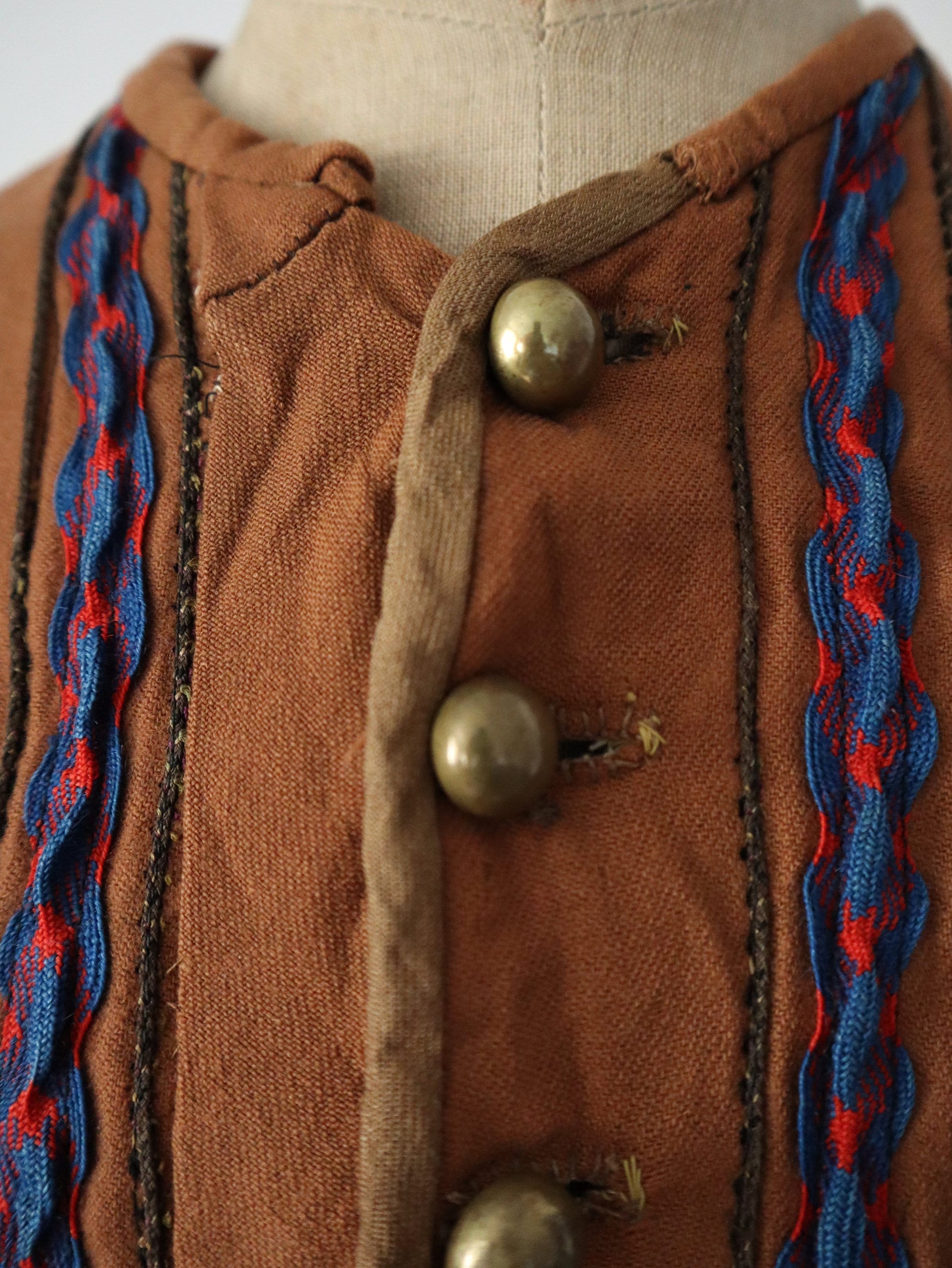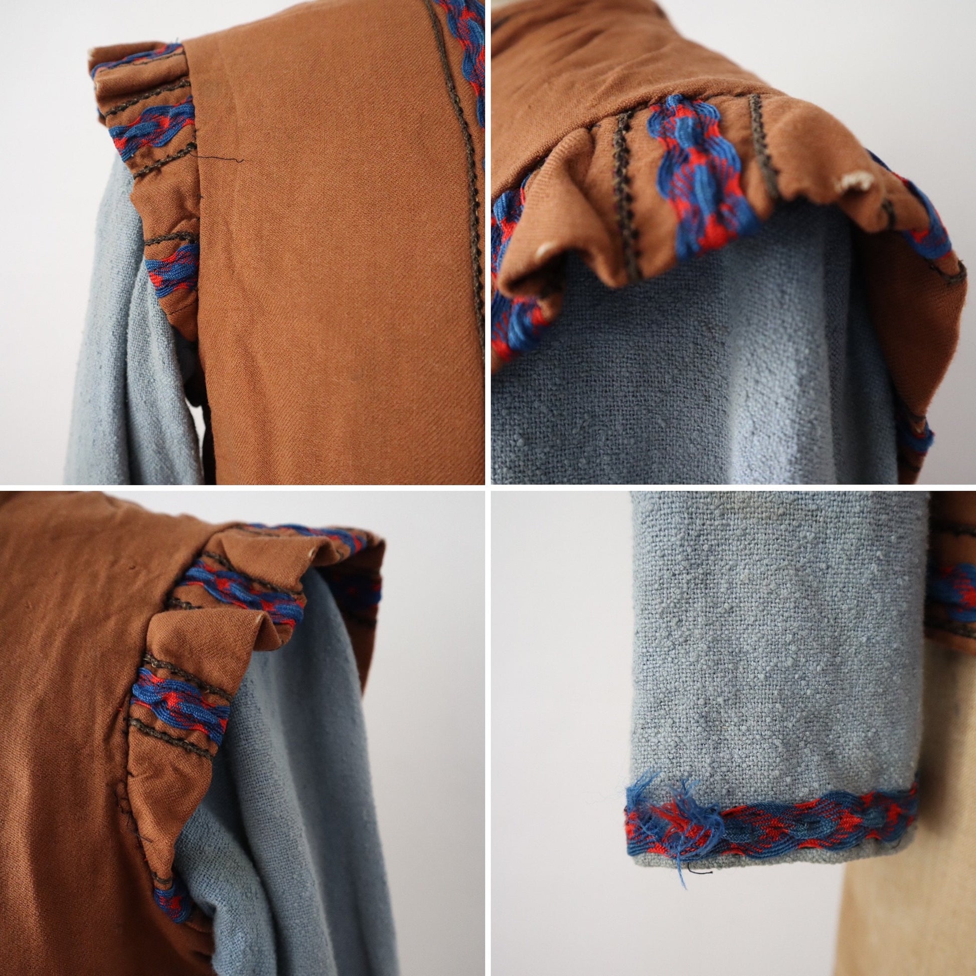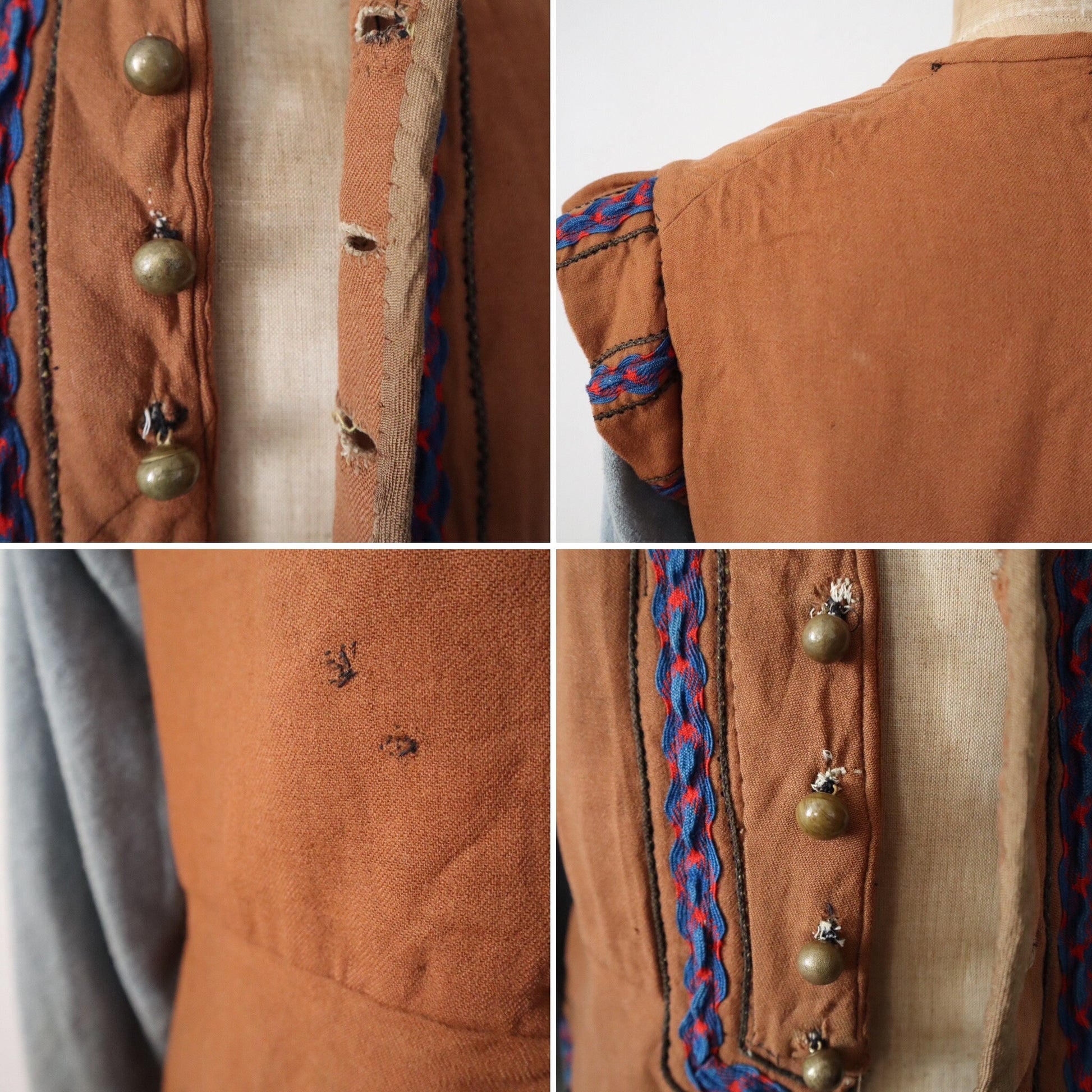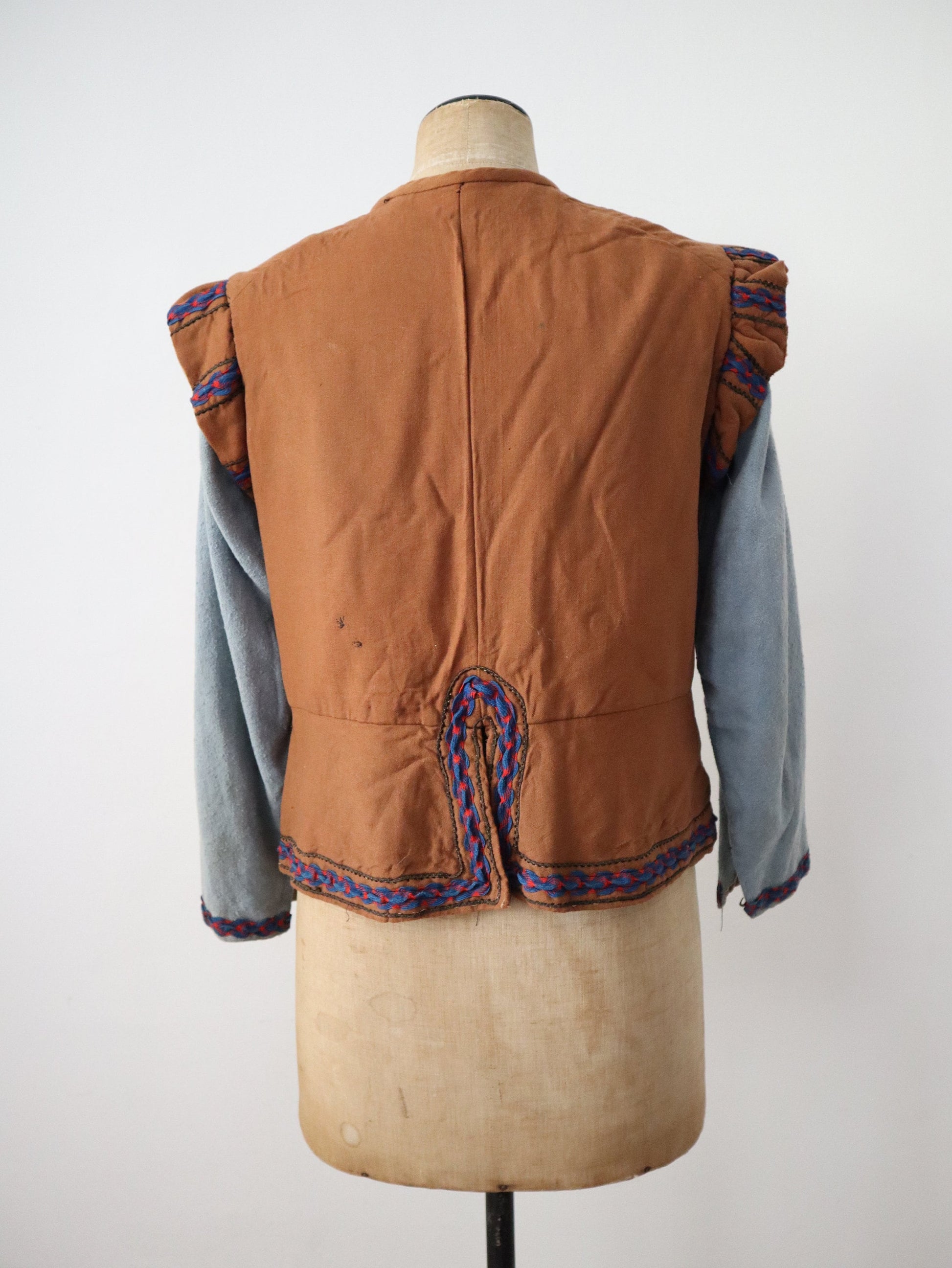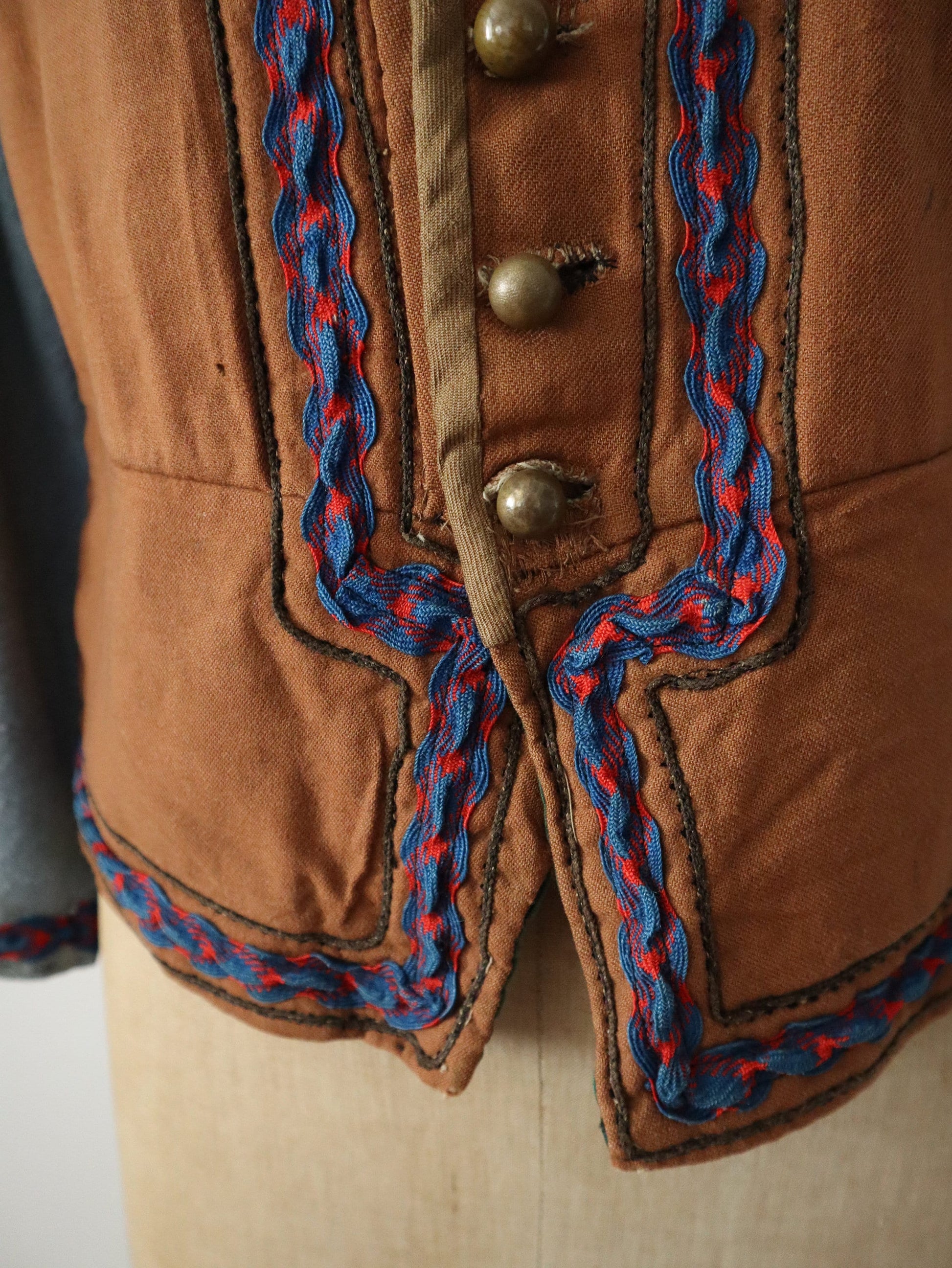 Antique French Theatre Costume Jacket Brown Cotton Blue Sleeves Ribbon Trim Brass Buttons