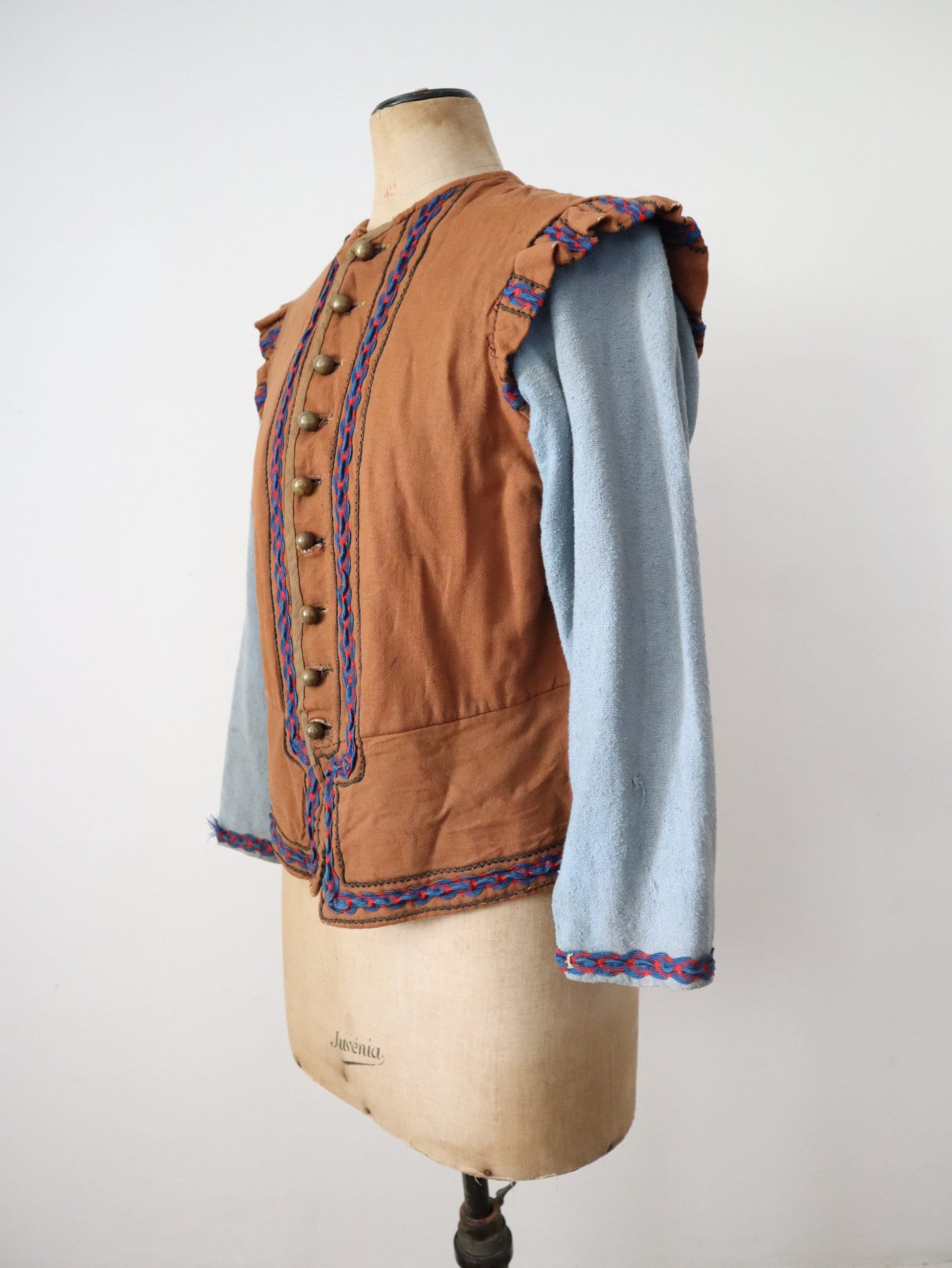 Early 1900s French theatre costume jacket. Brown cotton body with textured weave blue cotton sleeves. Lined in linen with costumier stamp and handwritten character/actor names. Round 19th century brass buttons. Blue and red ribbon trim.