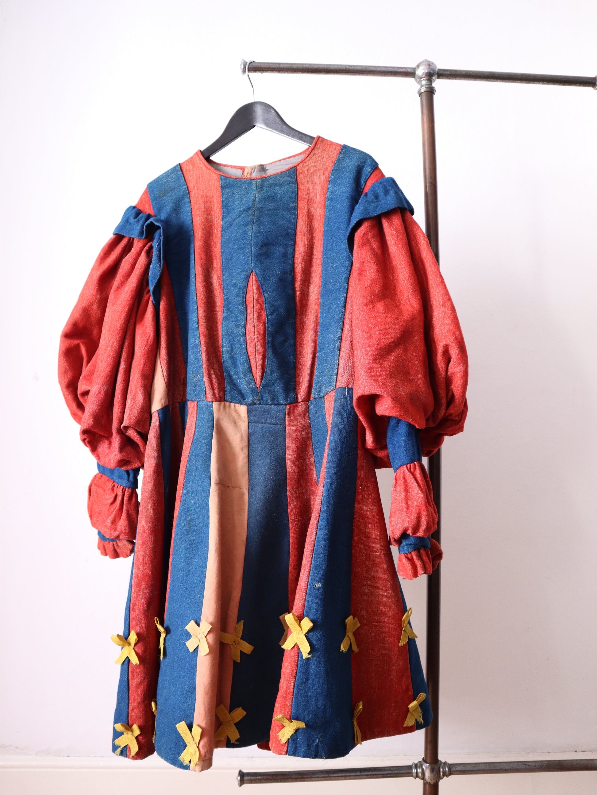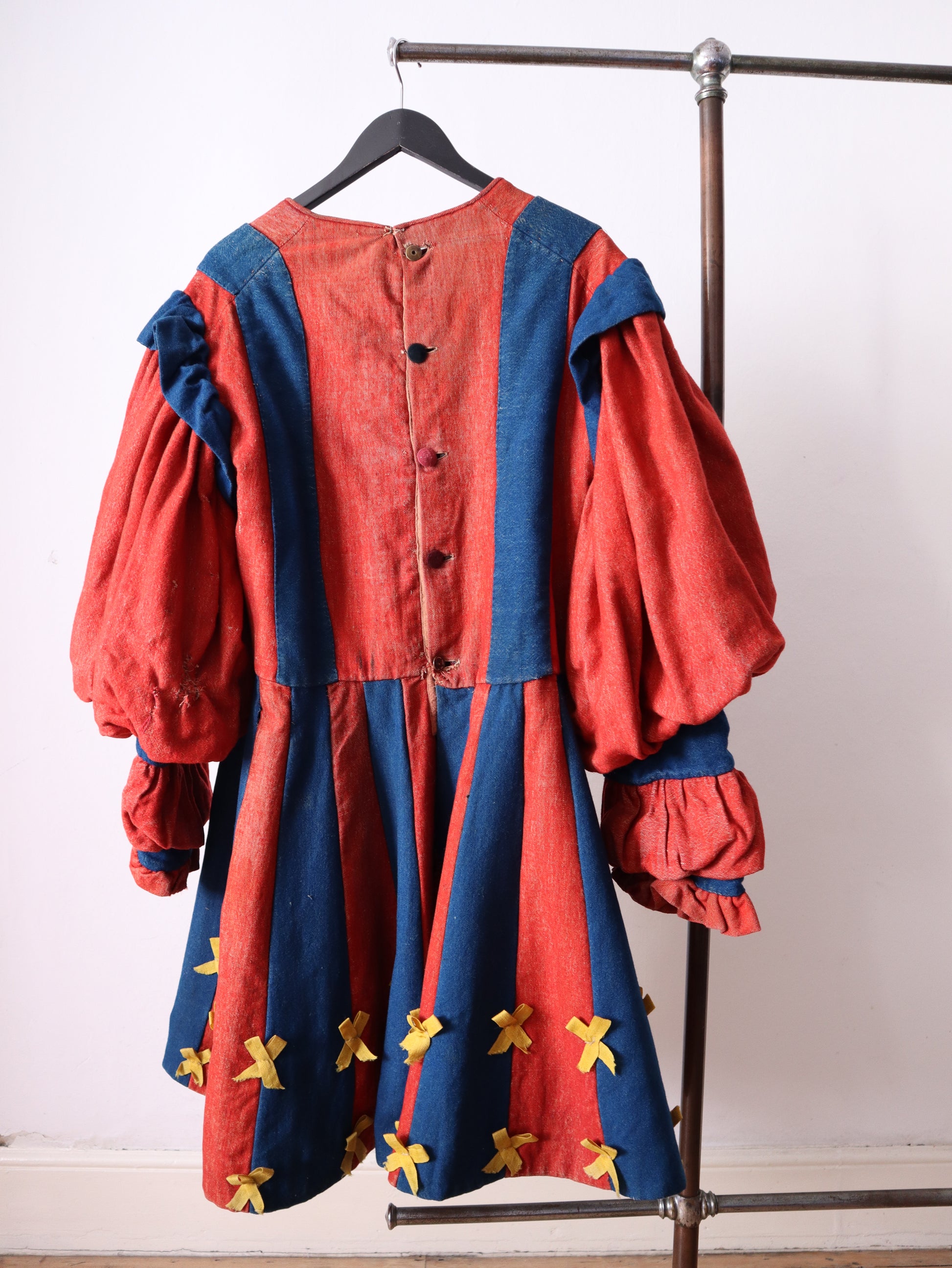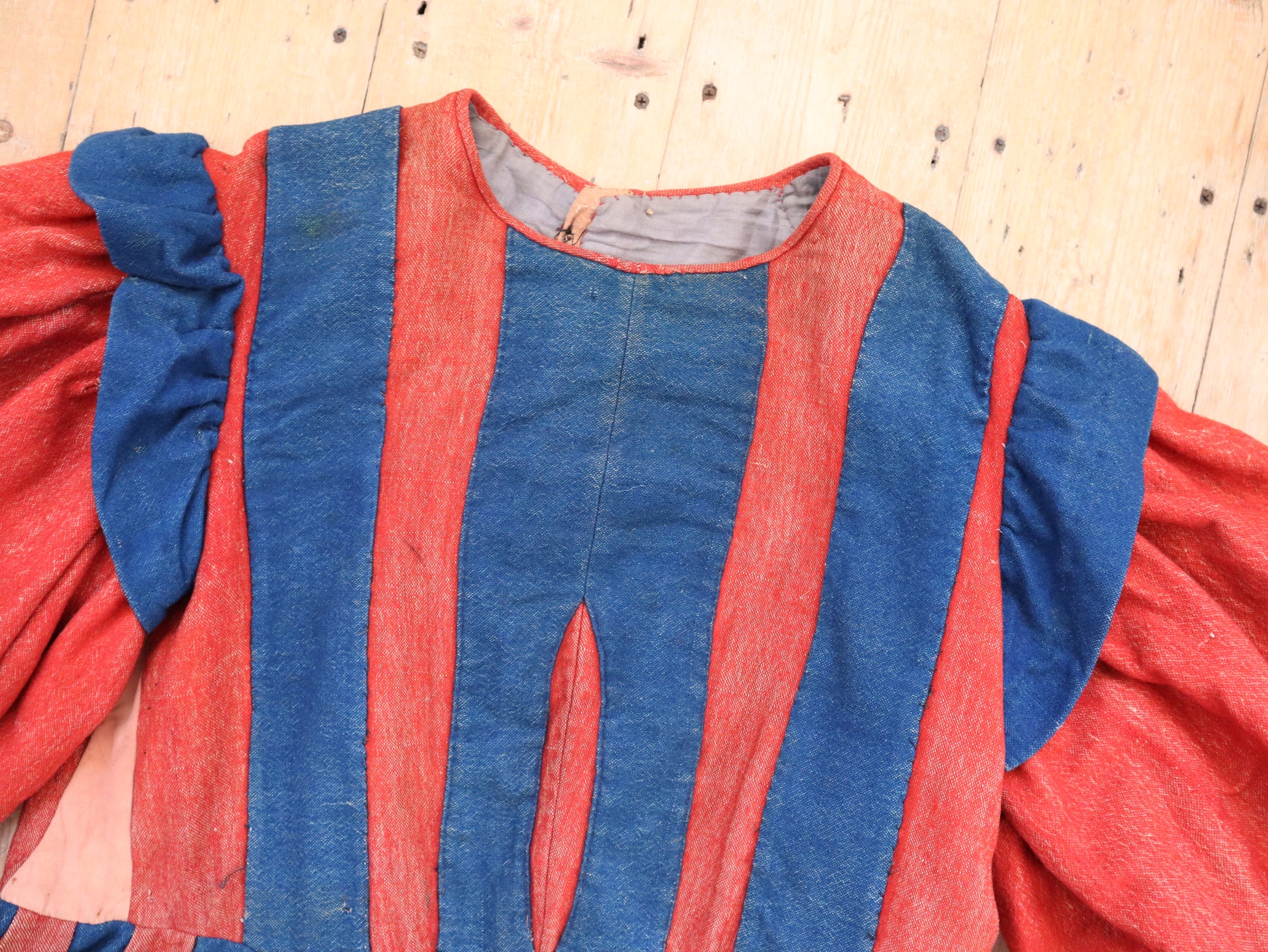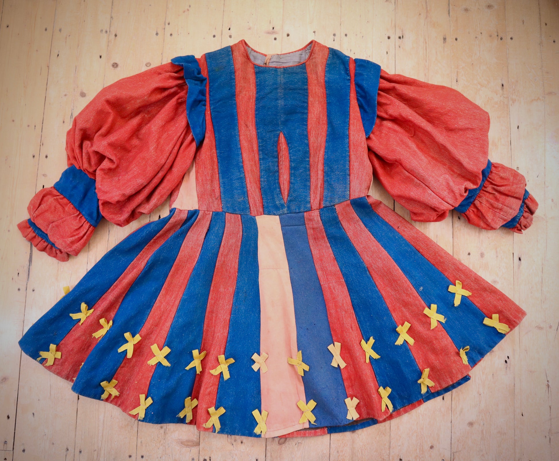 Antique French Theatre Costume Tunic Dress Renaissance Medieval Style Red Blue Stripes Yellow Bows Rare