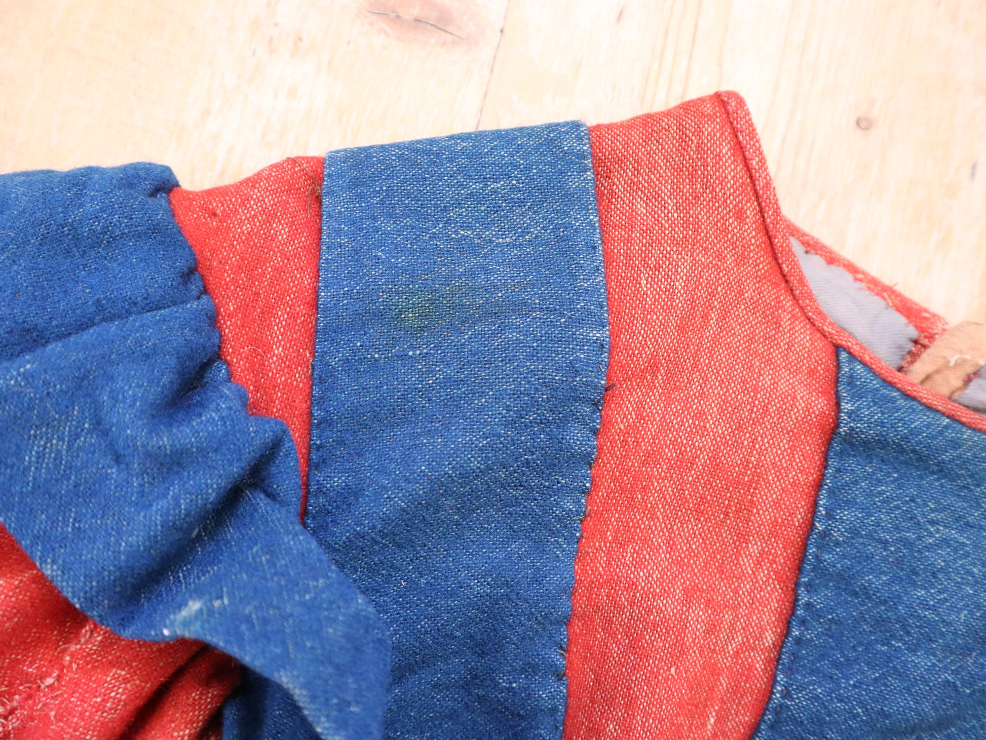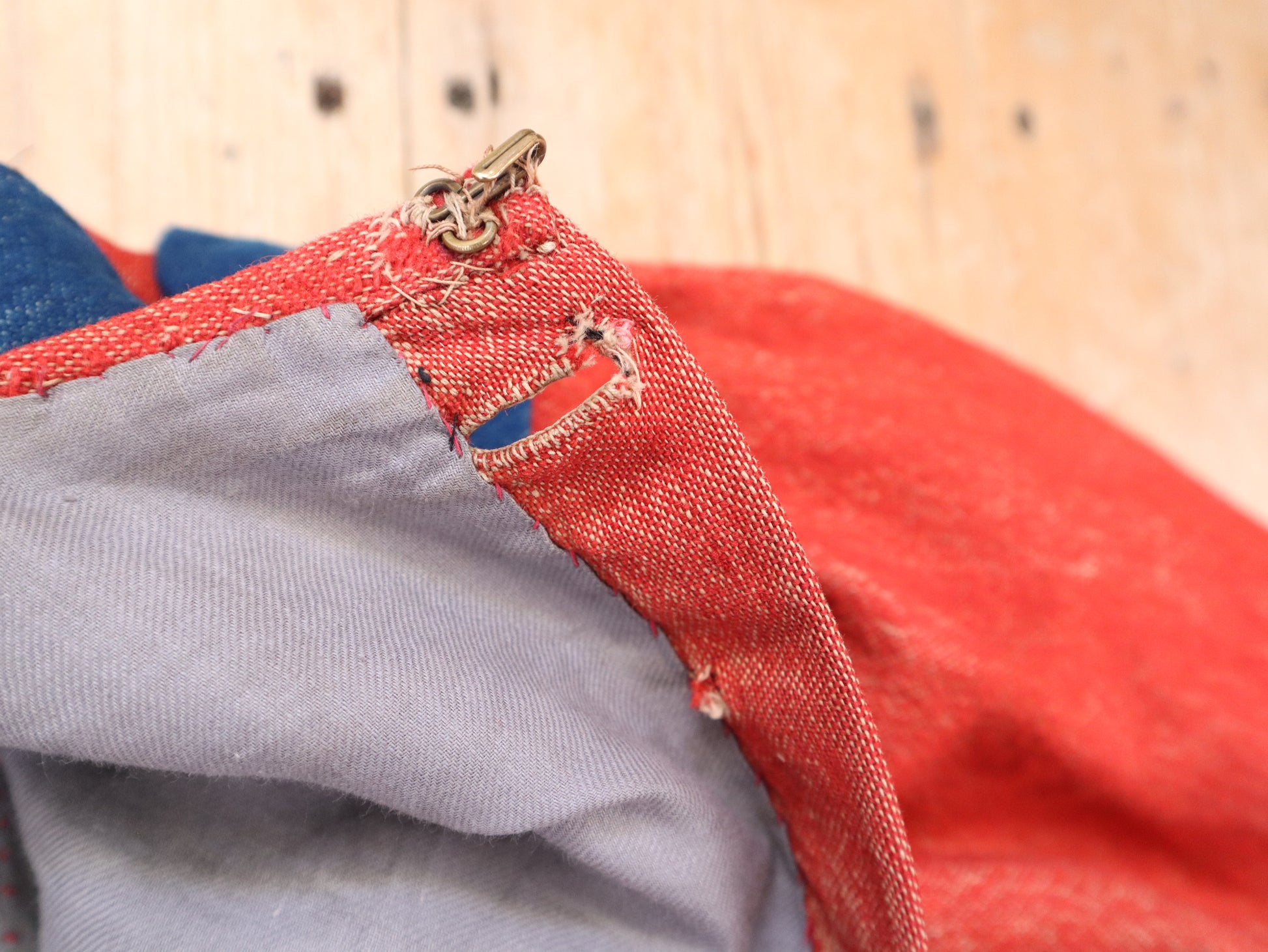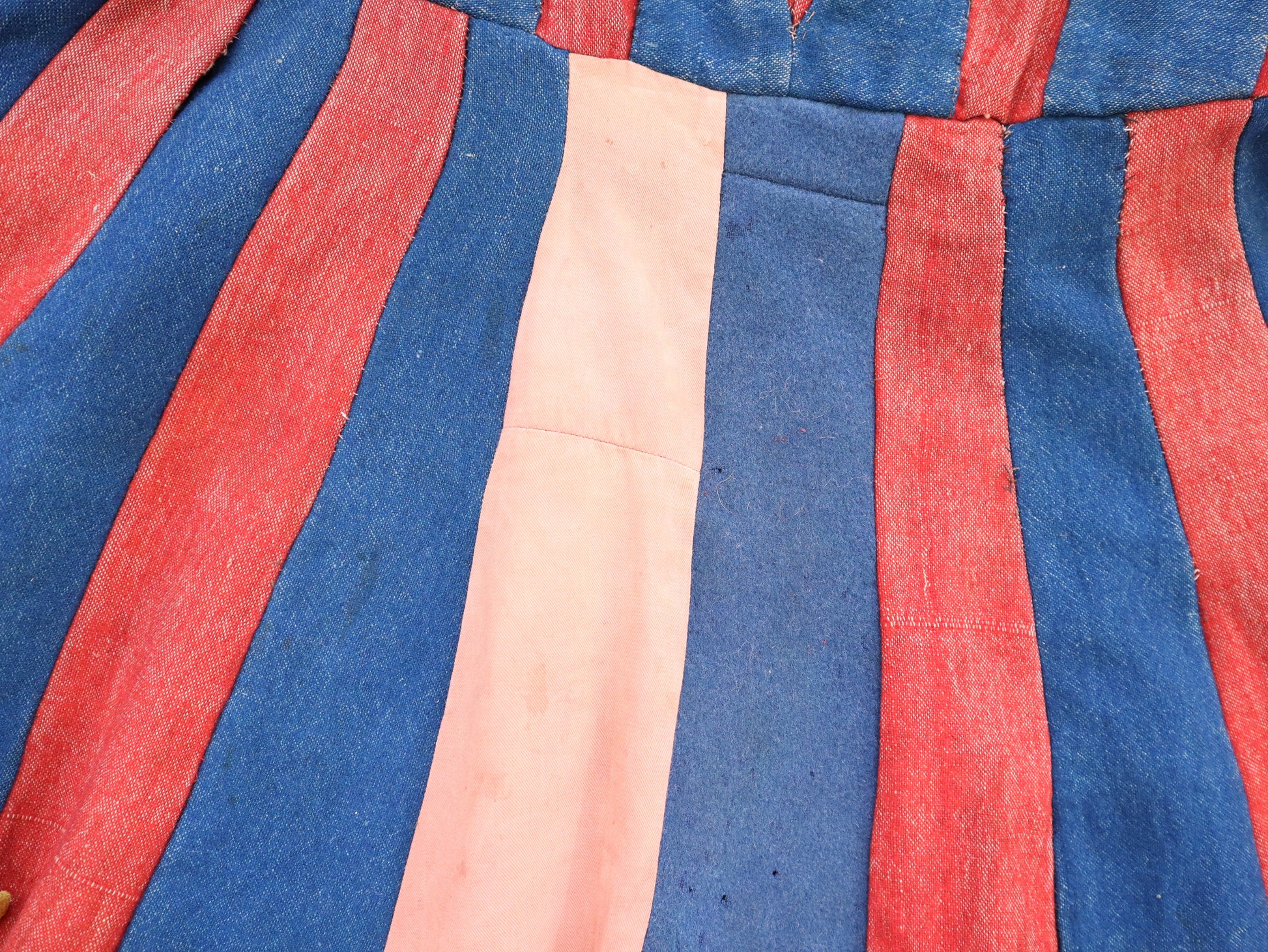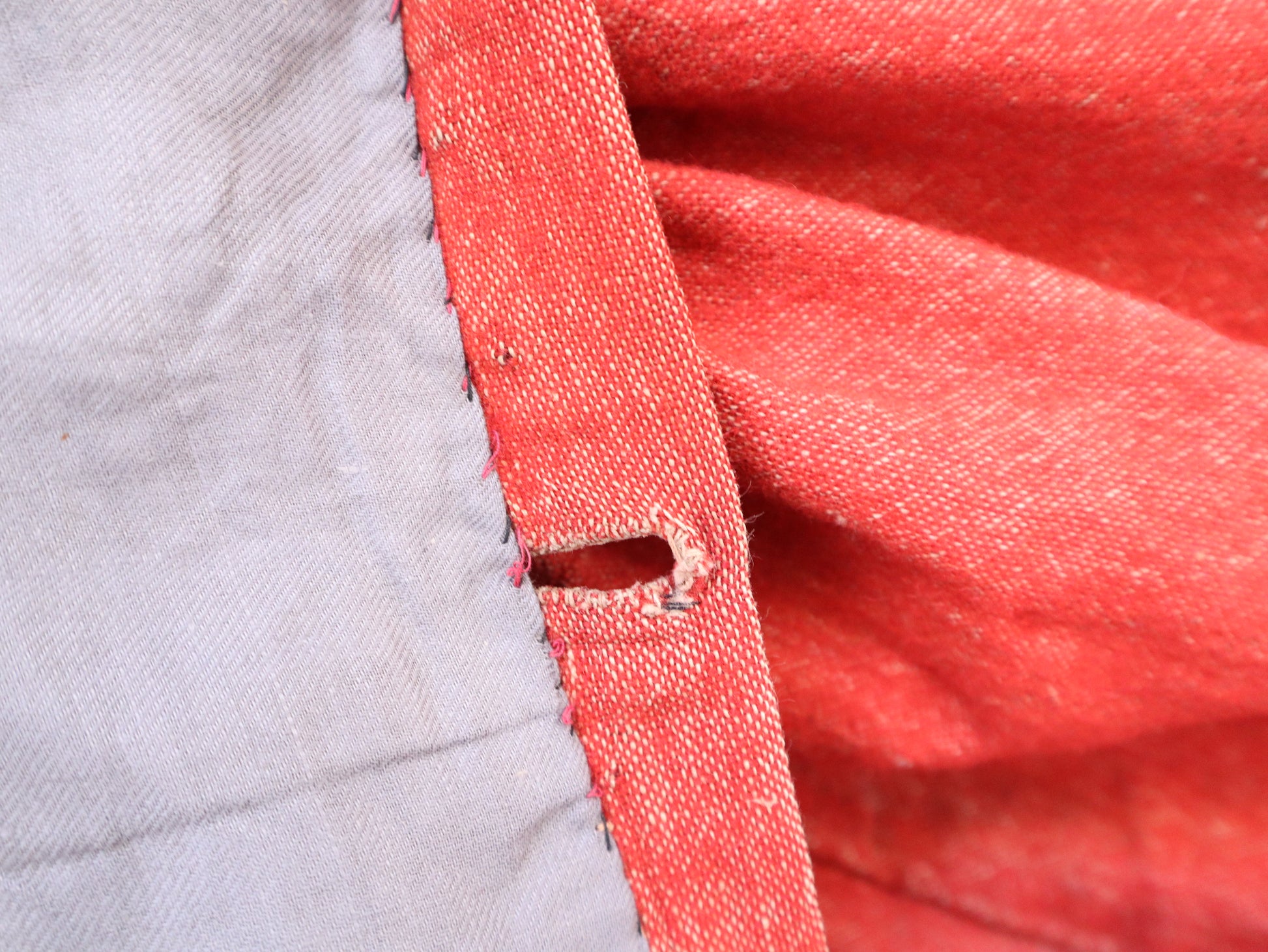 - Several skirt panels have been replaced with salmon pink cotton twill and one blue wool panel at front (with a few small moth holes)