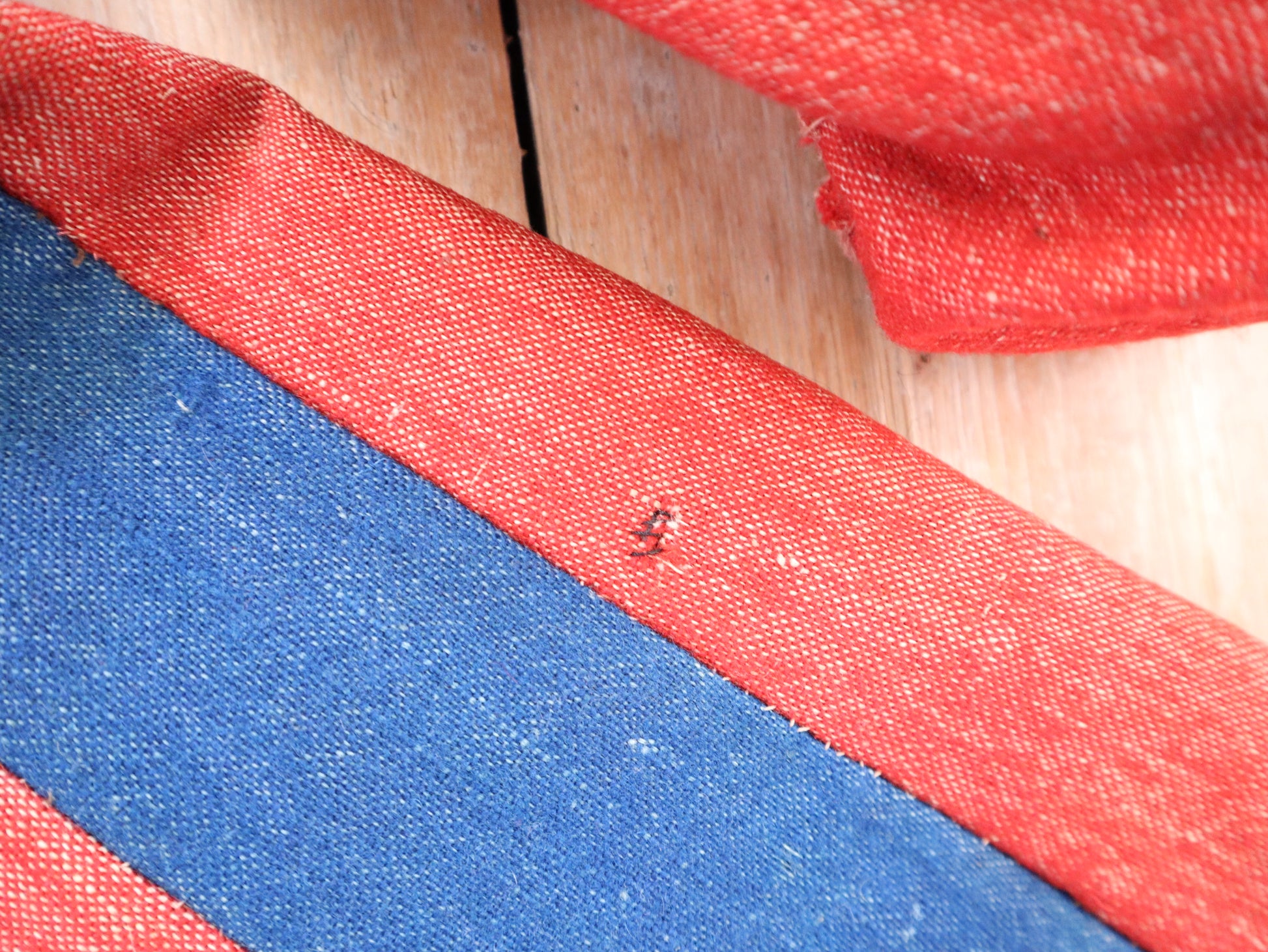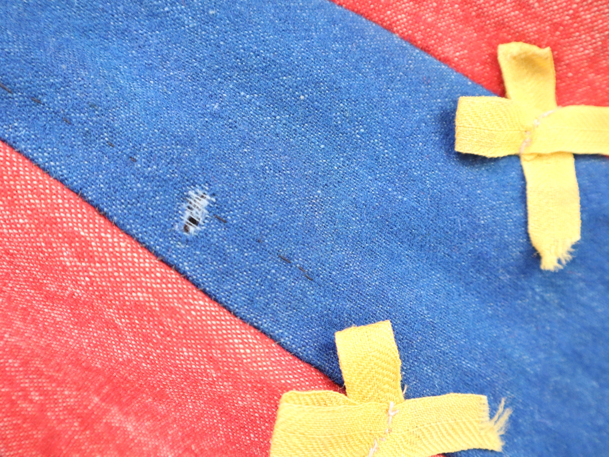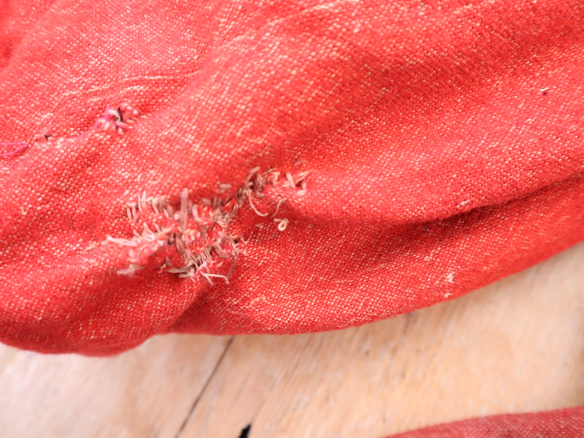 - Back opening below buttons has a stitched repair, some fraying, and a tear