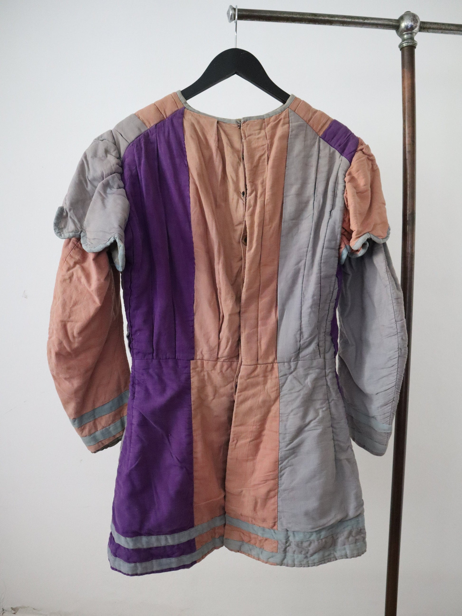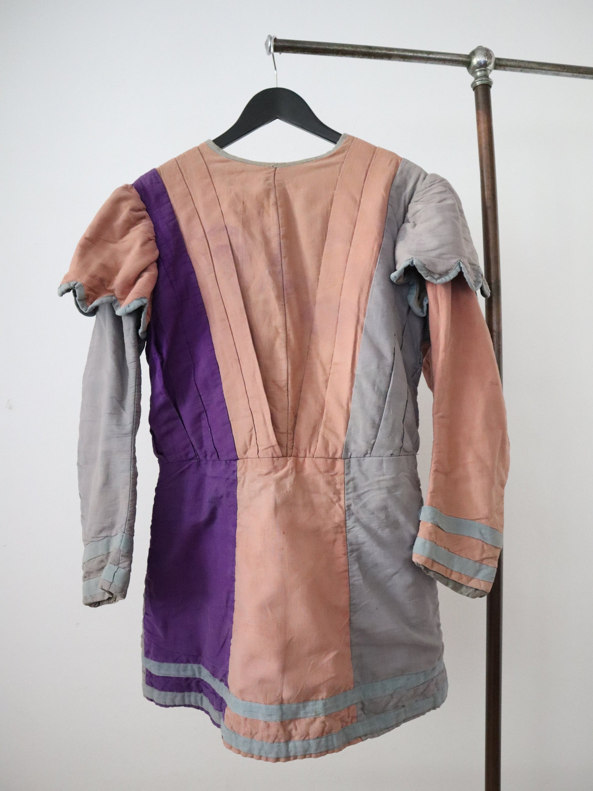 Antique French theatre costume tunic. Renaissance style: made by costumier Aristide Boyer, Marseille. Cotton twill in pink, Greta no purple panels: buttons up the back. Pleated chest and scalloped capped sleeves. Appears to have been all hand stitched.