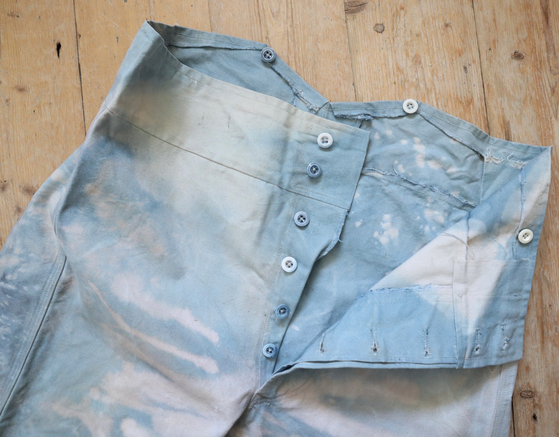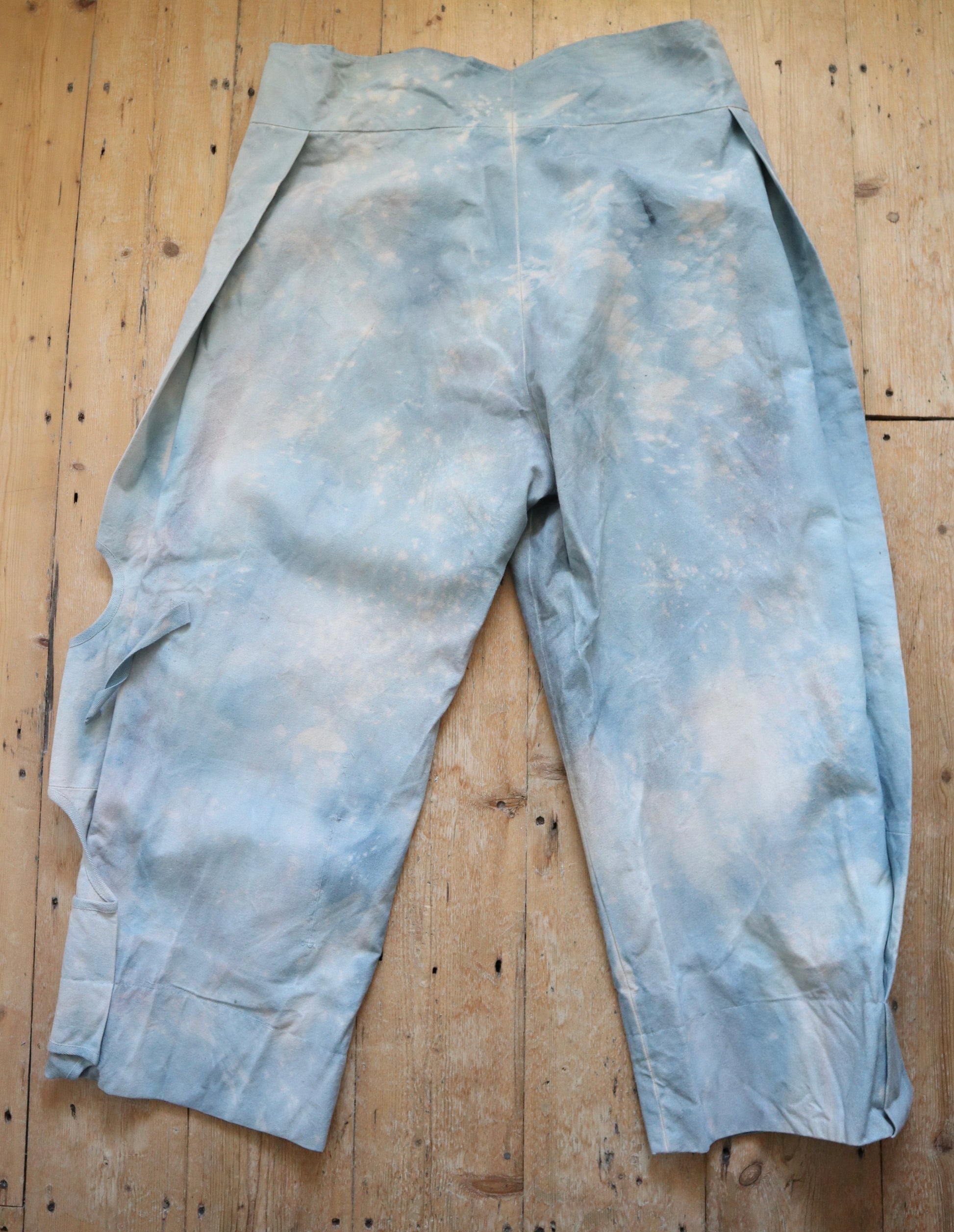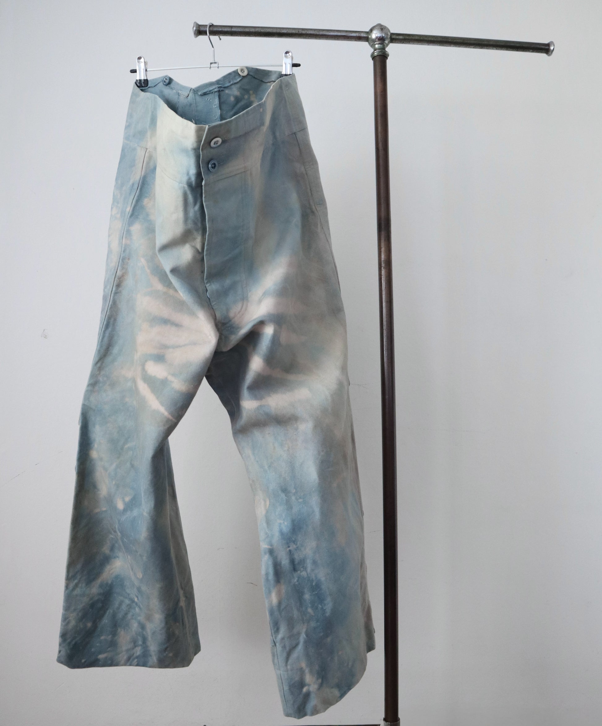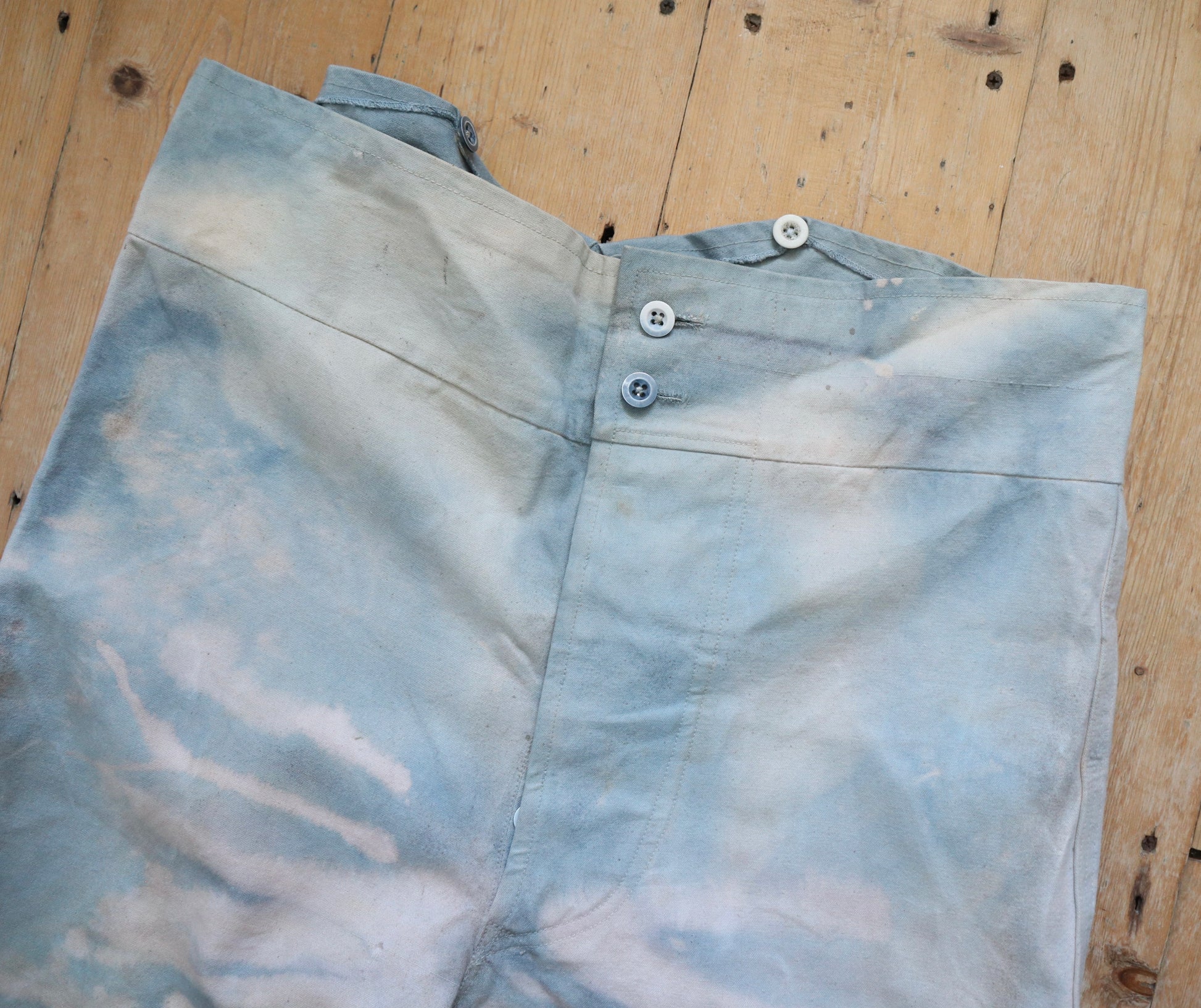 Wonderful worked patina on these cloud like blue cotton canvas trousers. Made for costume for the Royal Opera House, London. They are unusual in construction as the sides have been folded in and there are shaped sections with ribbon binding. The buttons are matching the cloud like patina.