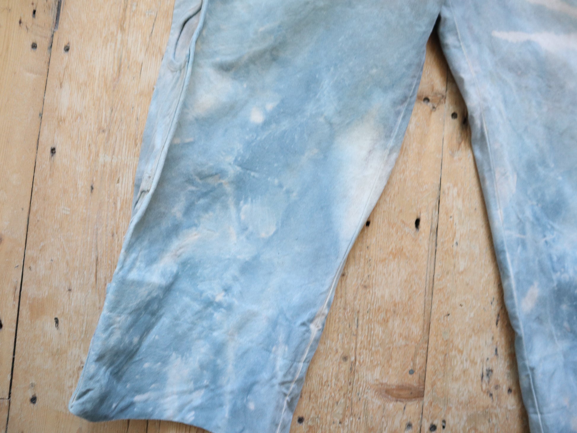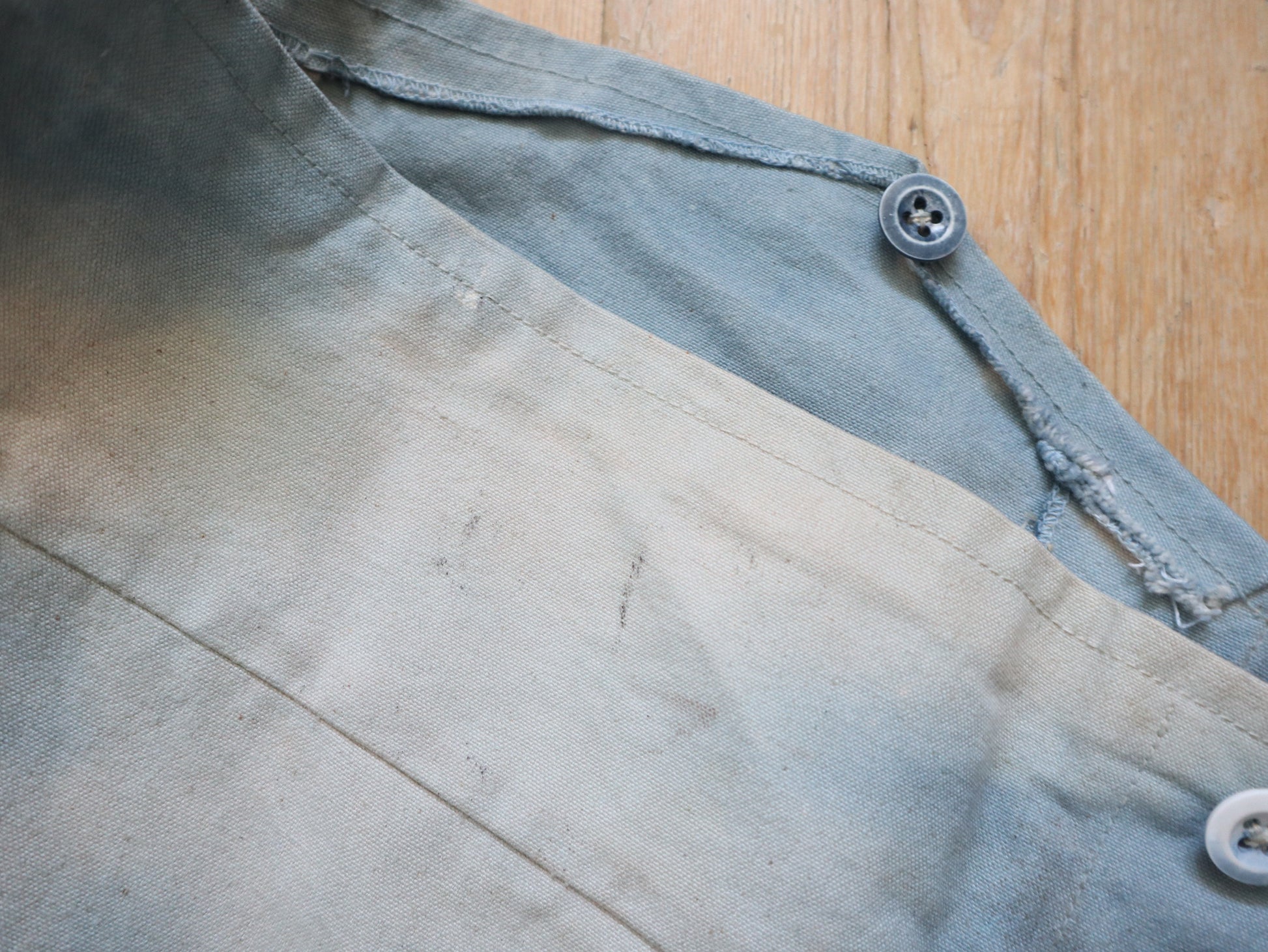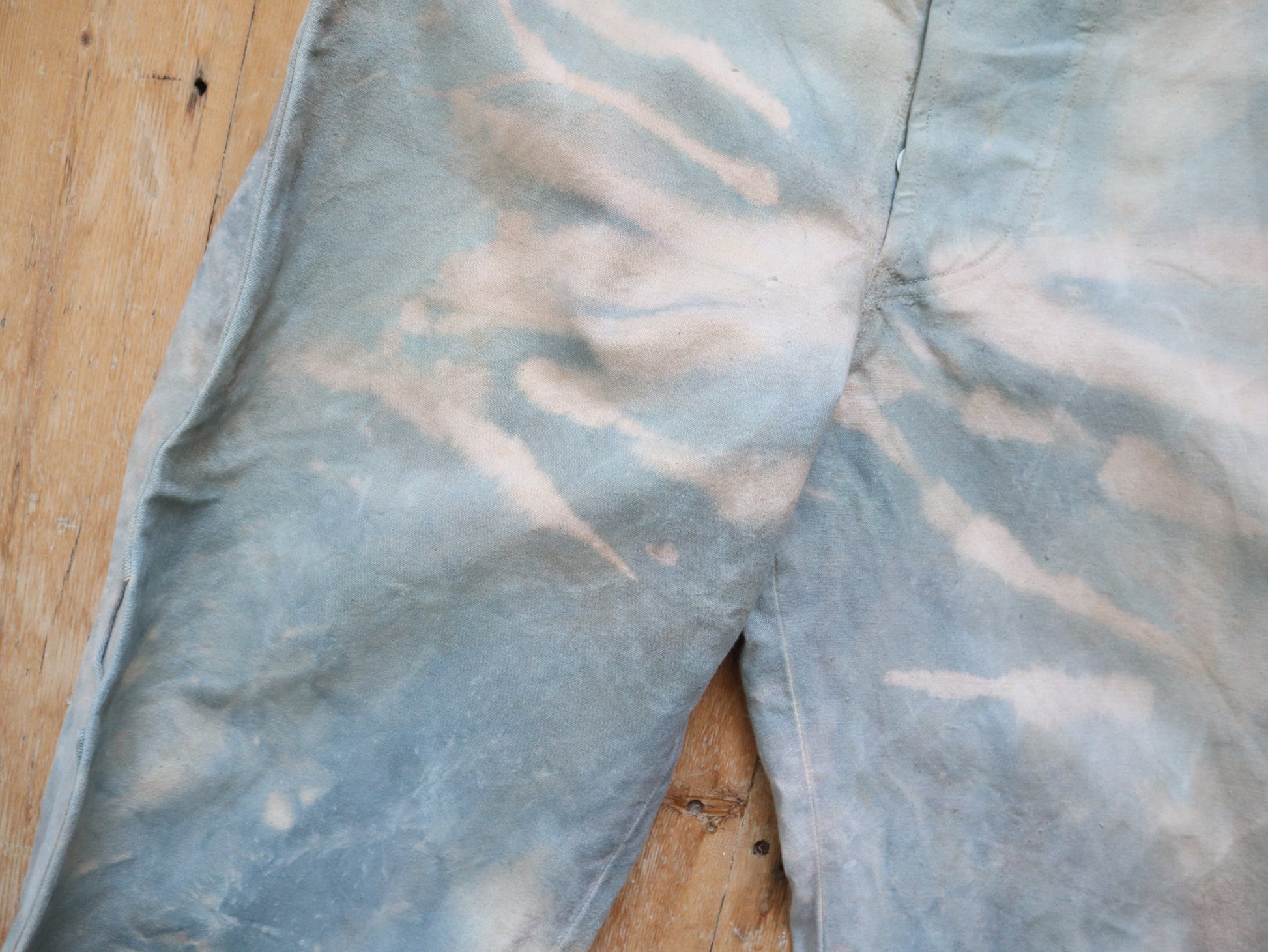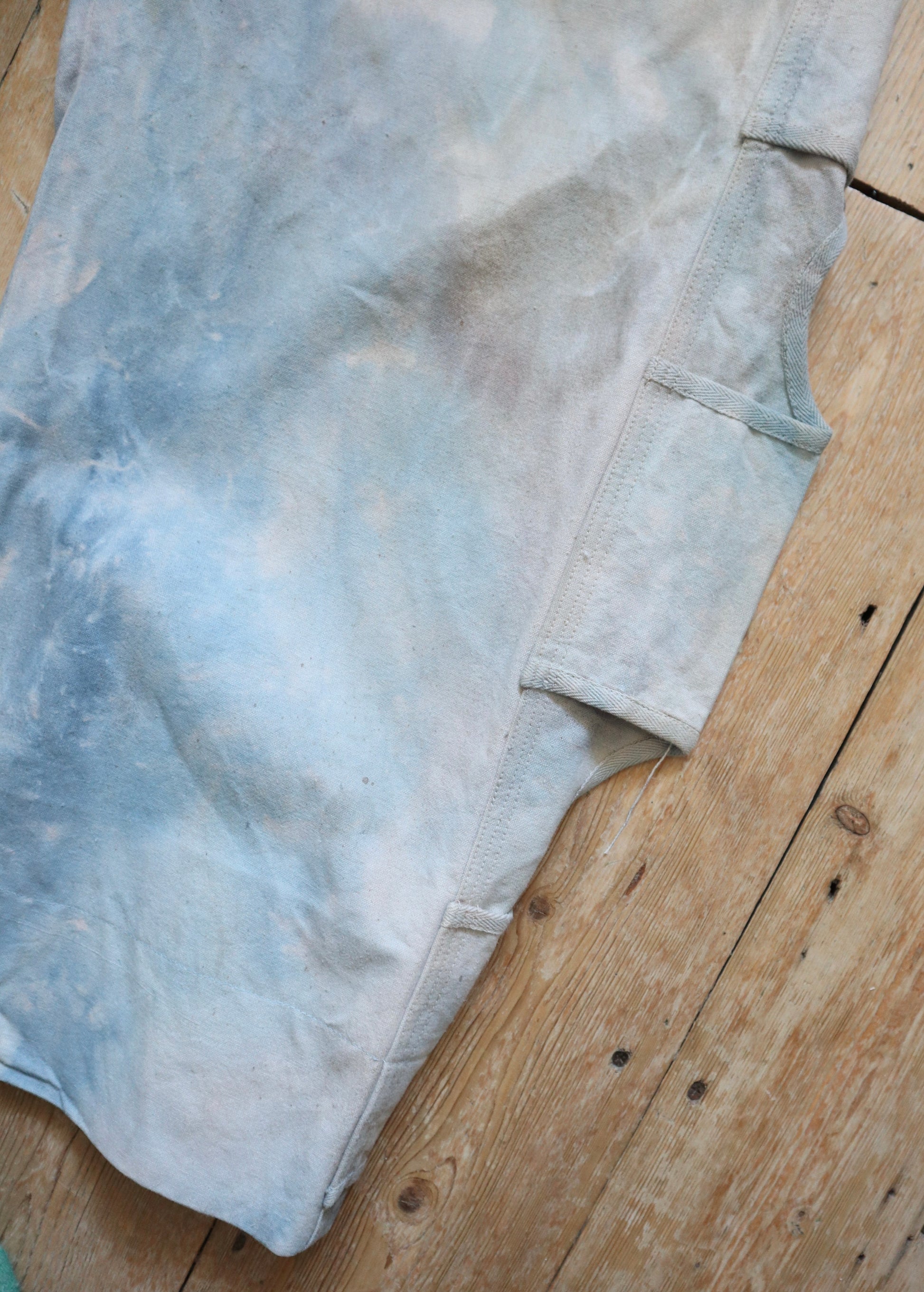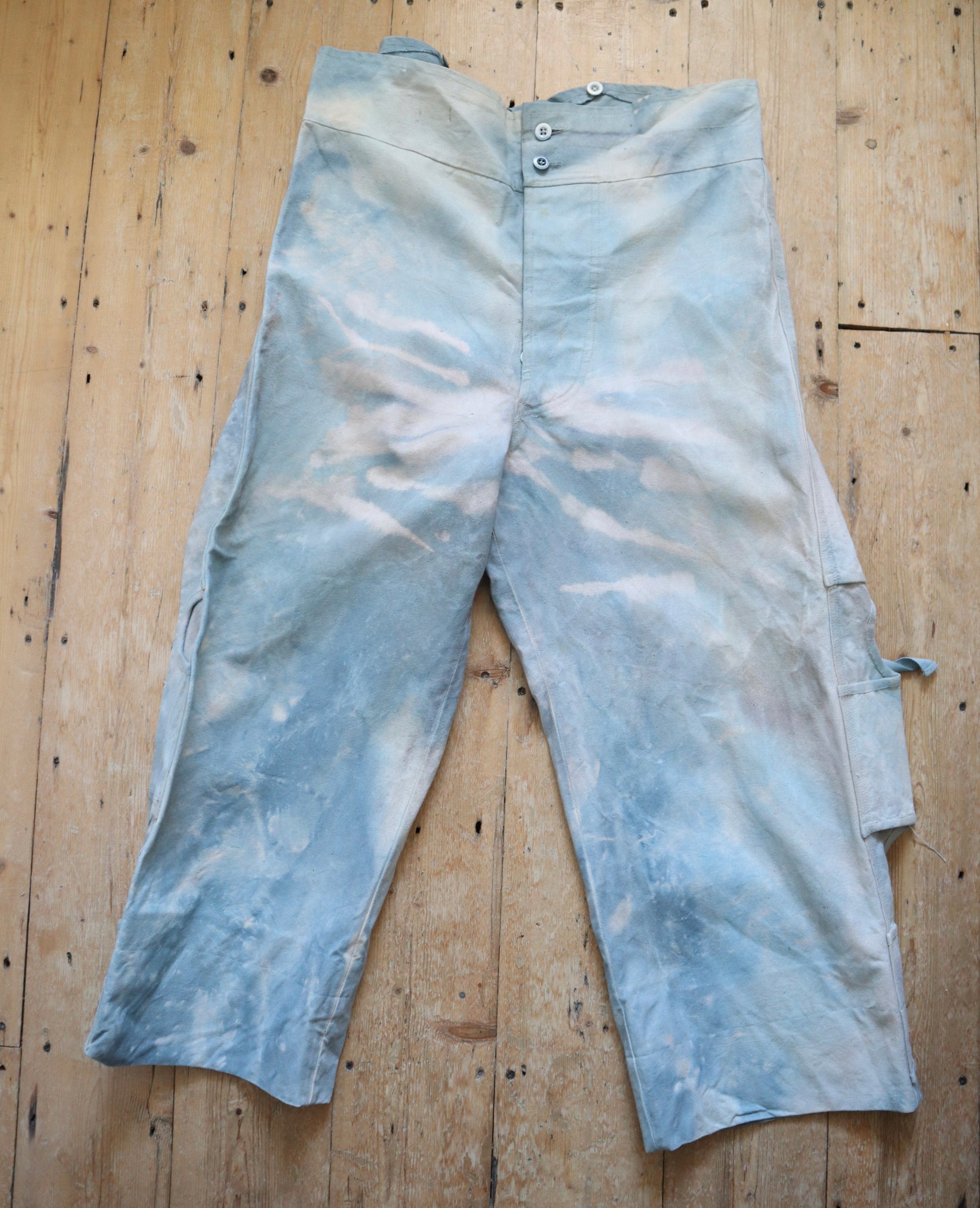 Wonderful worked patina on these cloud like blue cotton canvas trousers. Made for costume for the Royal Opera House, London. They are unusual in construction as the sides have been folded in and there are shaped sections with ribbon binding. The buttons are matching the cloud like patina.