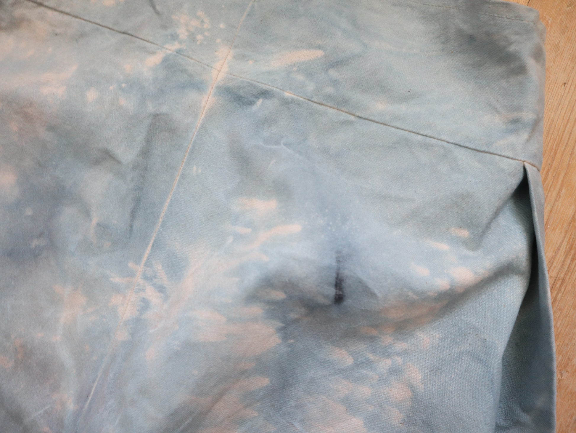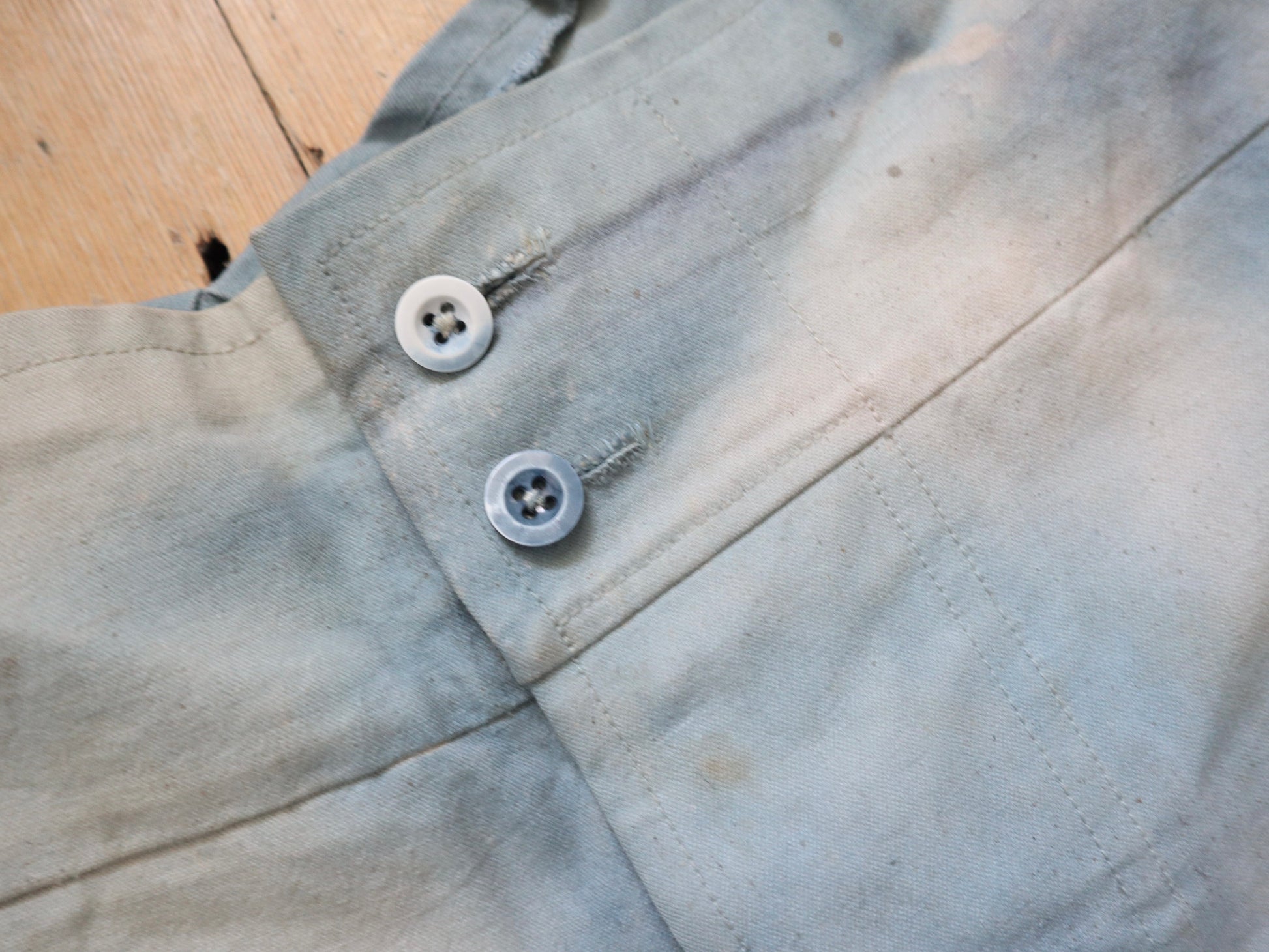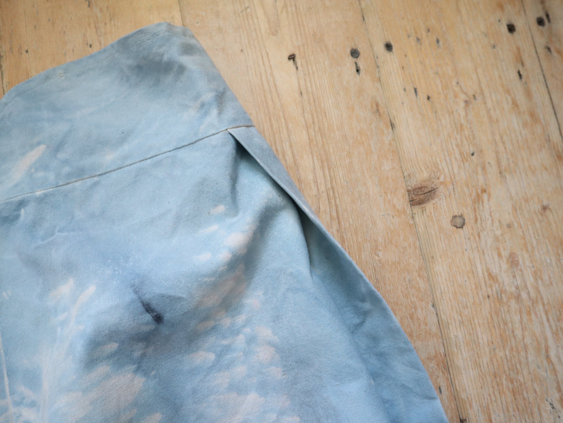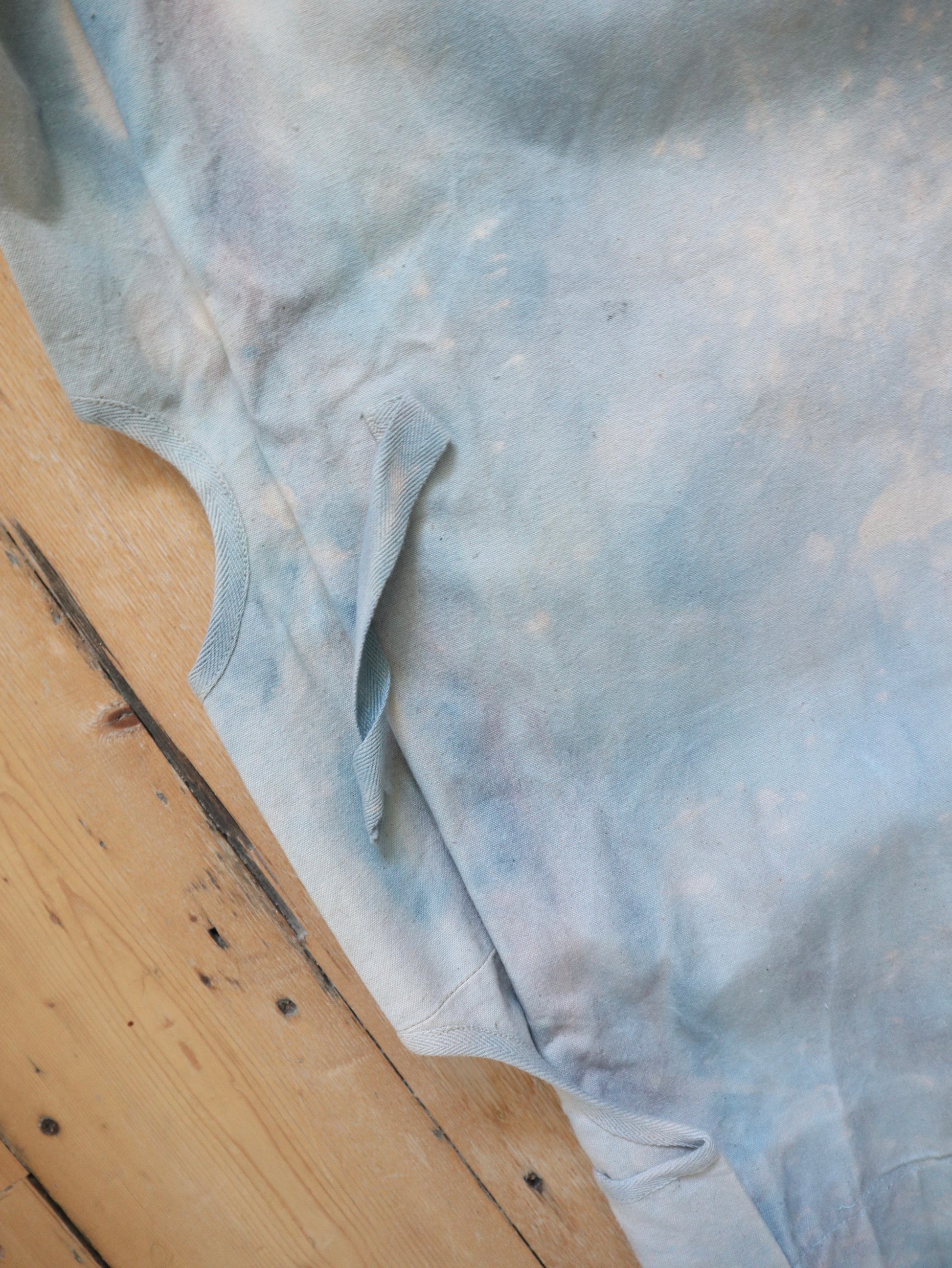 Wonderful worked patina on these cloud like blue cotton canvas trousers. Made for costume for the Royal Opera House, London. They are unusual in construction as the sides have been folded in and there are shaped sections with ribbon binding. The buttons are matching the cloud like patina.