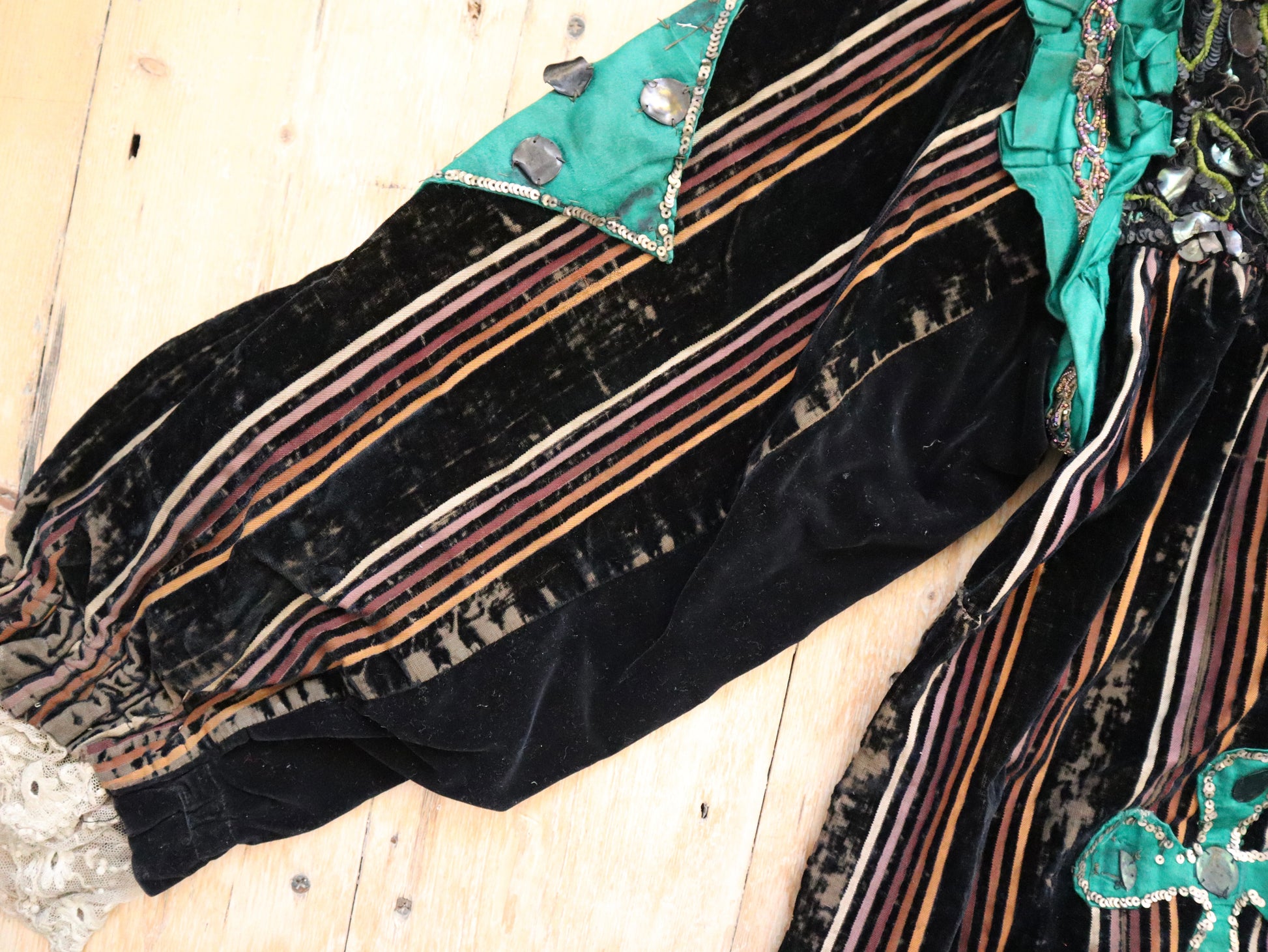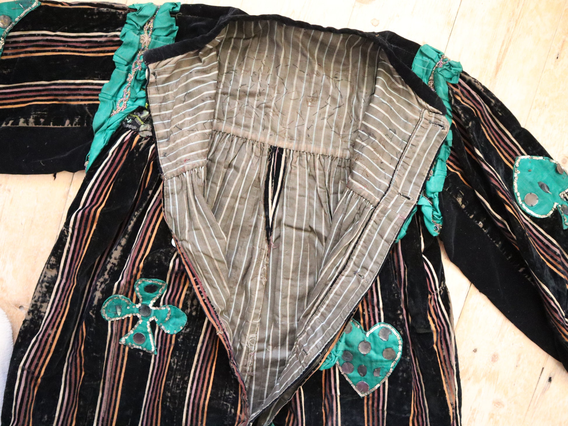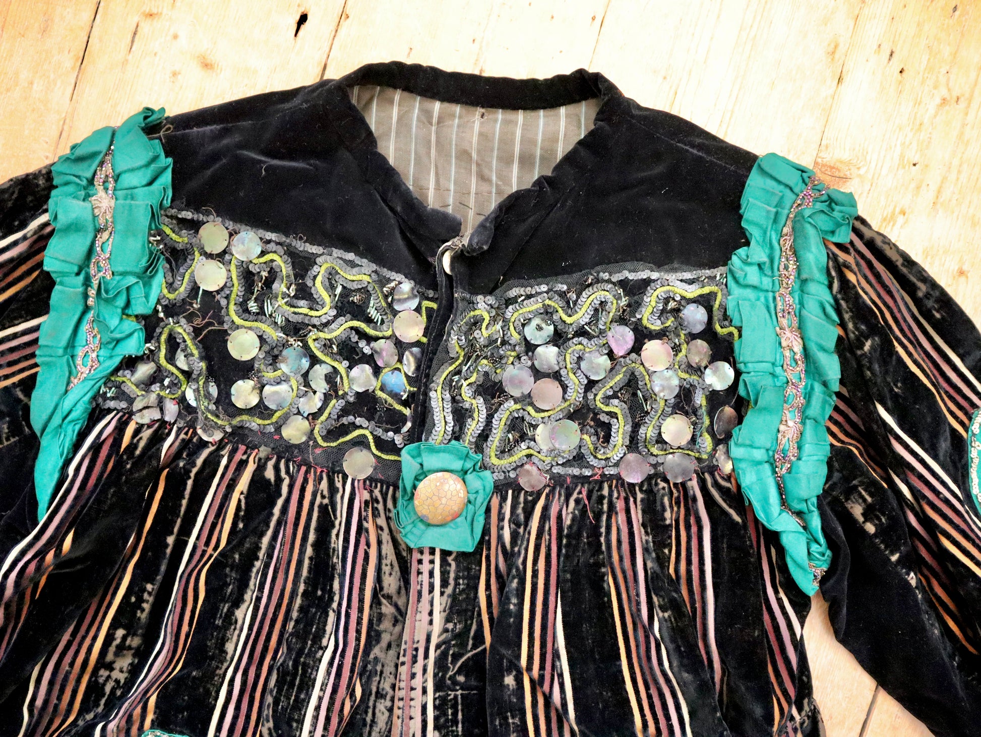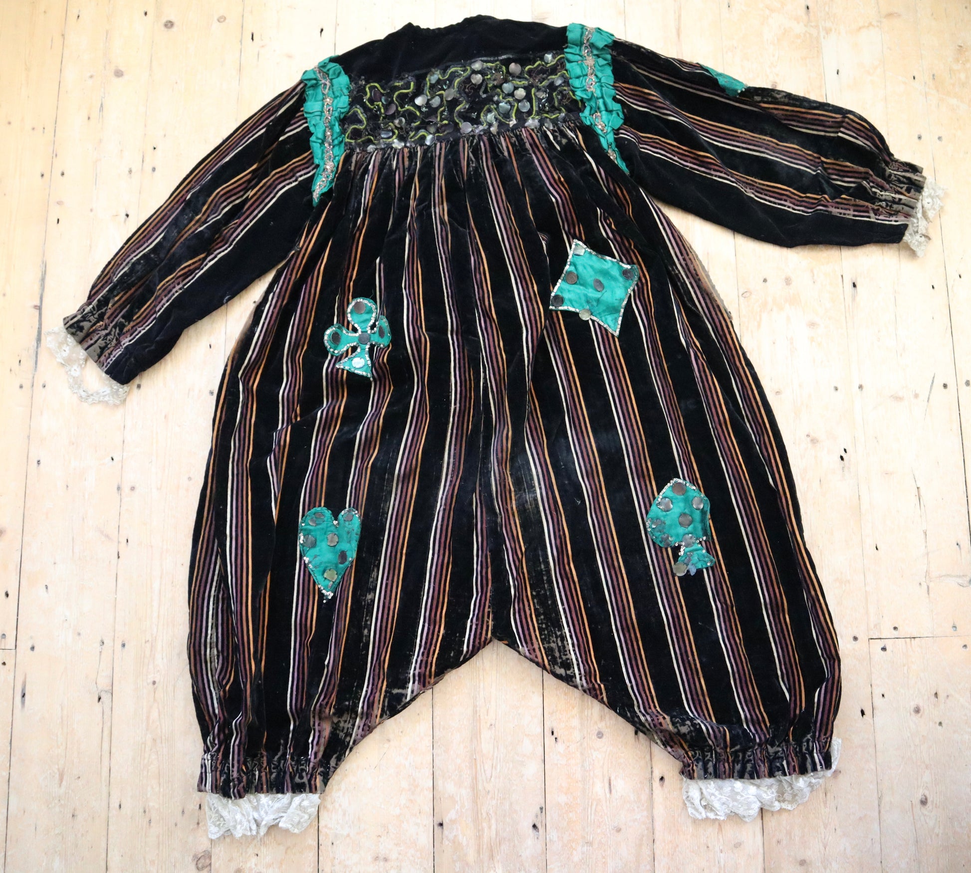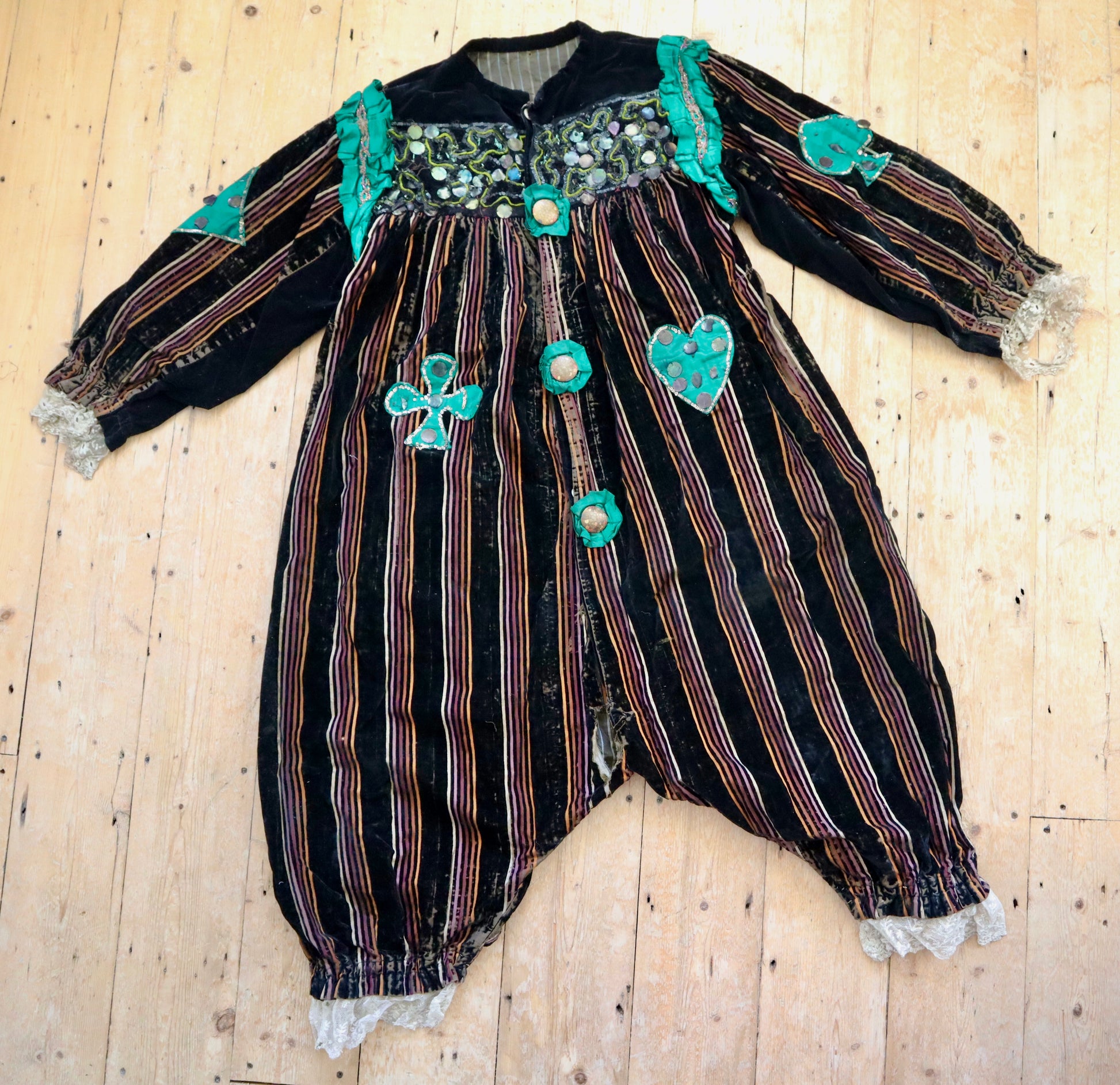 This extraordinary silk clown costume dates back to the 1910s–1920s and is a rare piece of wearable history. Hand-stitched from brown striped silk velvet, it’s lined with striped cotton and adorned with appliqué playing card motifs. Rich green silk ruffles and green and silver sequins embellish the suit, with beaded shoulder trim adding to its character. The buttons are brass with vibrant enamel painting, and it fastens with hidden buttons underneath. Slit openings at the sides (unlined) hint at pocket-style details. Lace trim finishes off the cuffs.
