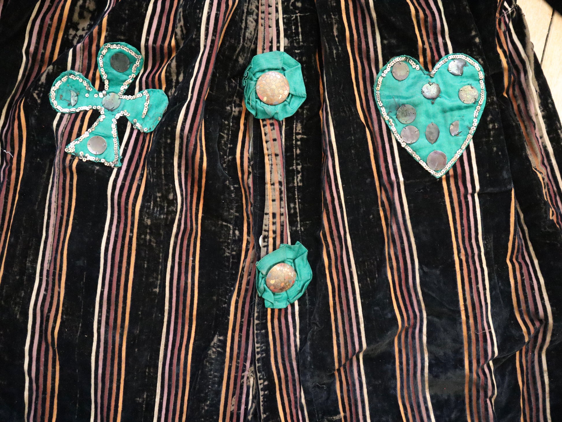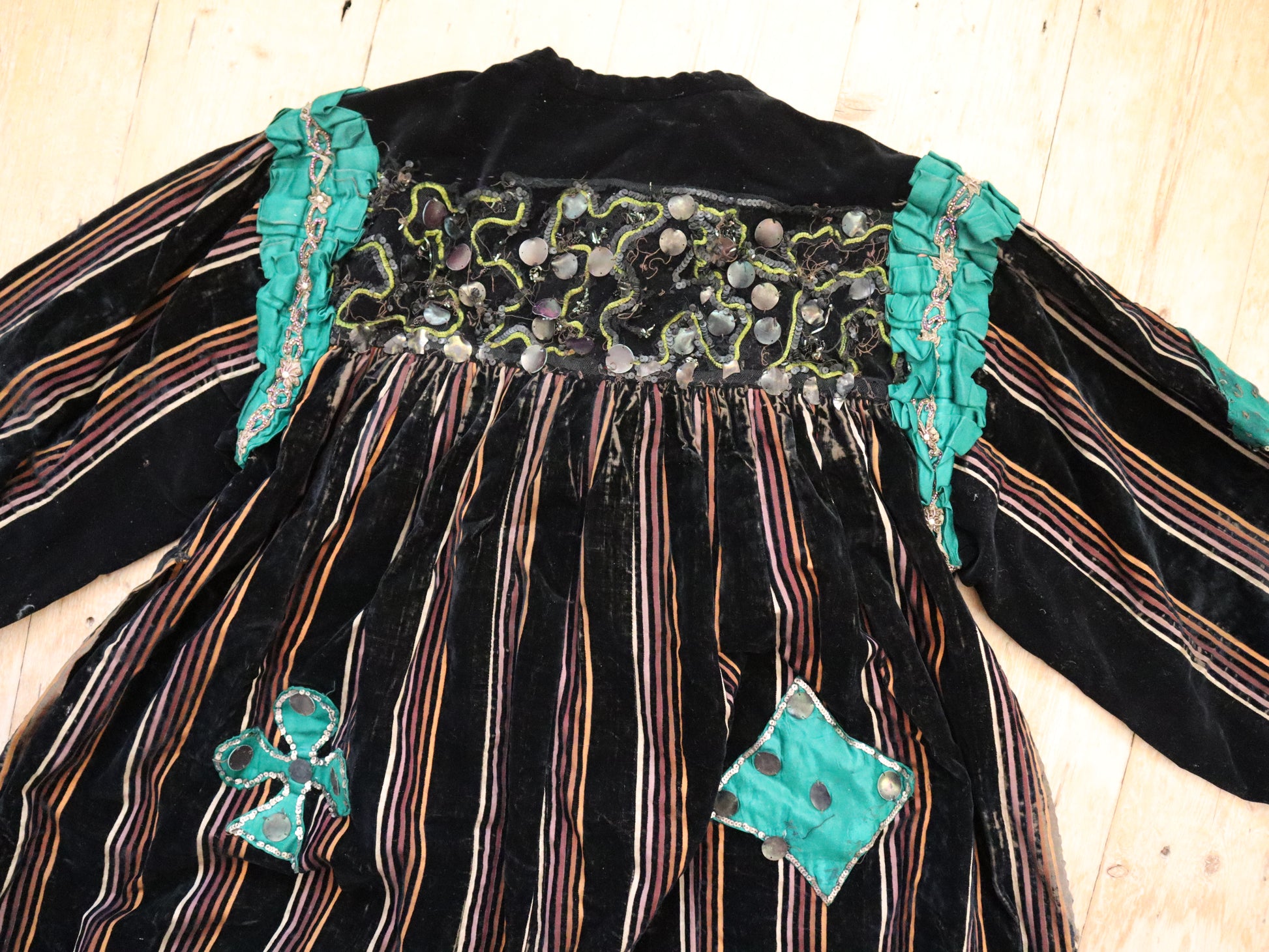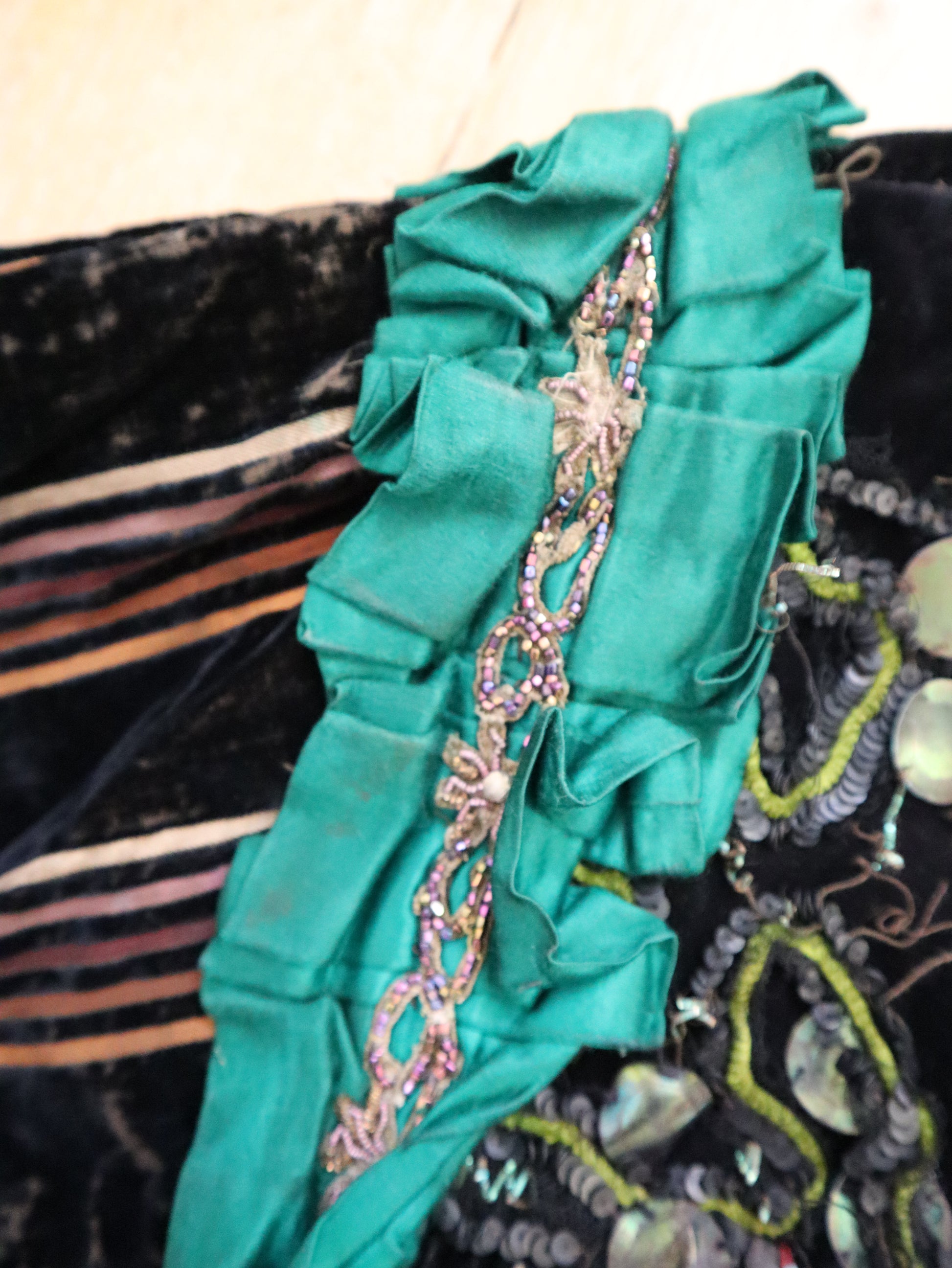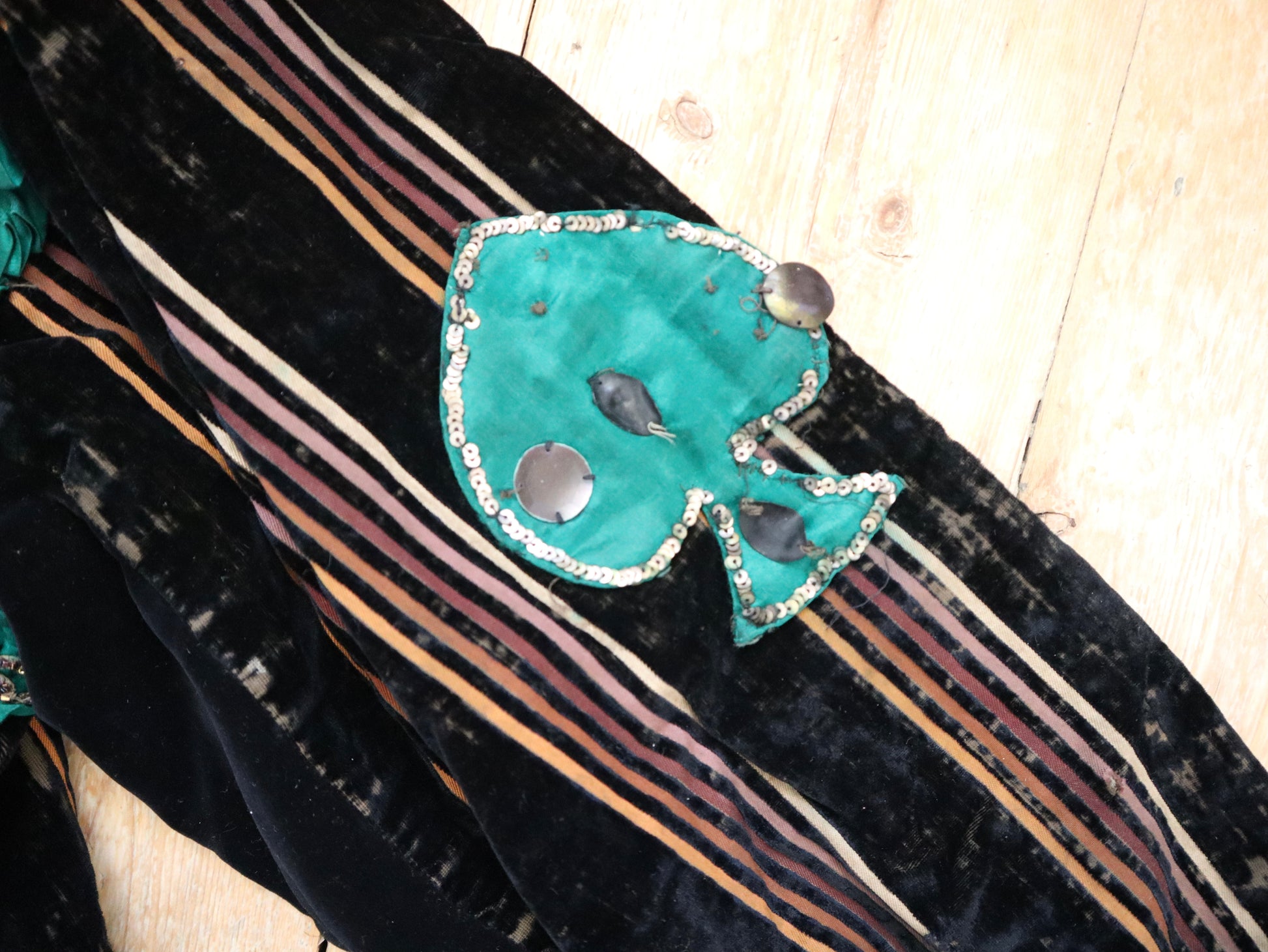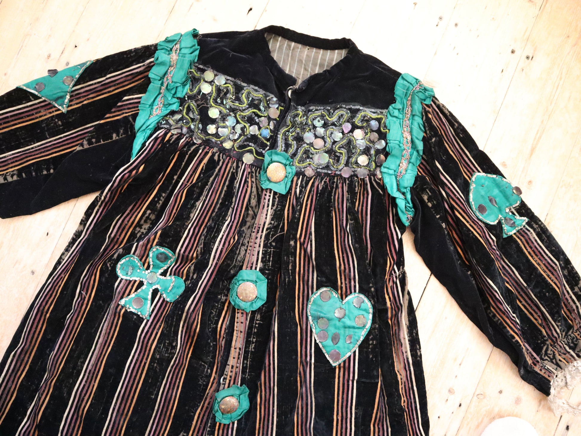 This extraordinary silk clown costume dates back to the 1910s–1920s and is a rare piece of wearable history. Hand-stitched from brown striped silk velvet, it’s lined with striped cotton and adorned with appliqué playing card motifs. Rich green silk ruffles and green and silver sequins embellish the suit, with beaded shoulder trim adding to its character. The buttons are brass with vibrant enamel painting, and it fastens with hidden buttons underneath. Slit openings at the sides (unlined) hint at pocket-style details. Lace trim finishes off the cuffs.