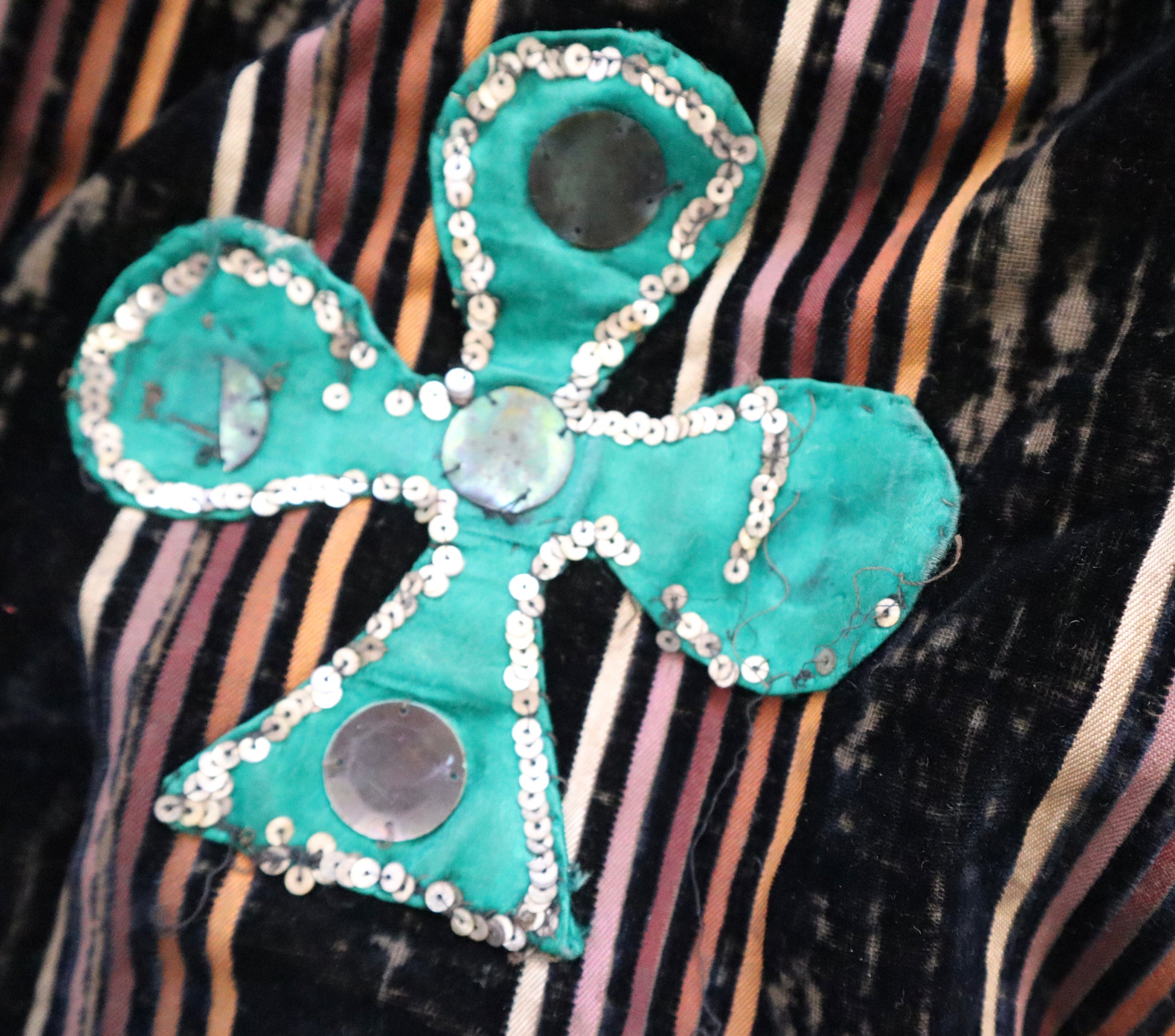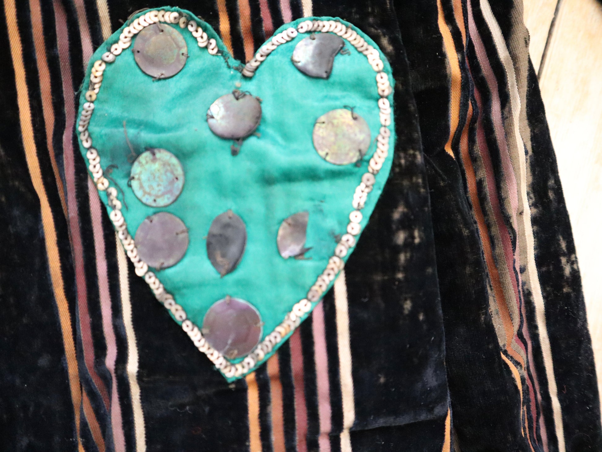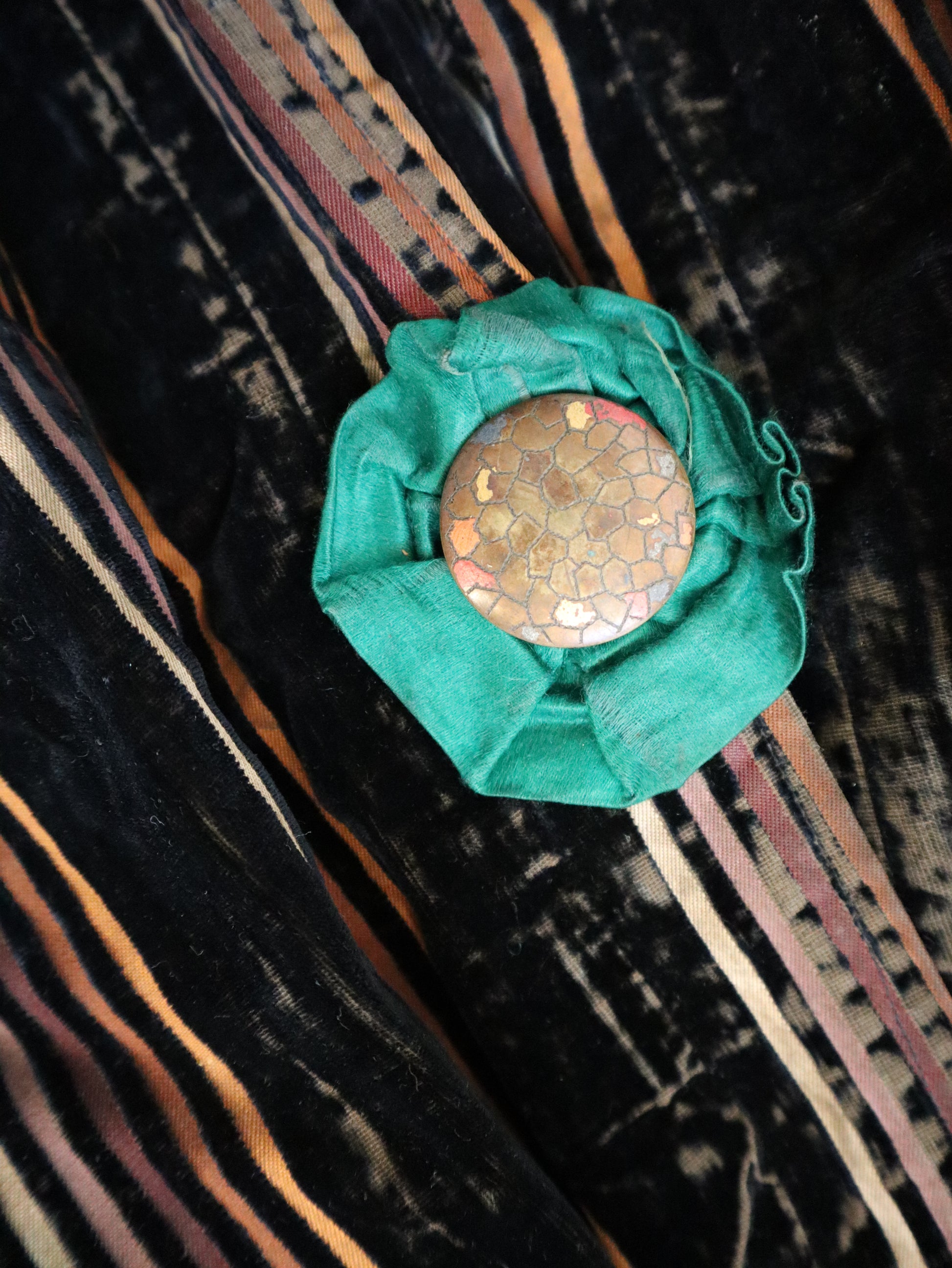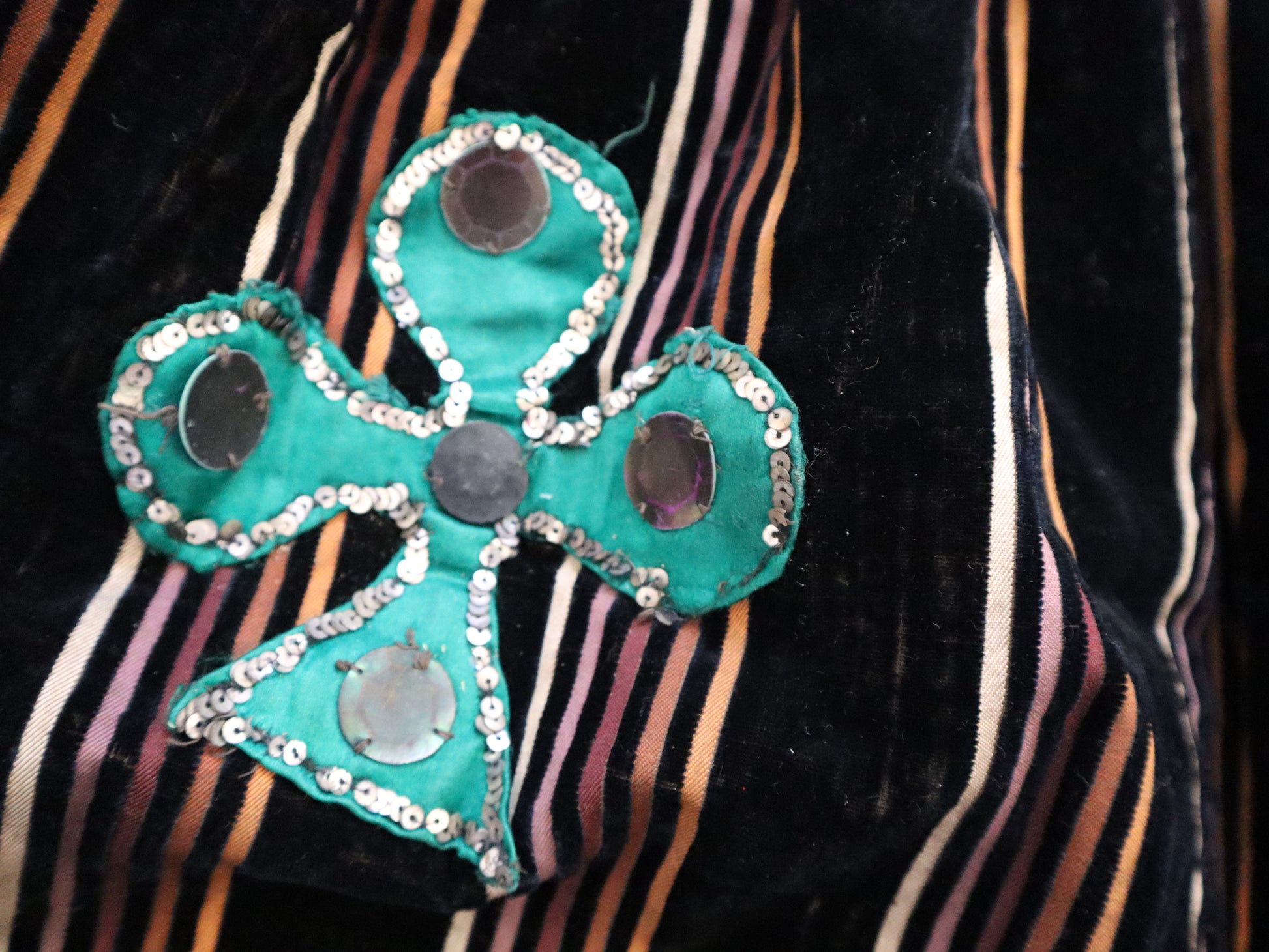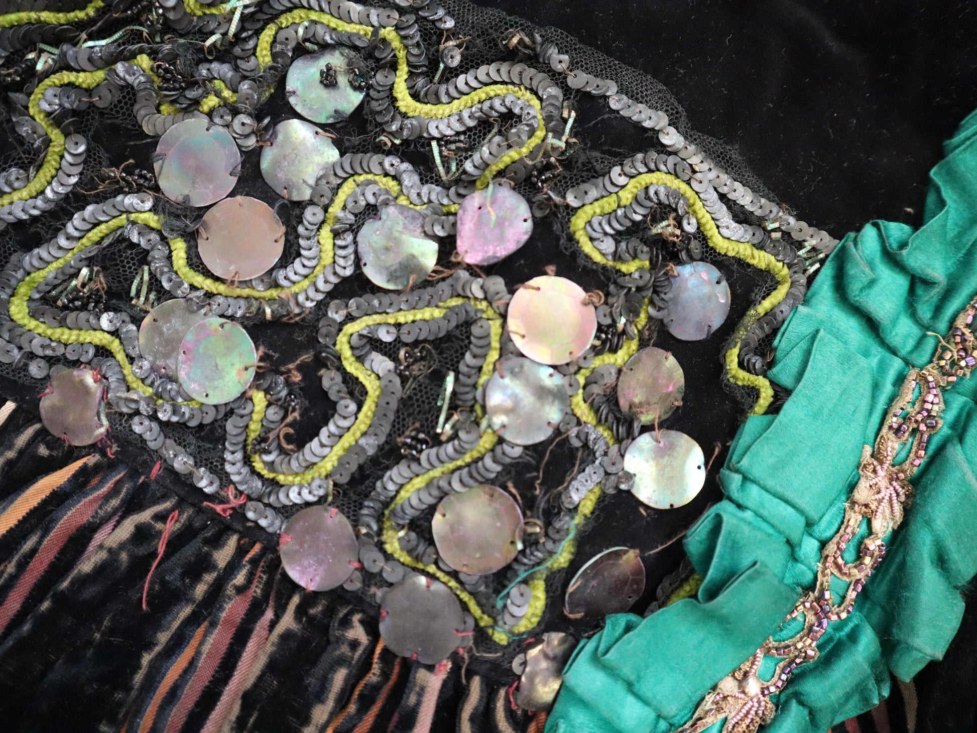 This extraordinary silk clown costume dates back to the 1910s–1920s and is a rare piece of wearable history. Hand-stitched from brown striped silk velvet, it’s lined with striped cotton and adorned with appliqué playing card motifs. Rich green silk ruffles and green and silver sequins embellish the suit, with beaded shoulder trim adding to its character. The buttons are brass with vibrant enamel painting, and it fastens with hidden buttons underneath. Slit openings at the sides (unlined) hint at pocket-style details. Lace trim finishes off the cuffs.