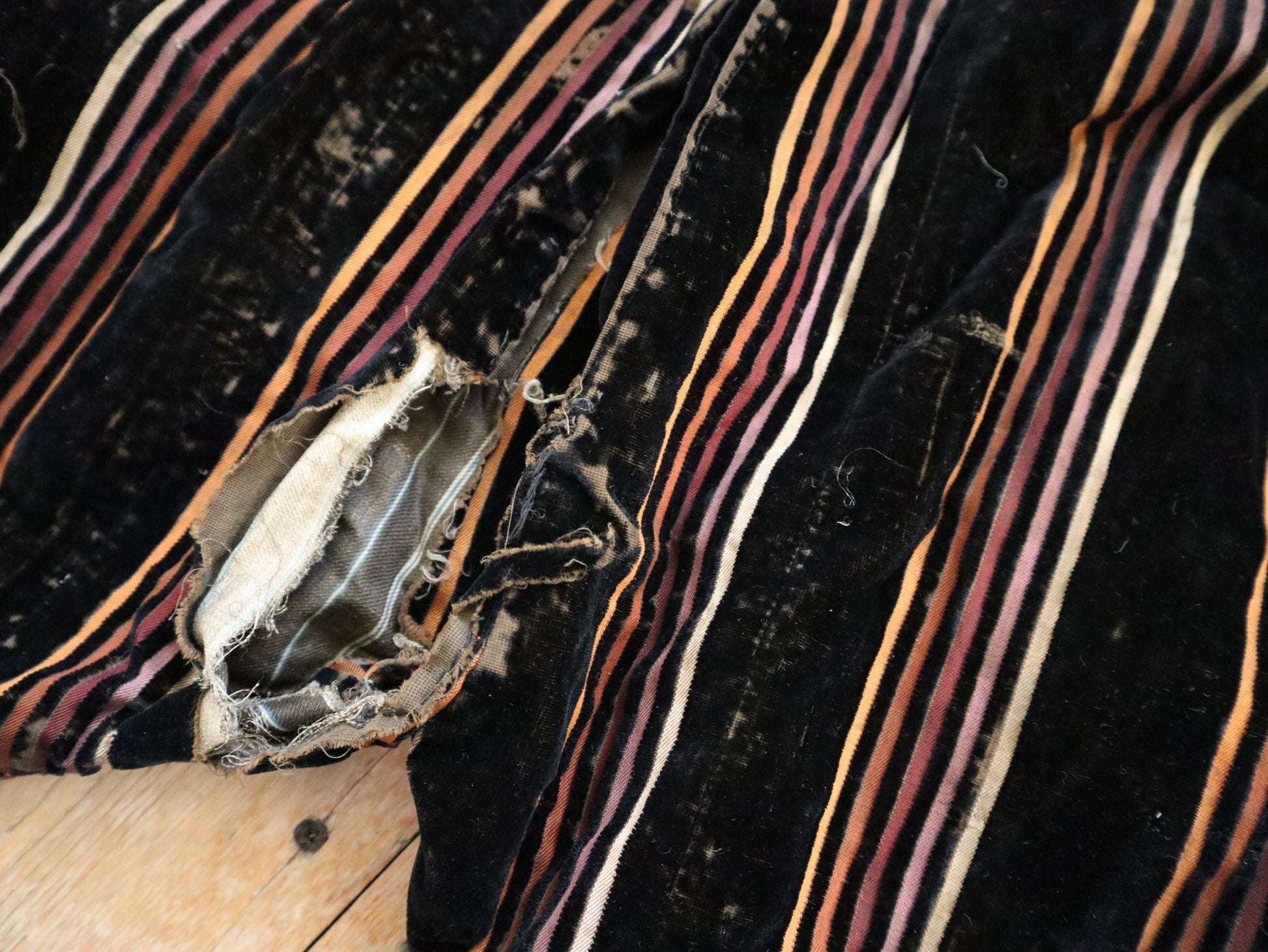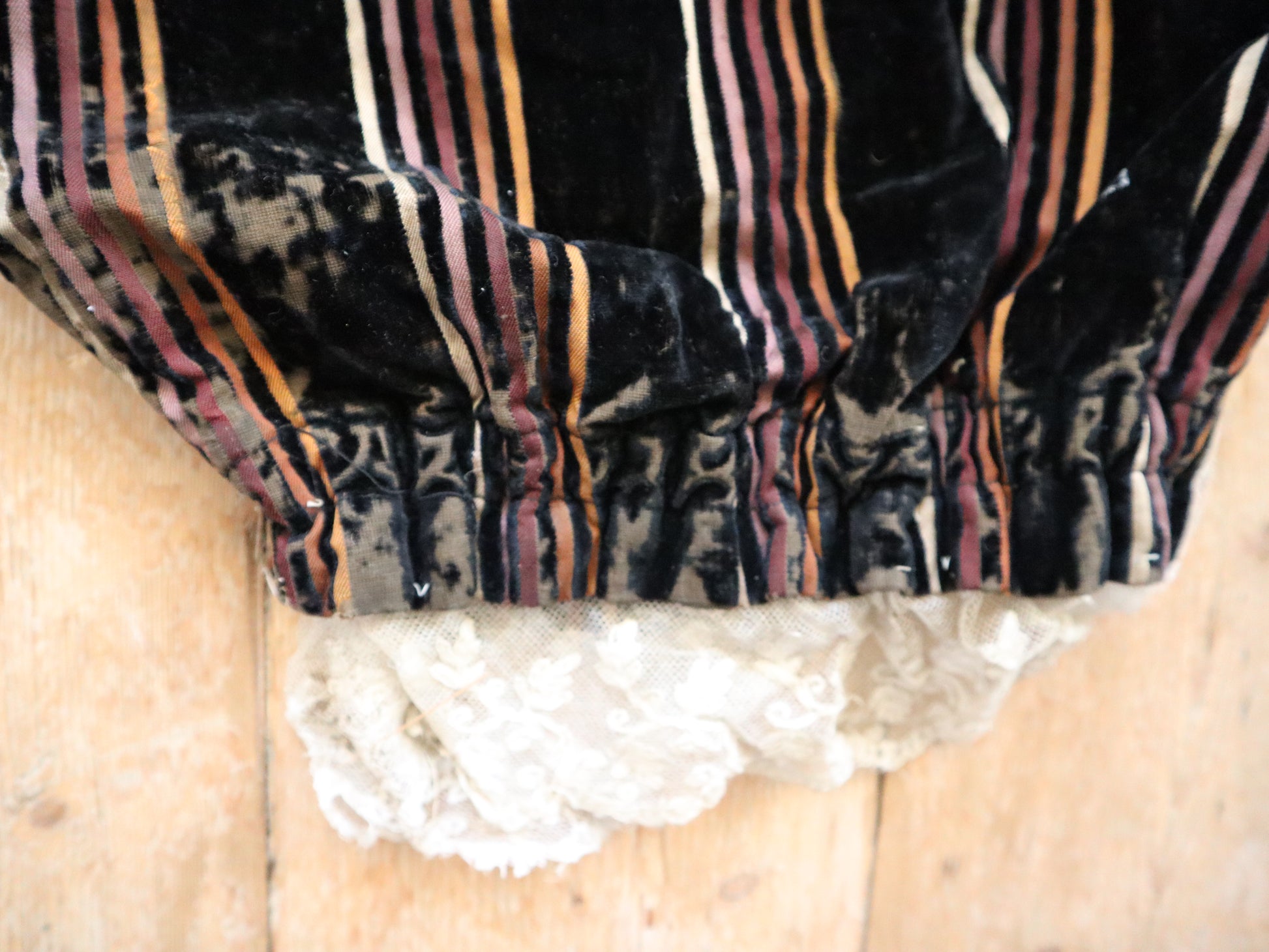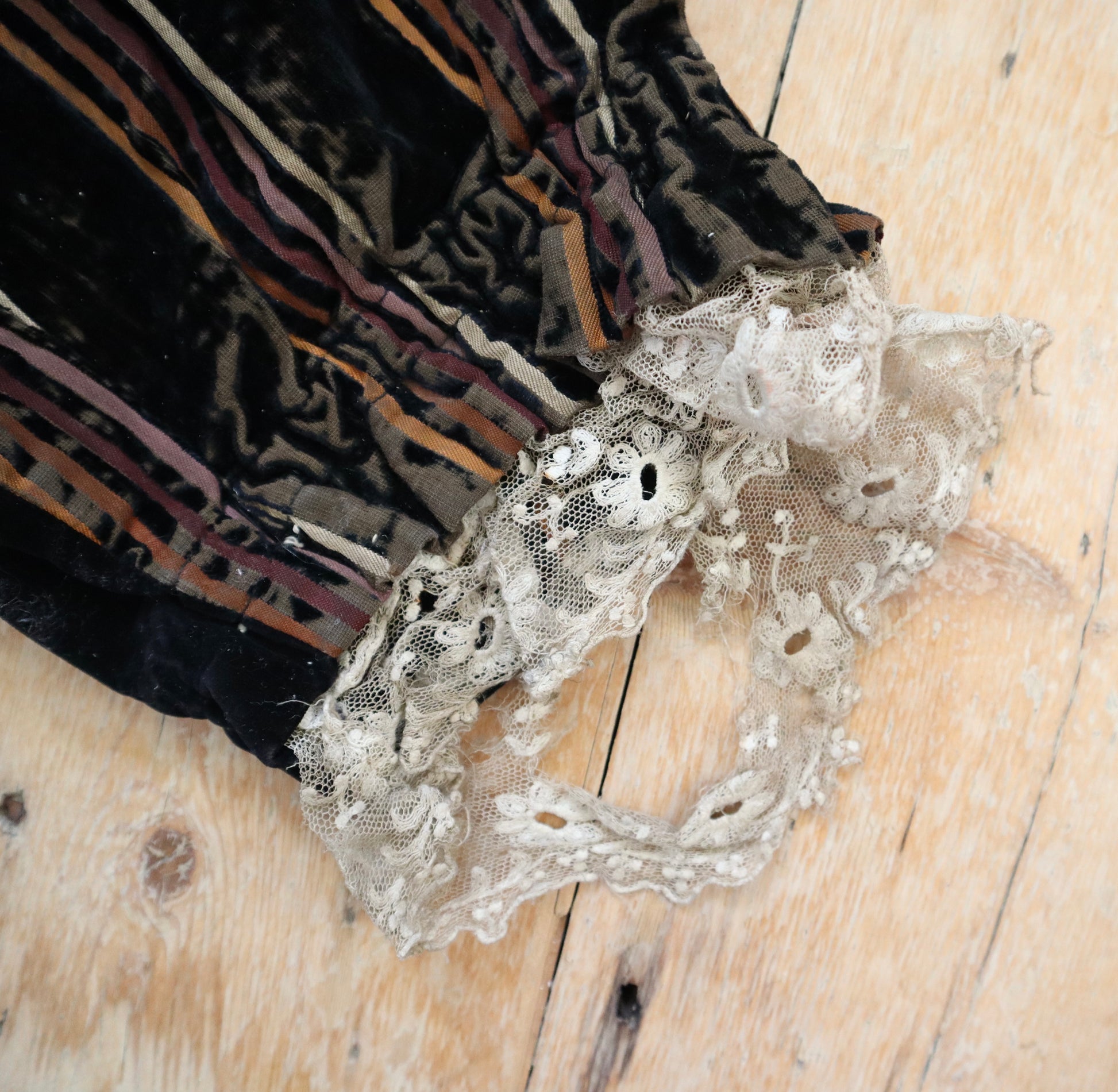 Overall in good vintage condition. There is noticeable surface wear, particularly where the velvet pile is worn down. The left cuff lace trim is torn. The main area needing repair is the crotch, which is split and requires sewing.