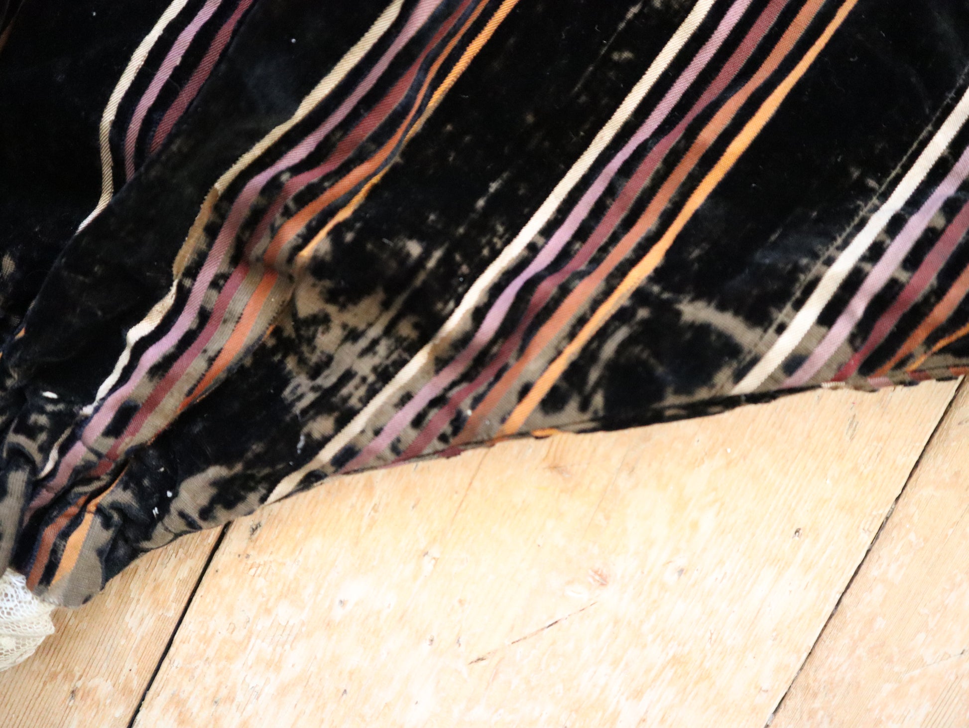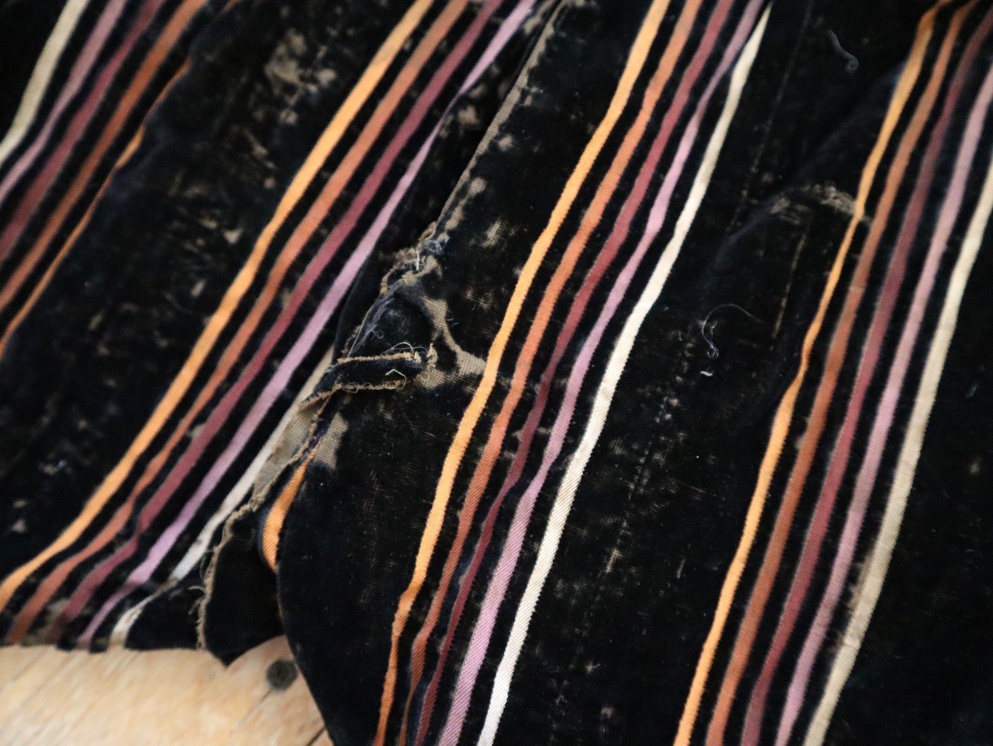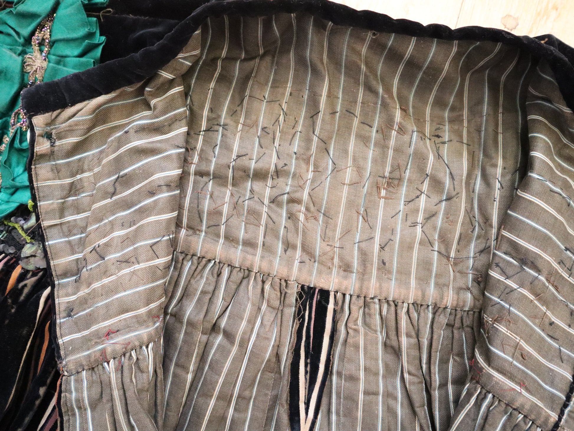 Overall in good vintage condition. There is noticeable surface wear, particularly where the velvet pile is worn down. The left cuff lace trim is torn. The main area needing repair is the crotch, which is split and requires sewing.