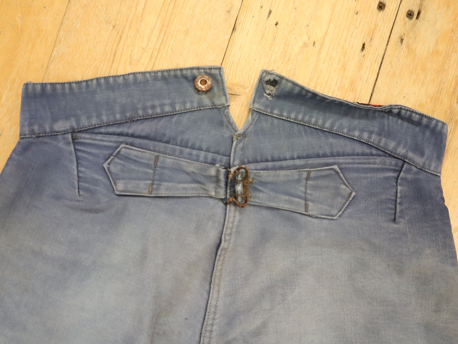 C.1950s French blue moleskin workwear trousers made Le Salvetal. Really nice patched repairs on the knees and also some darned repairs. Cinch back with a metal buckle.