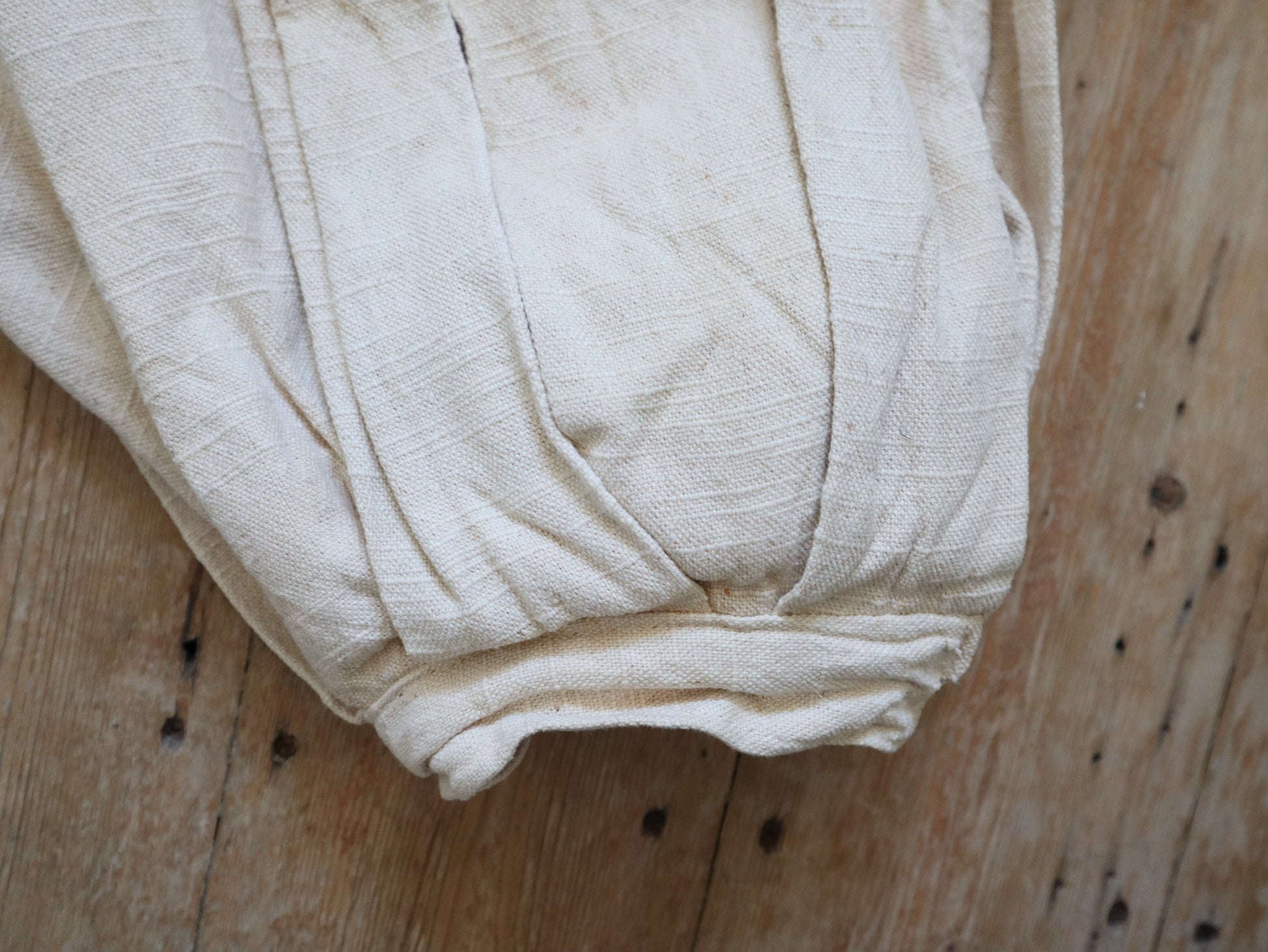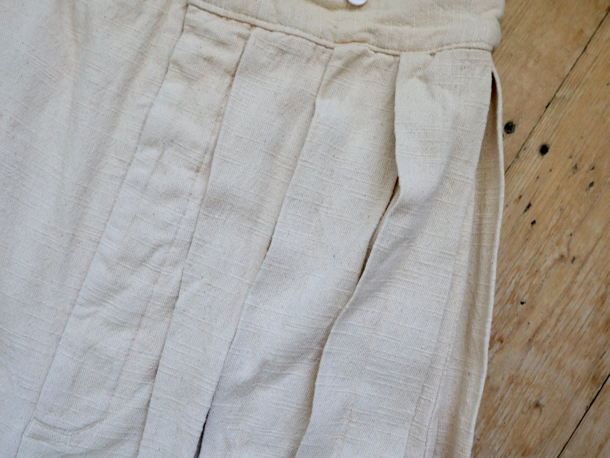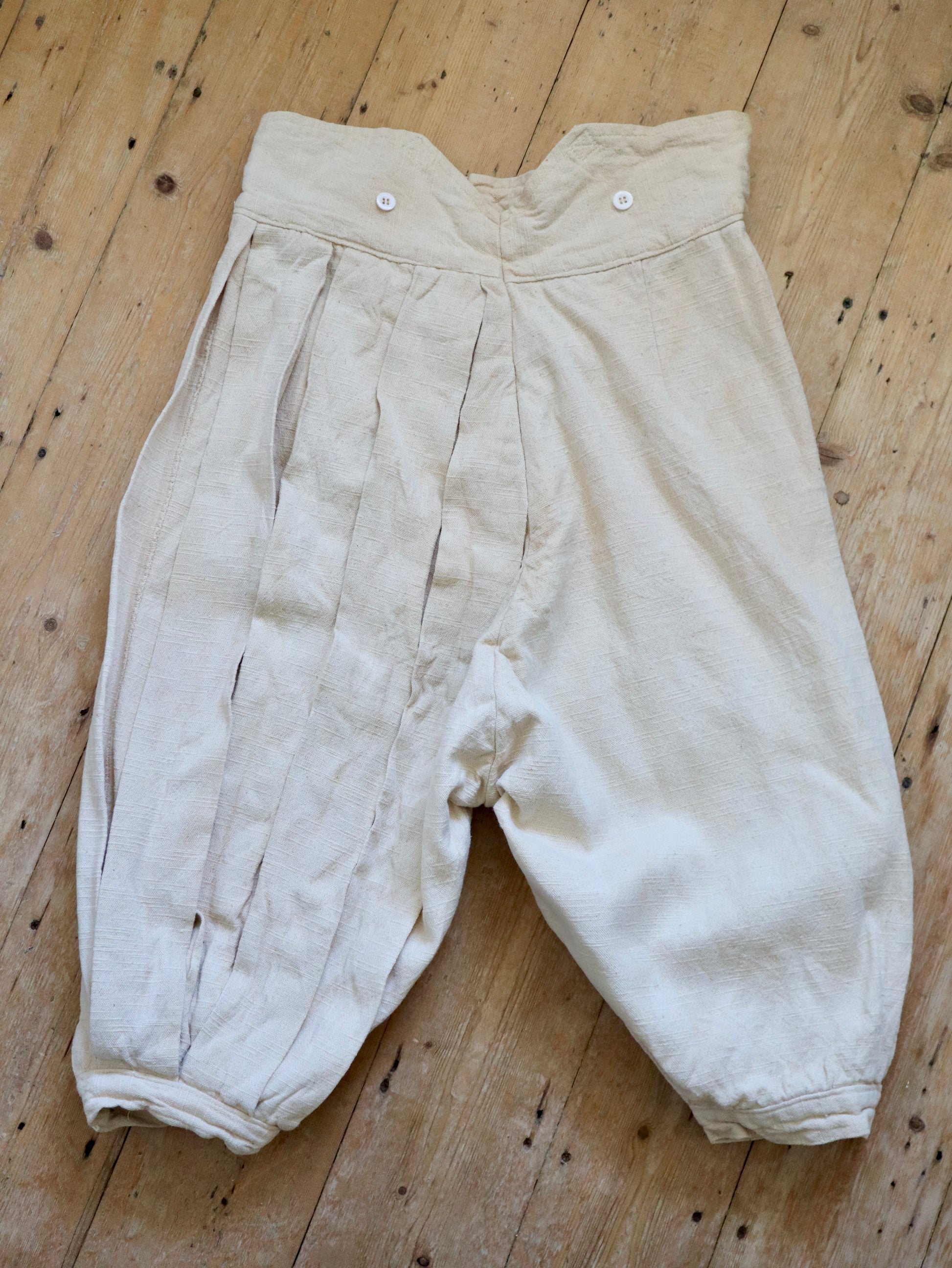 Incredible cream cotton breeches made for Royal Opera House, London. Avant garde asymmetrical design. Renaissance inspired design in a rustic chunky woven cotton. Pleated folds on one side and plain on the other. Button fly. Fastens with metal hook and eyes at the ankles. Buttons on the inner waistband to affix braces/suspenders.