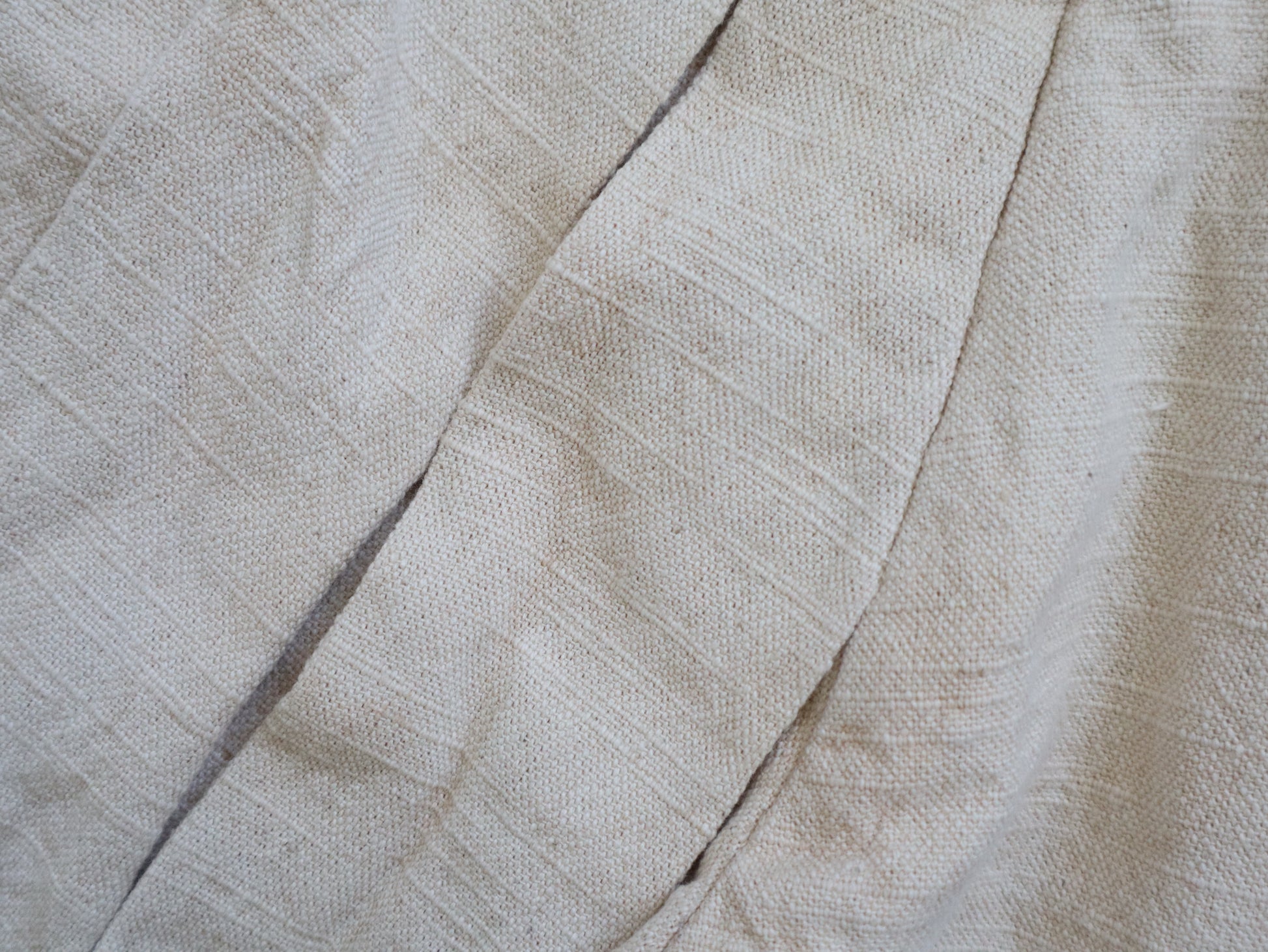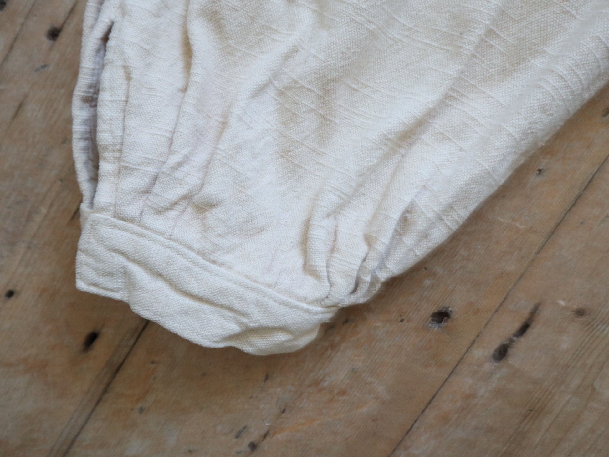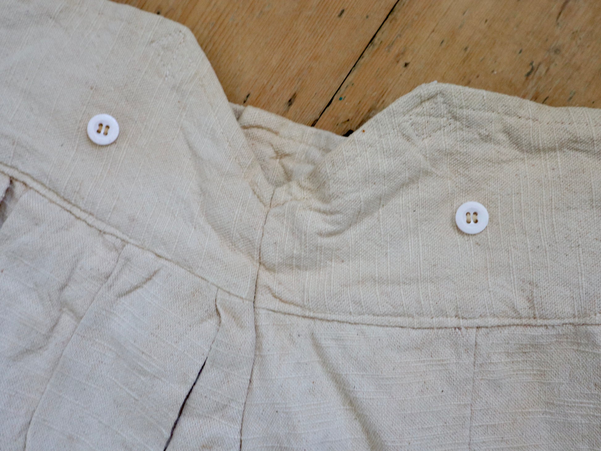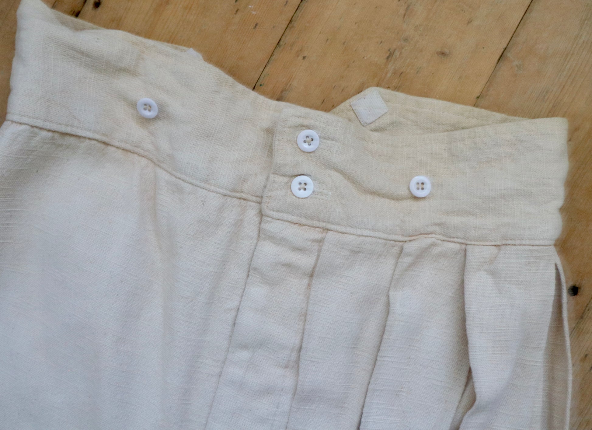 Incredible cream cotton breeches made for Royal Opera House, London. Avant garde asymmetrical design. Renaissance inspired design in a rustic chunky woven cotton. Pleated folds on one side and plain on the other. Button fly. Fastens with metal hook and eyes at the ankles. Buttons on the inner waistband to affix braces/suspenders.