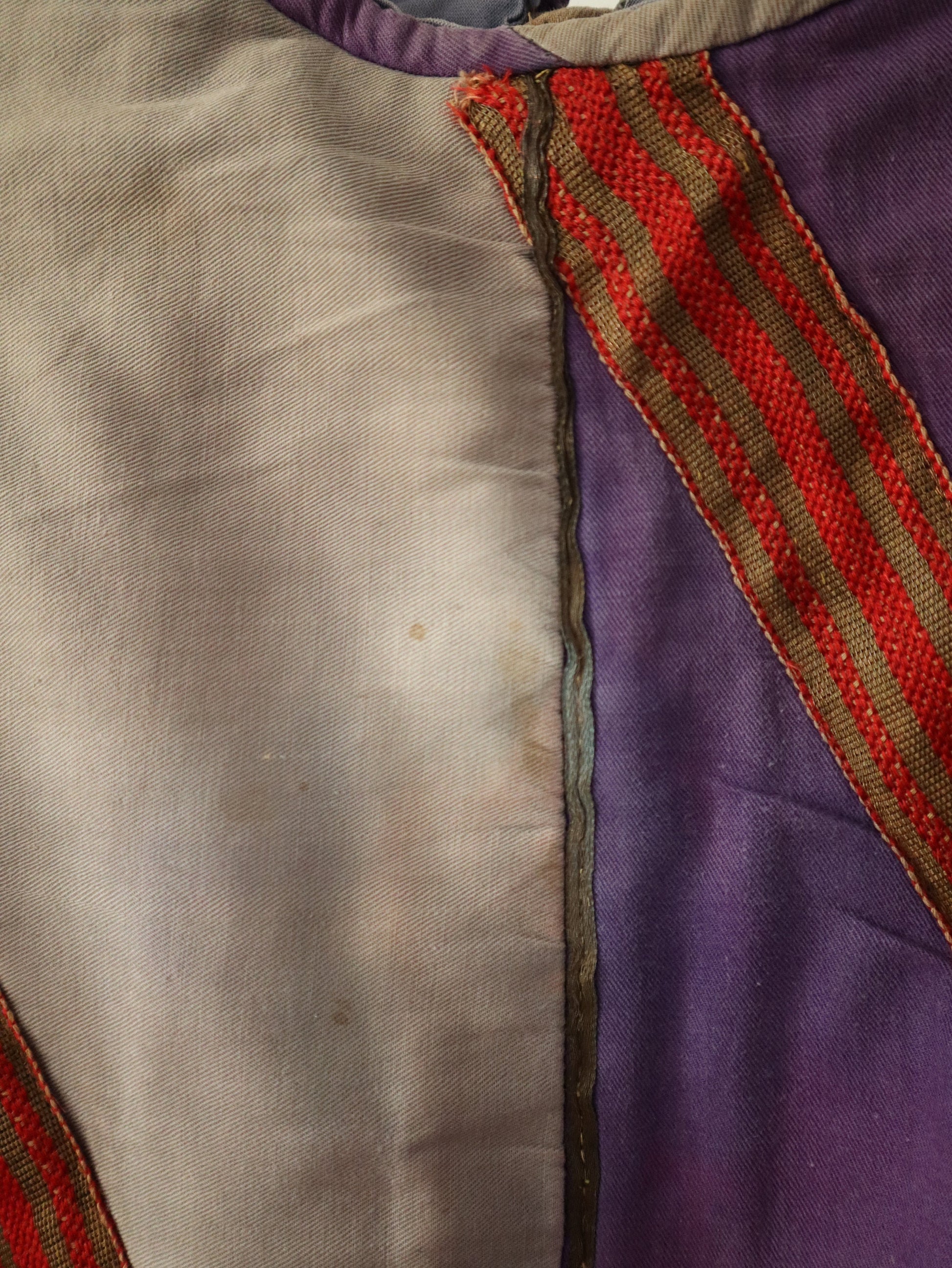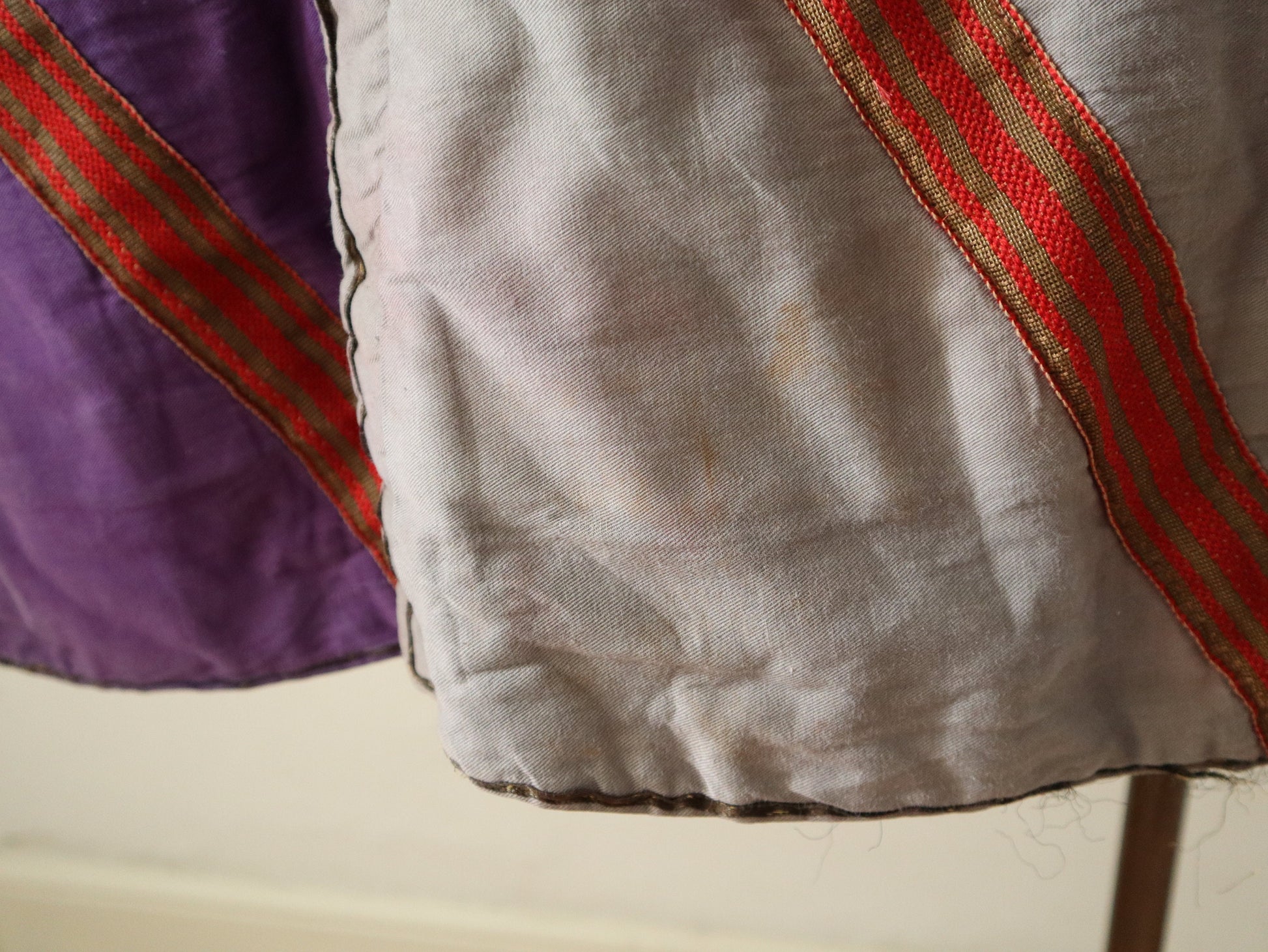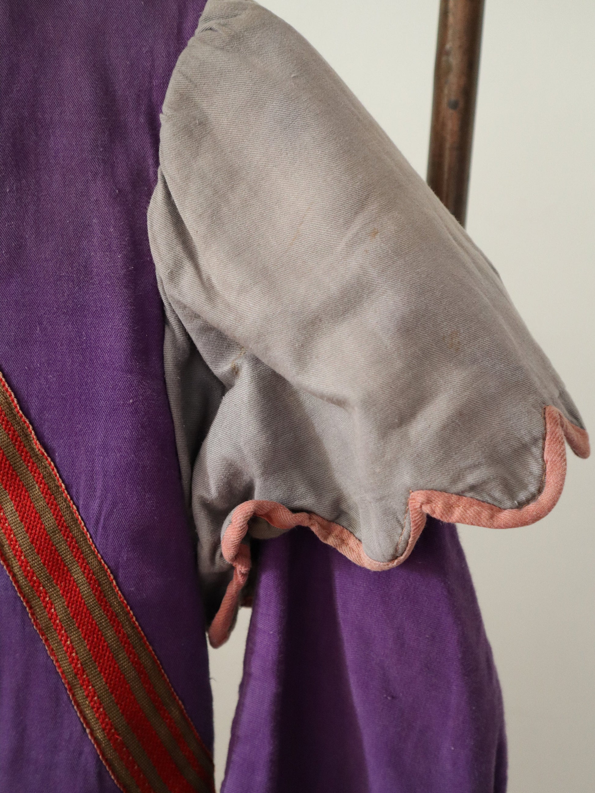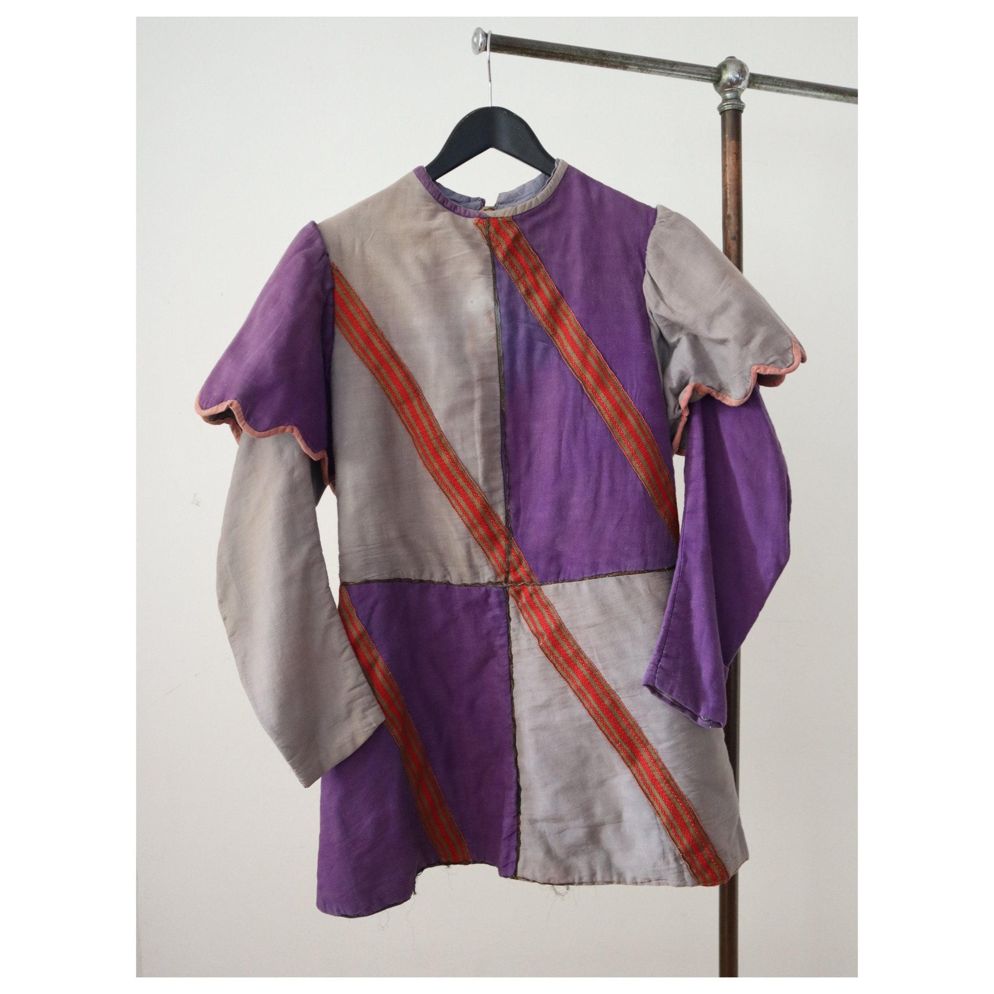 Early 1900s French tunic costume. Renaissance style, made for opera. Purple and grey cotton panels with gold metal ribbon appliqué down the centre and edges and gold and red ribbon appliqué diagonally across. Called sleeves with pink edging. Buttons up the back.