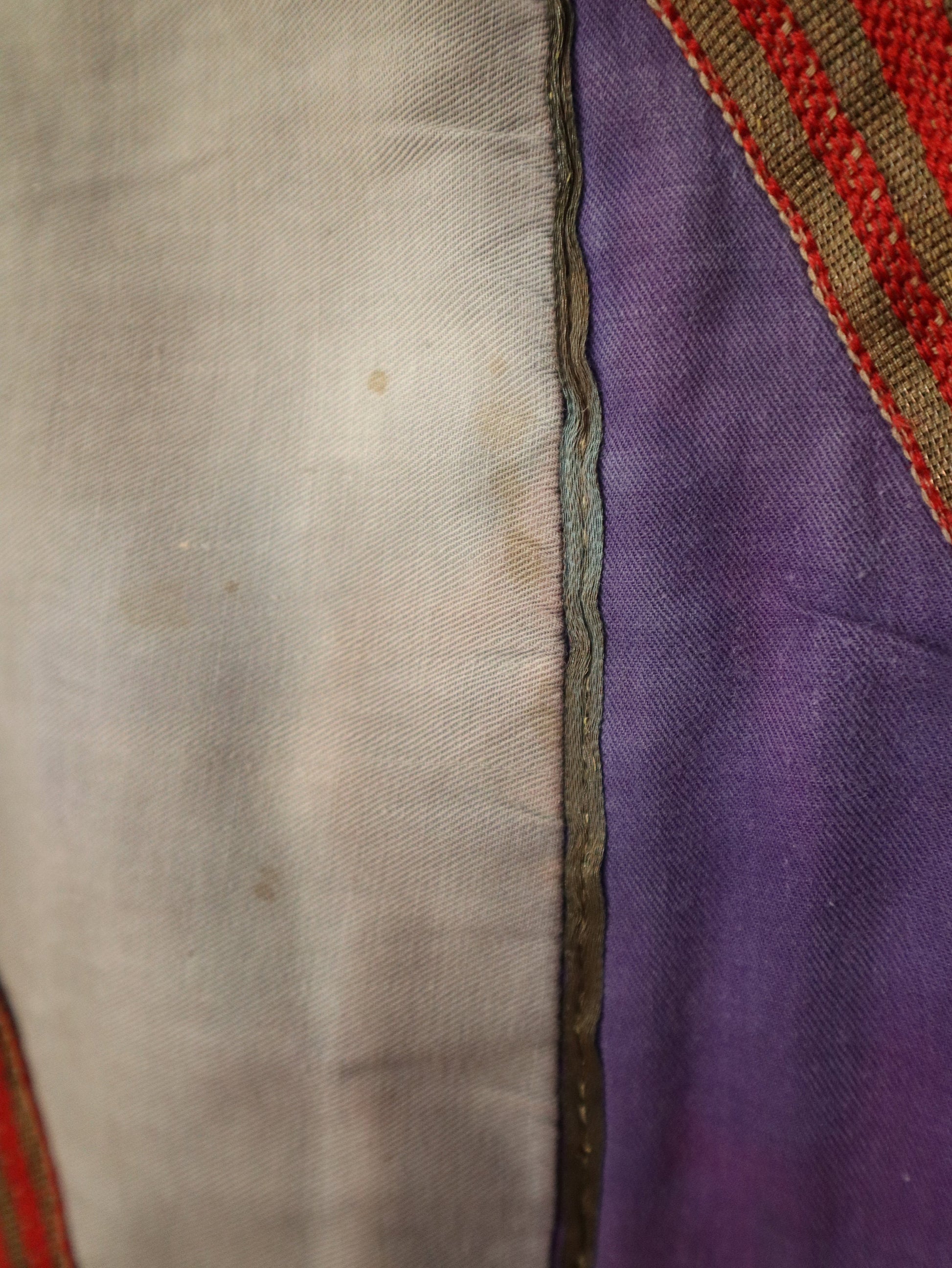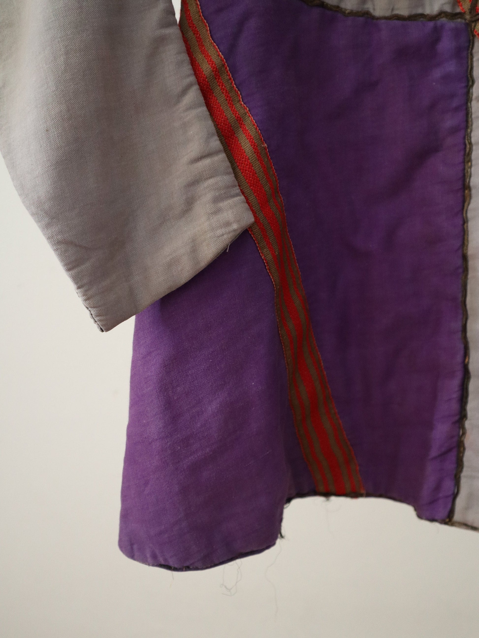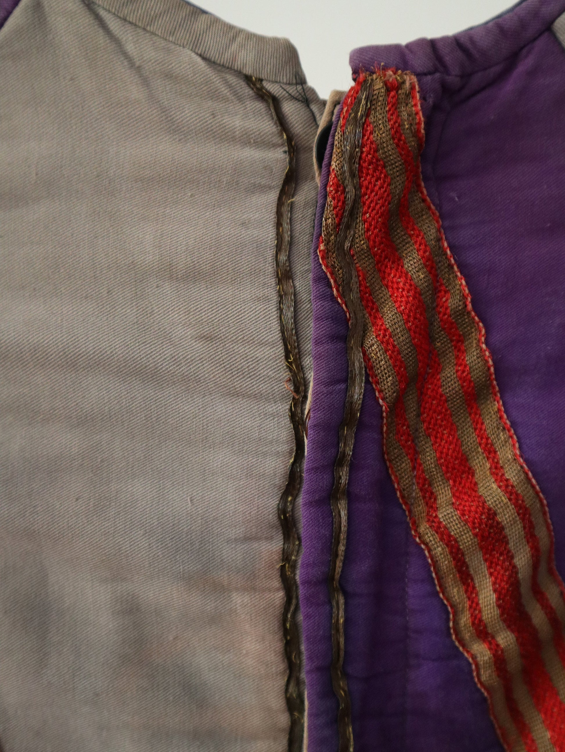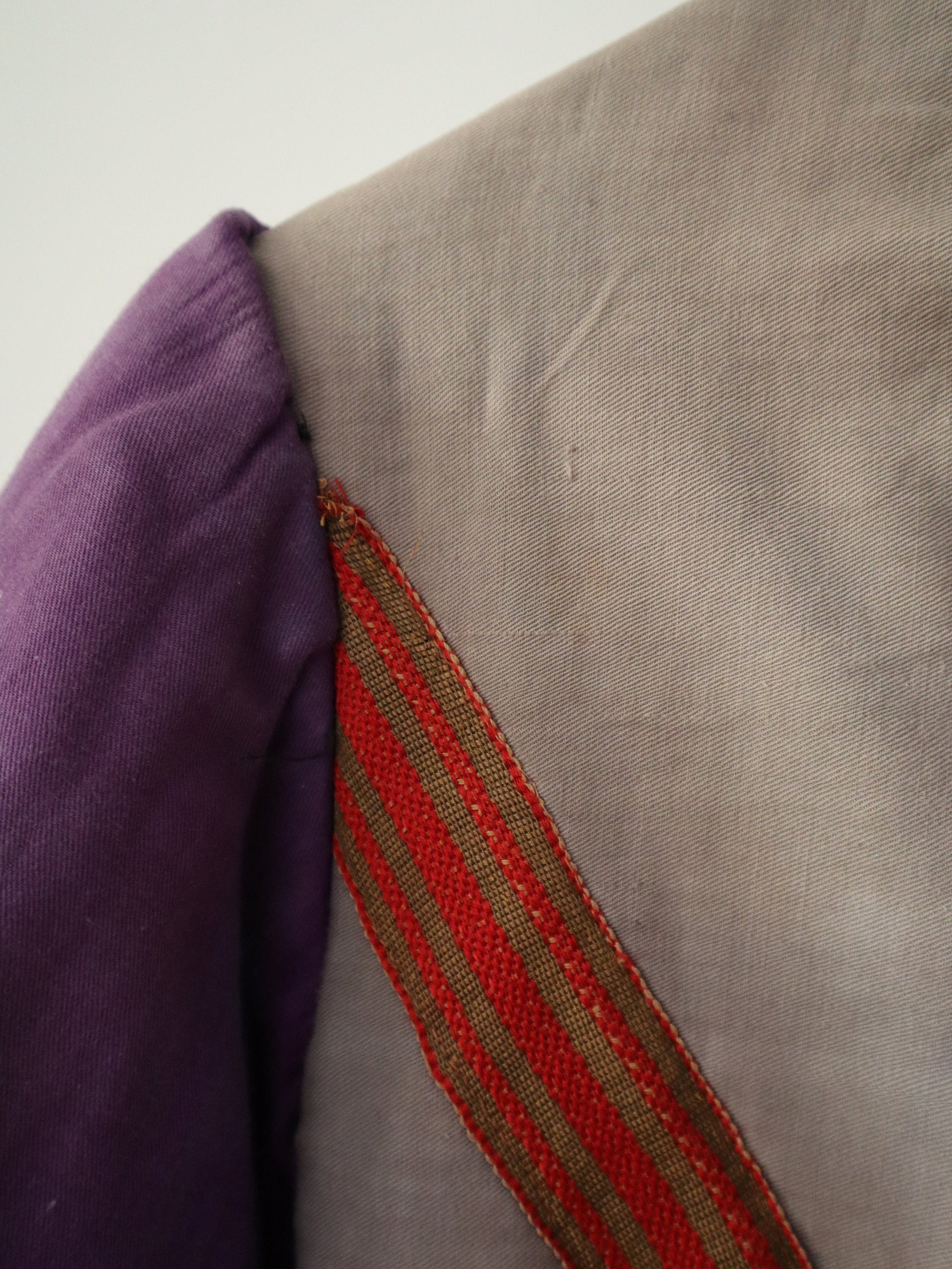 Early 1900s French tunic costume. Renaissance style, made for opera. Purple and grey cotton panels with gold metal ribbon appliqué down the centre and edges and gold and red ribbon appliqué diagonally across. Called sleeves with pink edging. Buttons up the back.