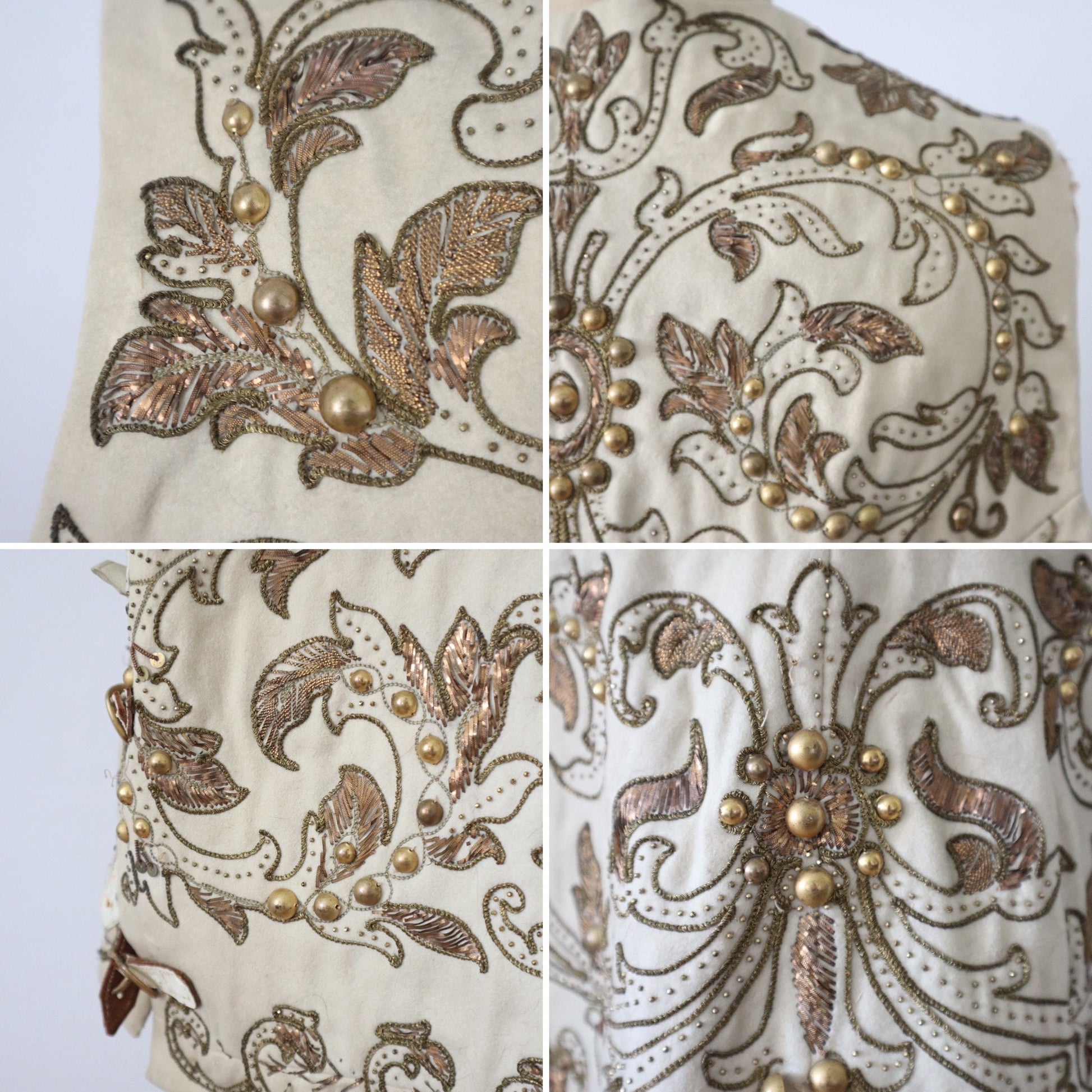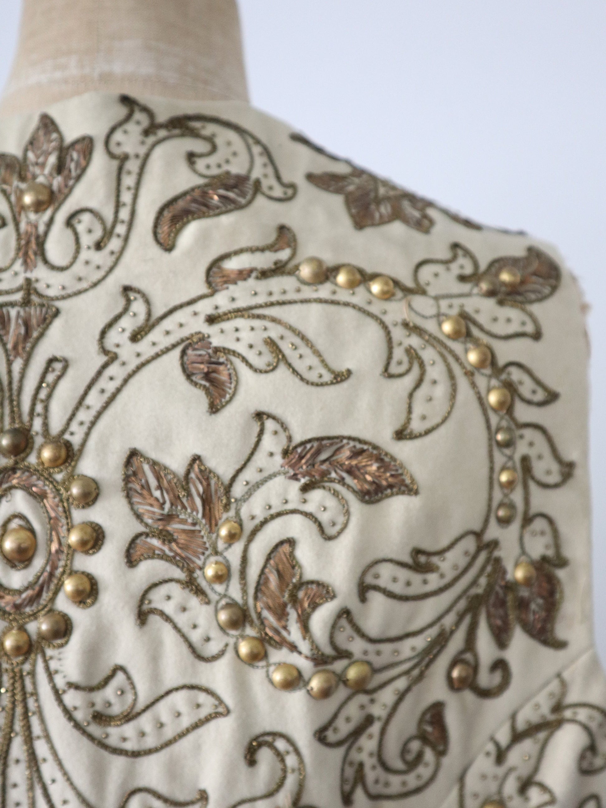 Late 19th century cream wool tunic with gold metal thread, faceted matte gold bead, sequin and domed embellishments. All applied to form flourishes of foliage like motifs.