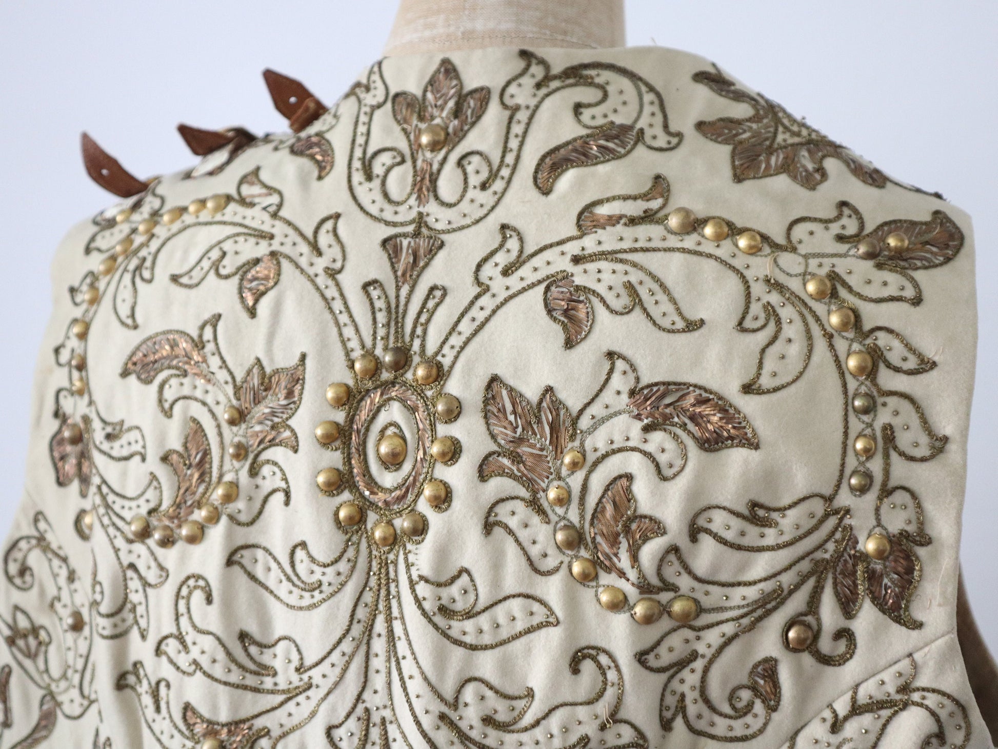 Leather straps with metal buckles to fasten at the shoulder and side. Made for French opera costume. A really exquisite piece made to a very high standard. Lined in cotton twill.