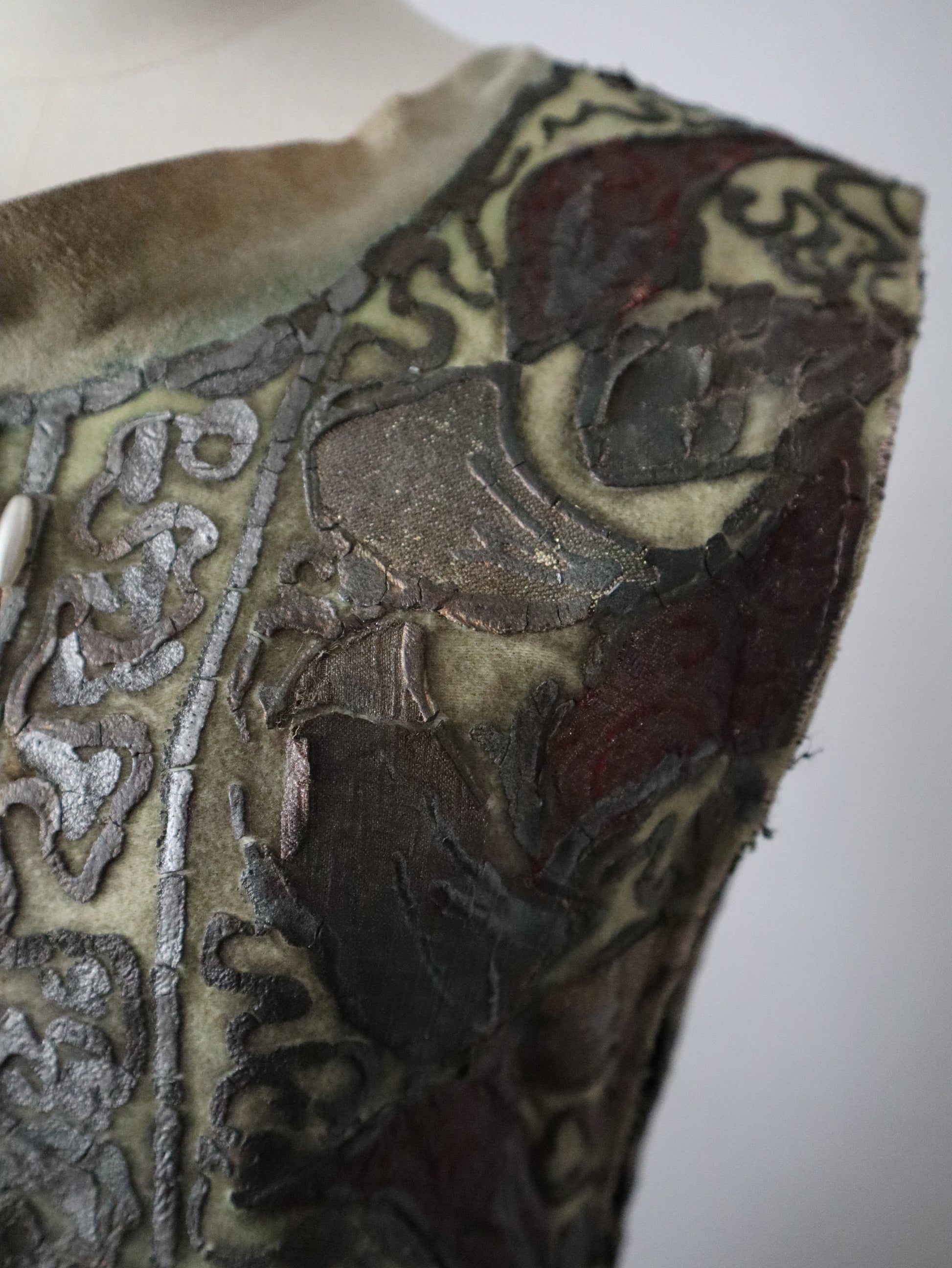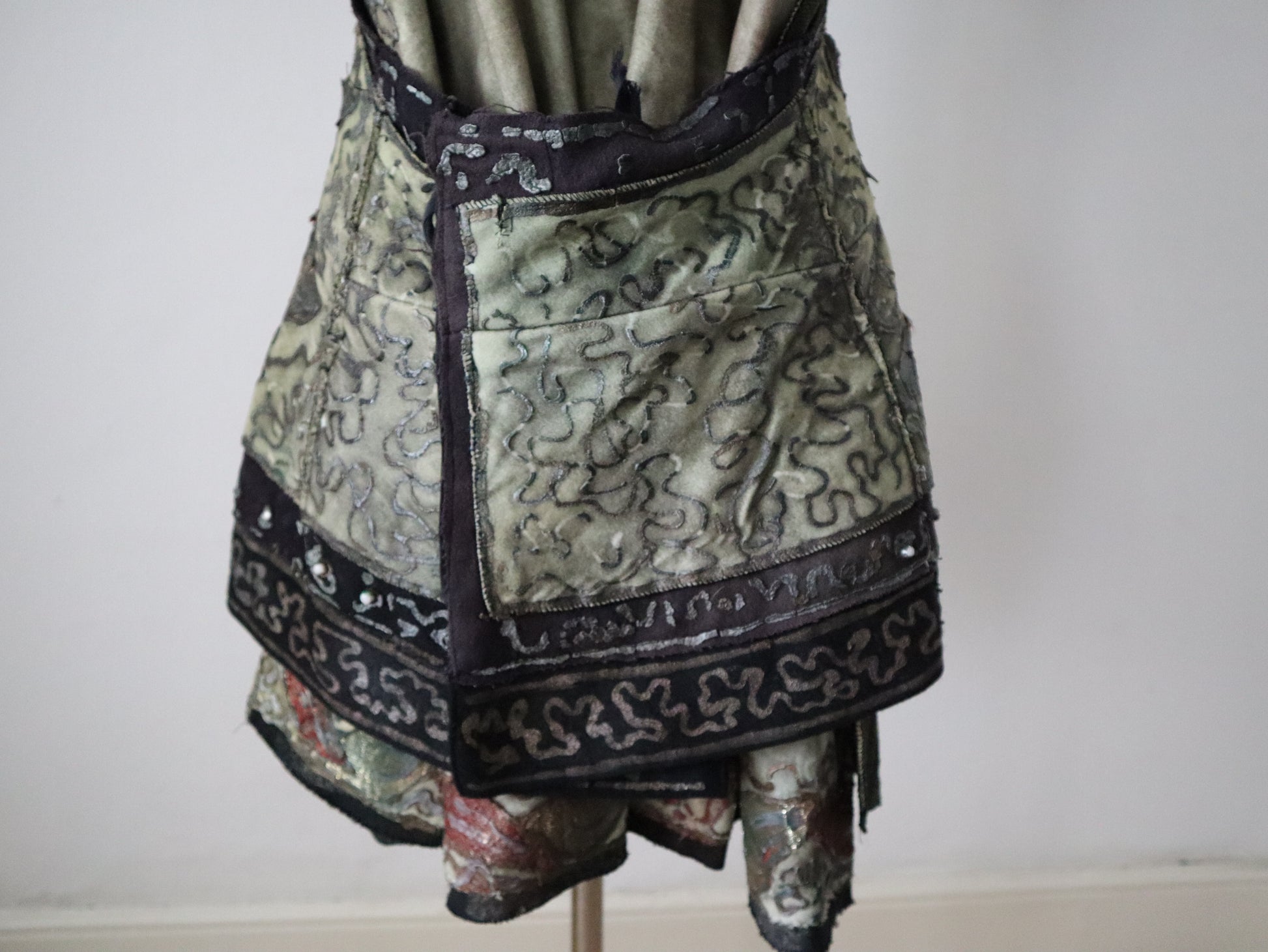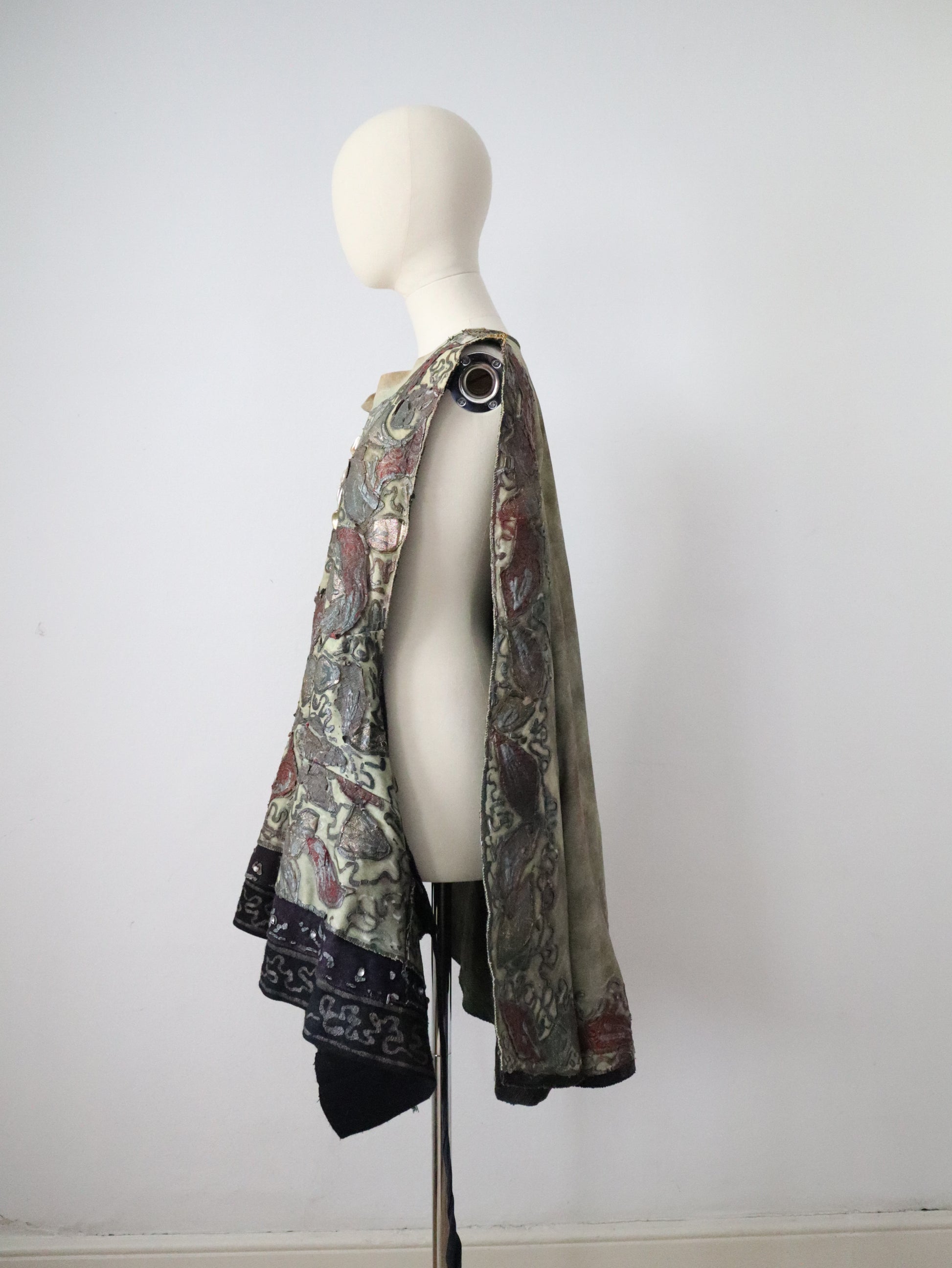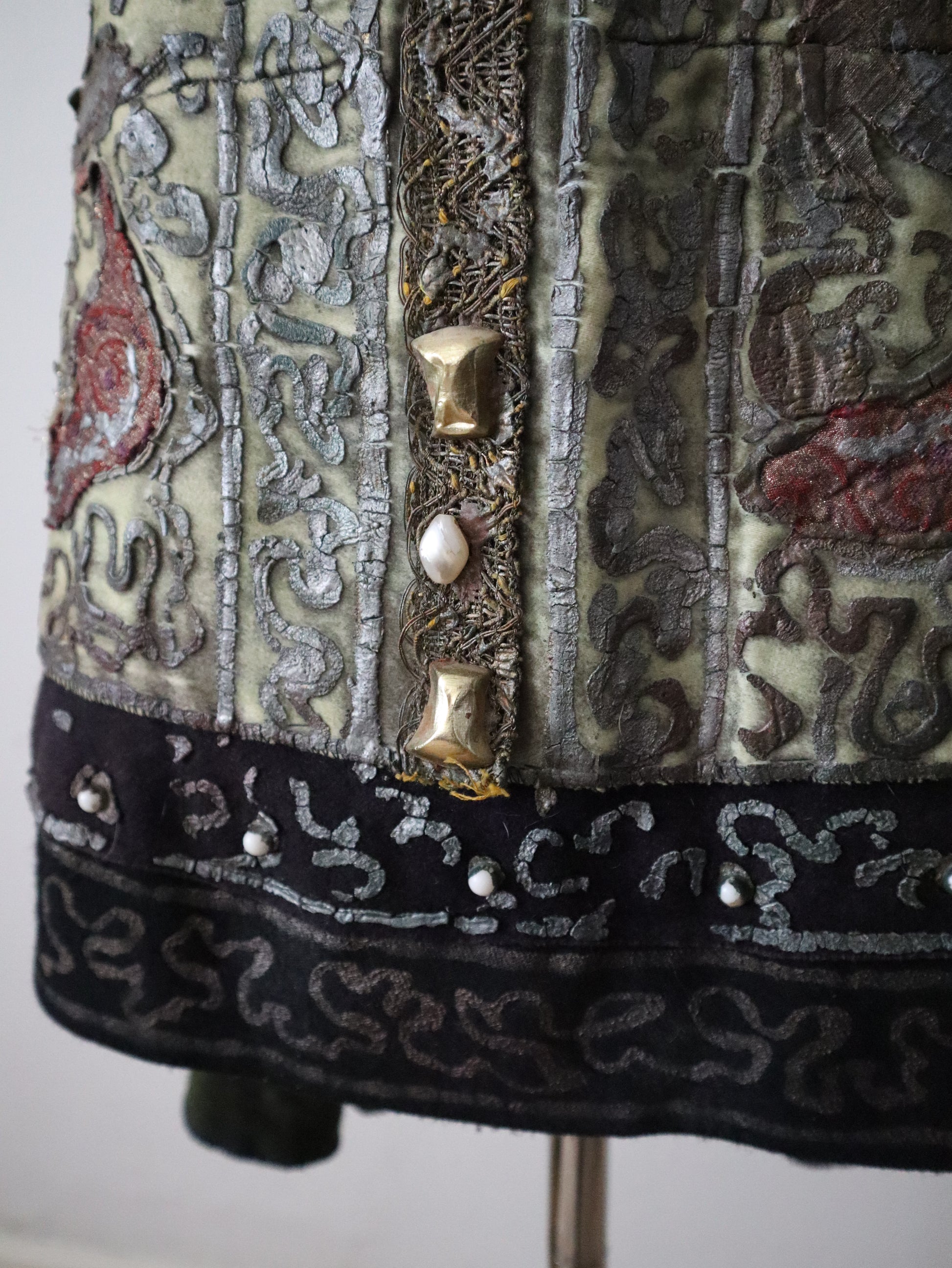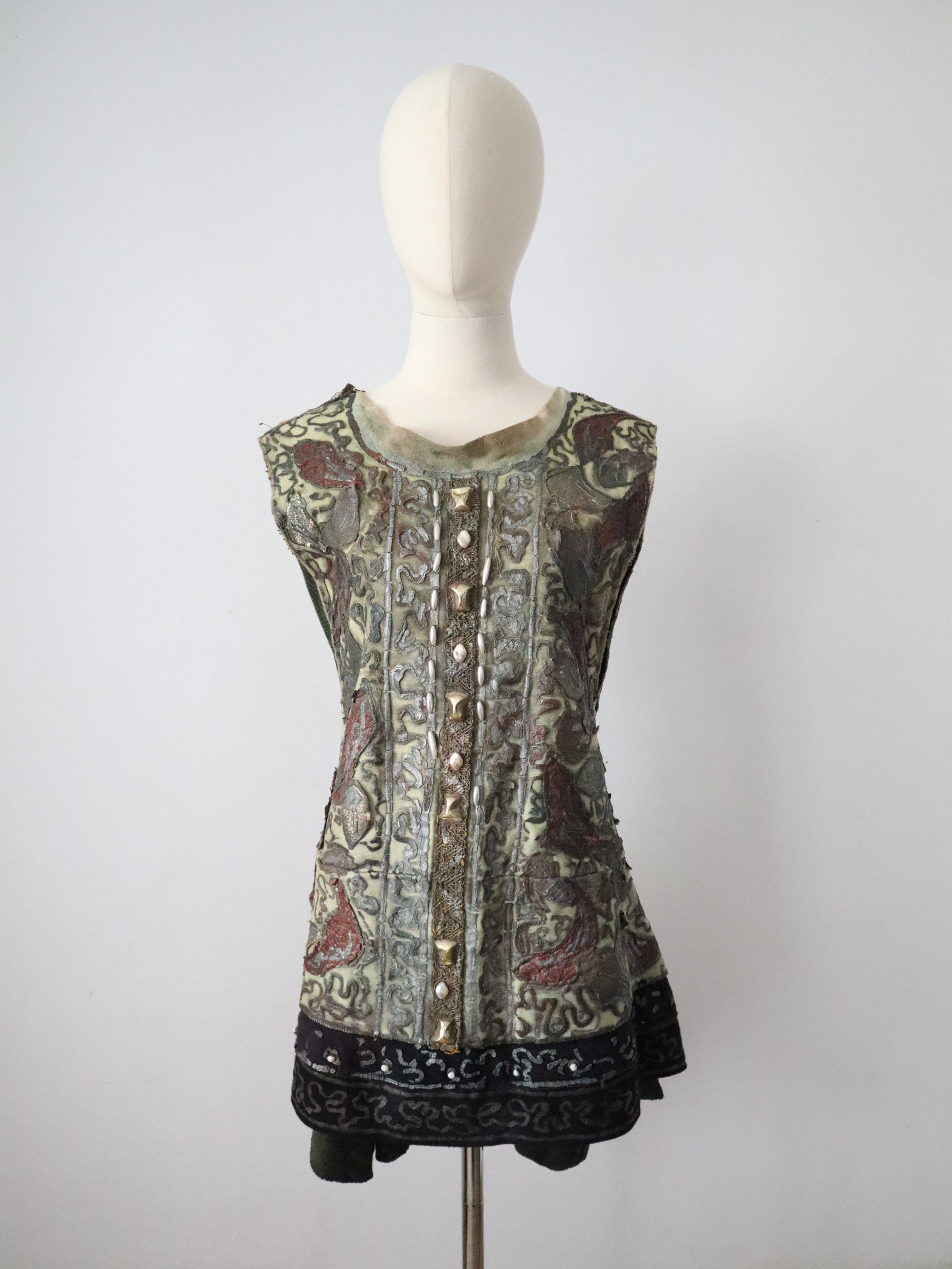 French opera costume made for the character of Mercutio in Romeo and Juliet. This tunic has many techniques including hand painted metallic fabric paint which is raised and textured. Appliqué gold and metallic red tone sections. Gold metal ribbon trim down the centre which is embellished with plastic golden and pearl beads.its wraps and ties from the sides.