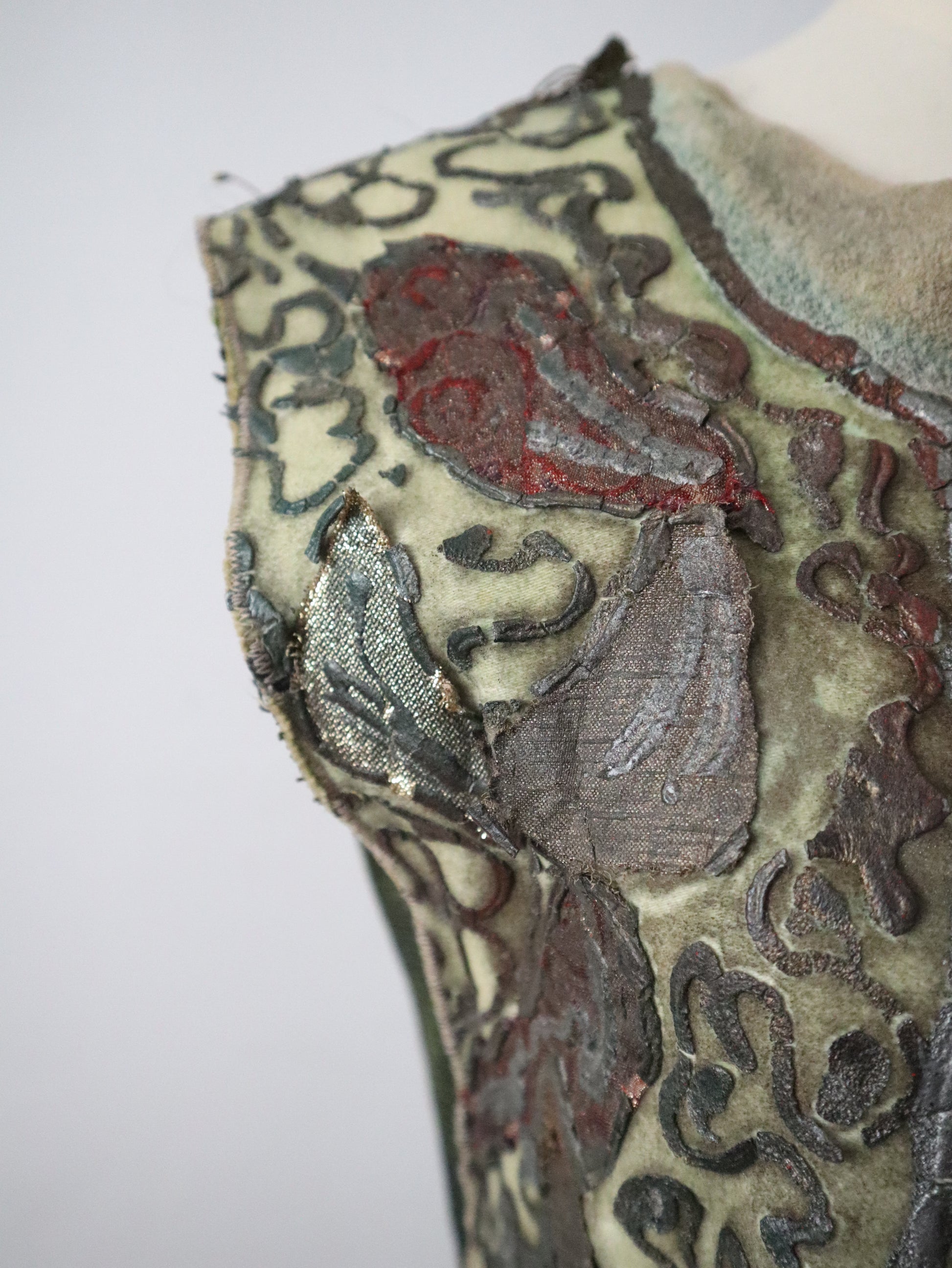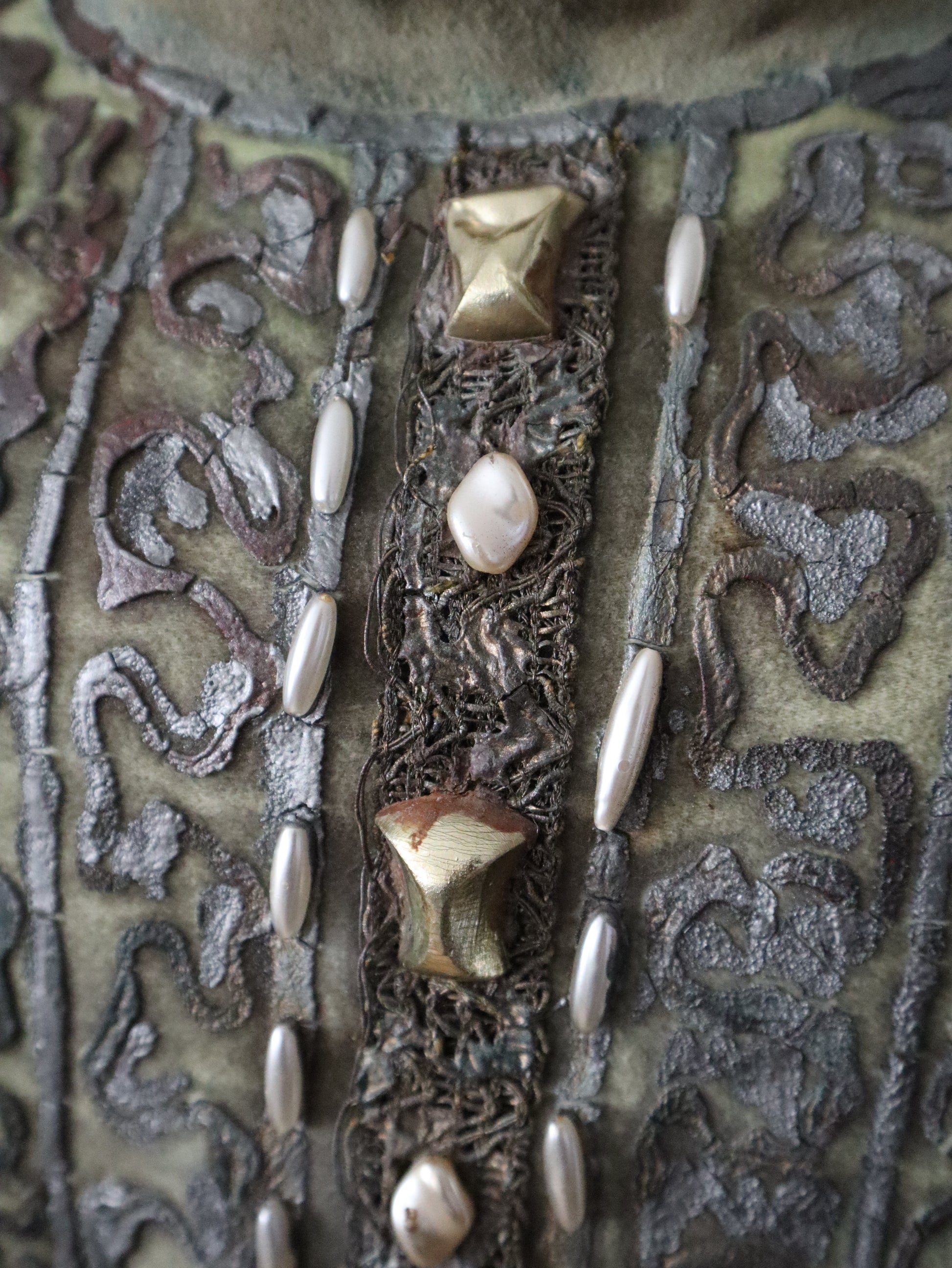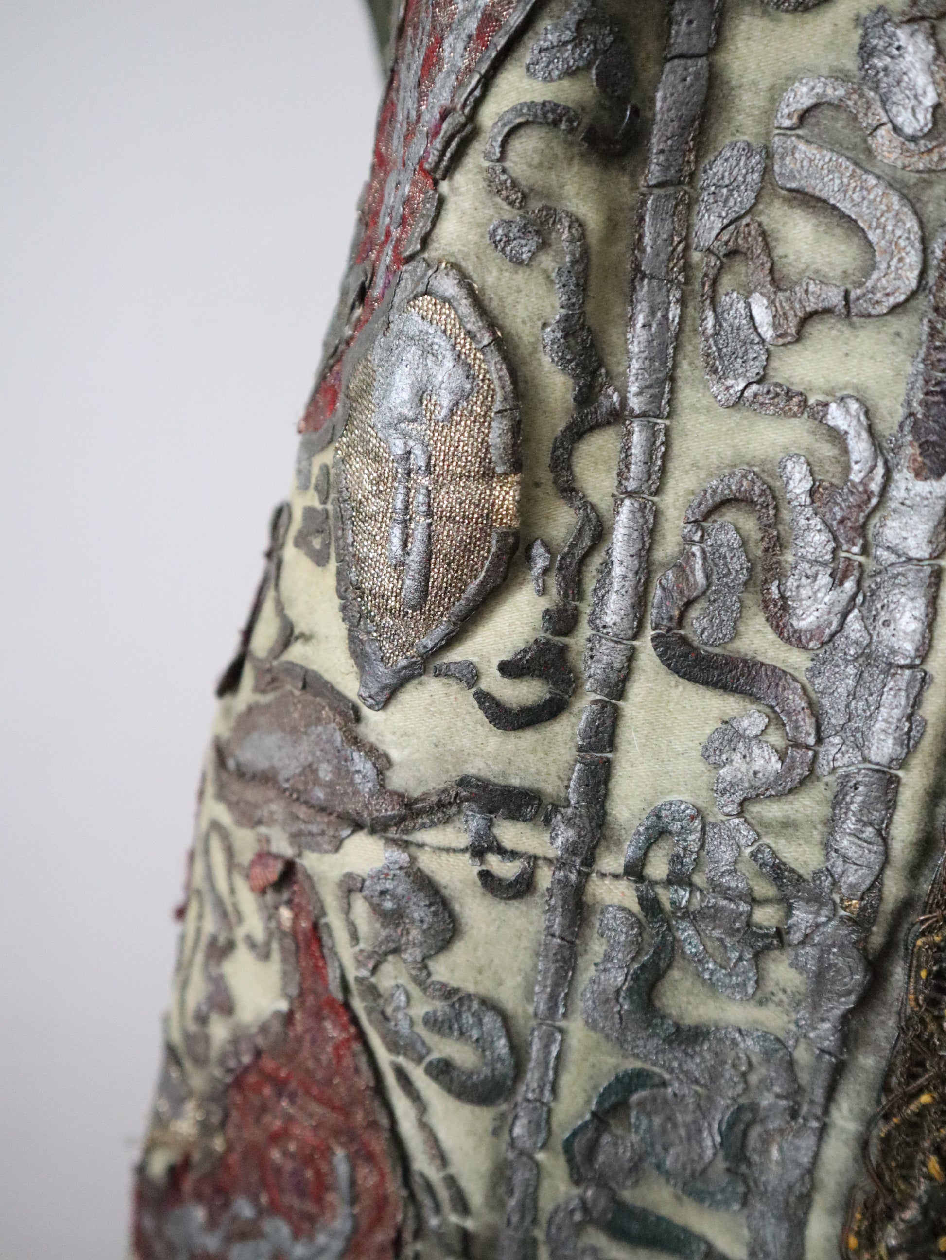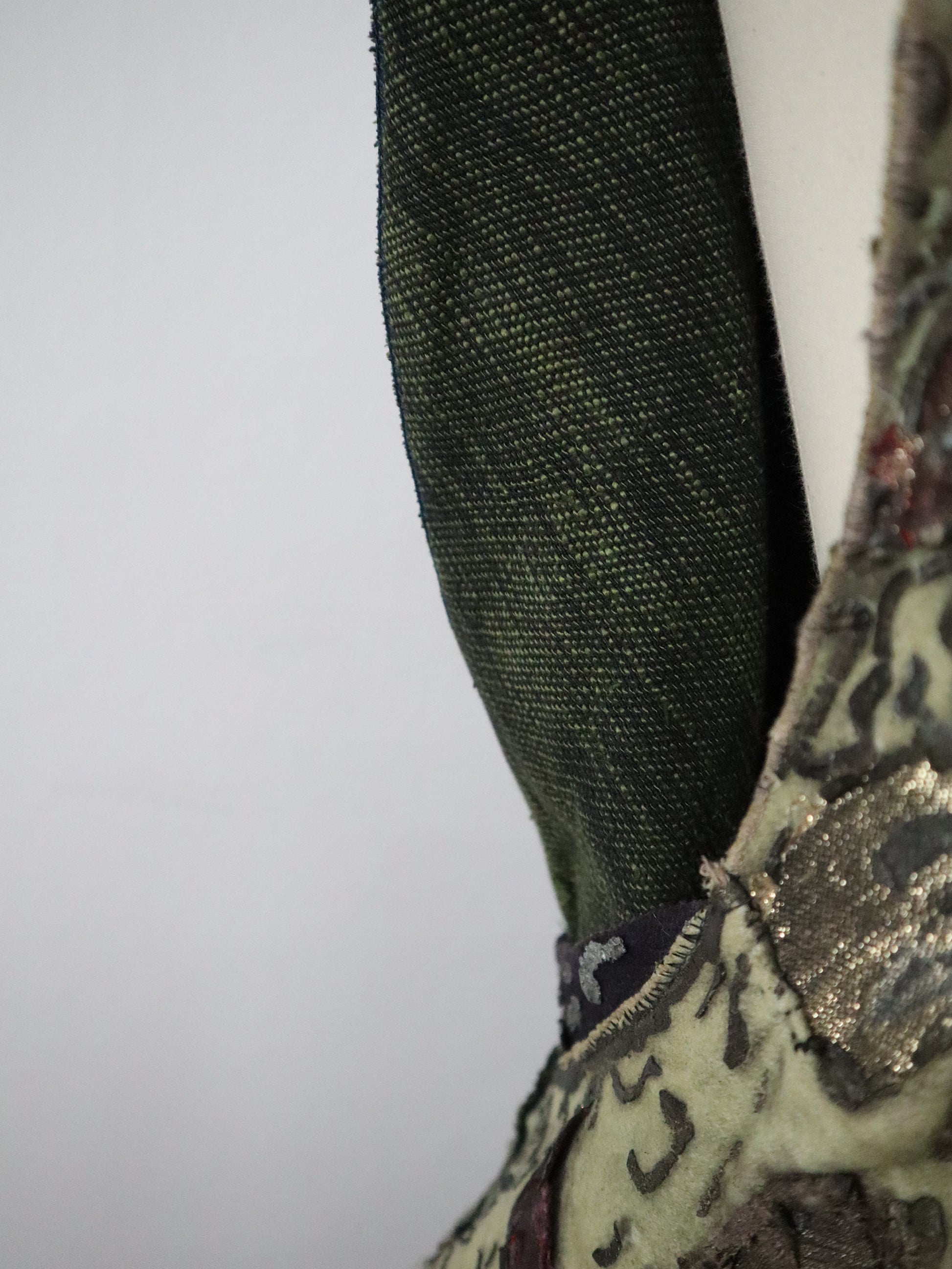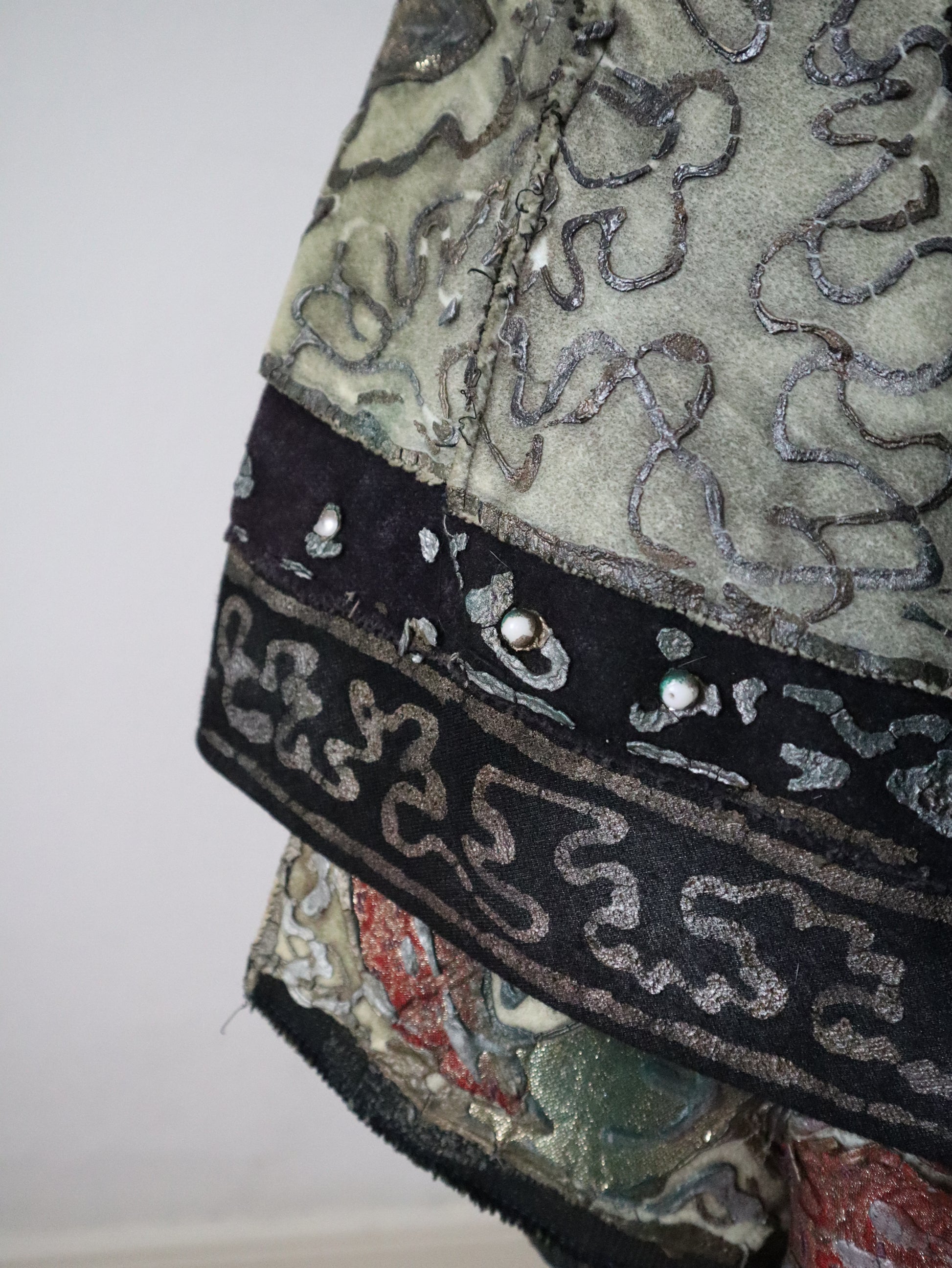 French opera costume made for the character of Mercutio in Romeo and Juliet. This tunic has many techniques including hand painted metallic fabric paint which is raised and textured. Appliqué gold and metallic red tone sections. Gold metal ribbon trim down the centre which is embellished with plastic golden and pearl beads.its wraps and ties from the sides.