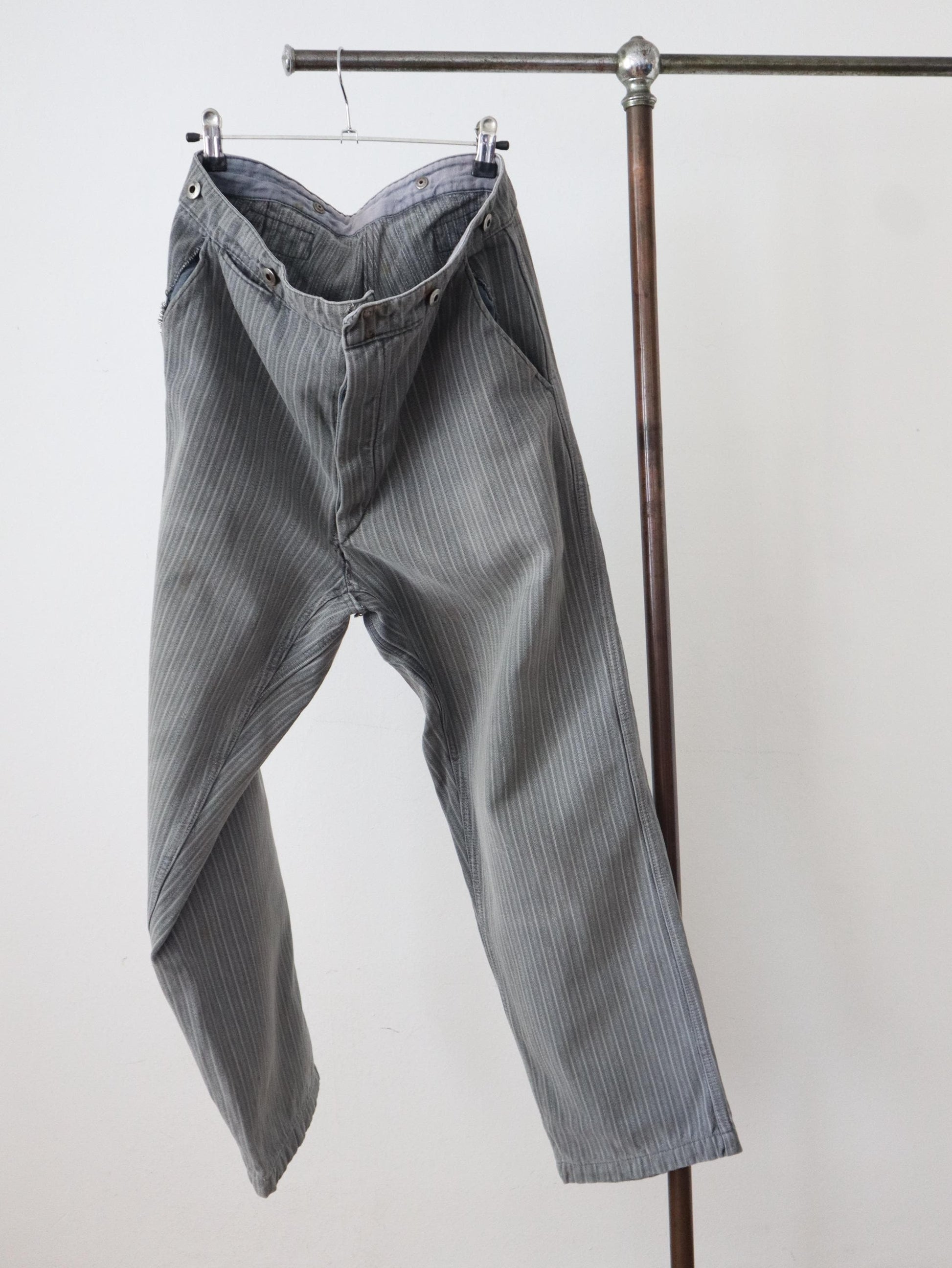 C.1950s French workwear trousers in grey striped cotton. A classic mid-century workwear cut, with metal buttons at the waist for braces and a cinch back with a metal buckle. Side pockets and a single back pocket with flap.