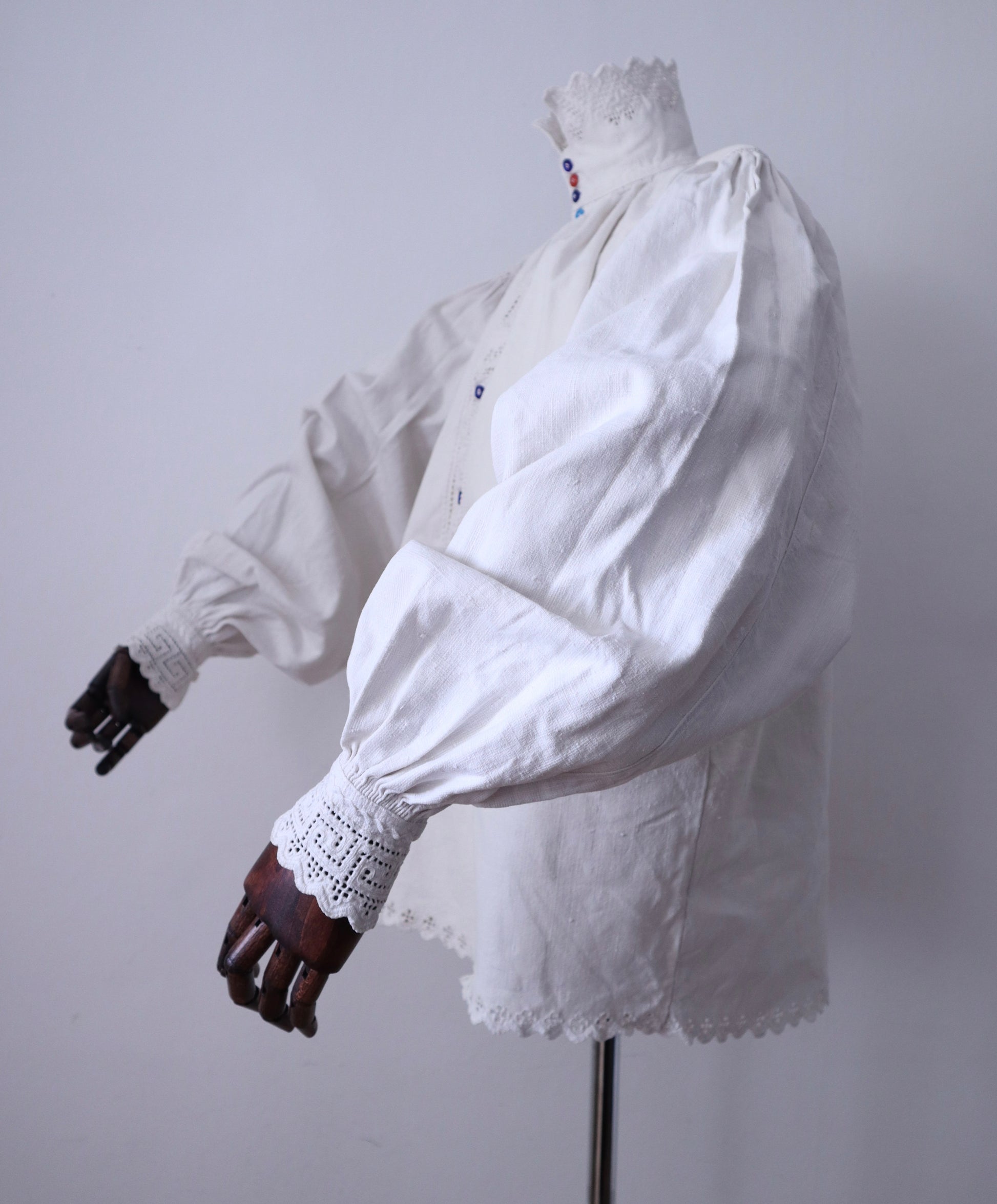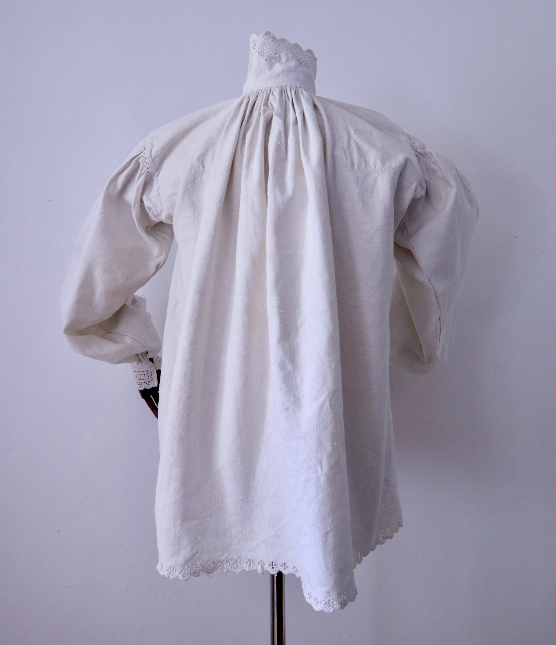Handwoven Transylvanian Linen Folk Blouse with Cutwork Embroidery and Pressed Glass Buttons 1930s 1940s