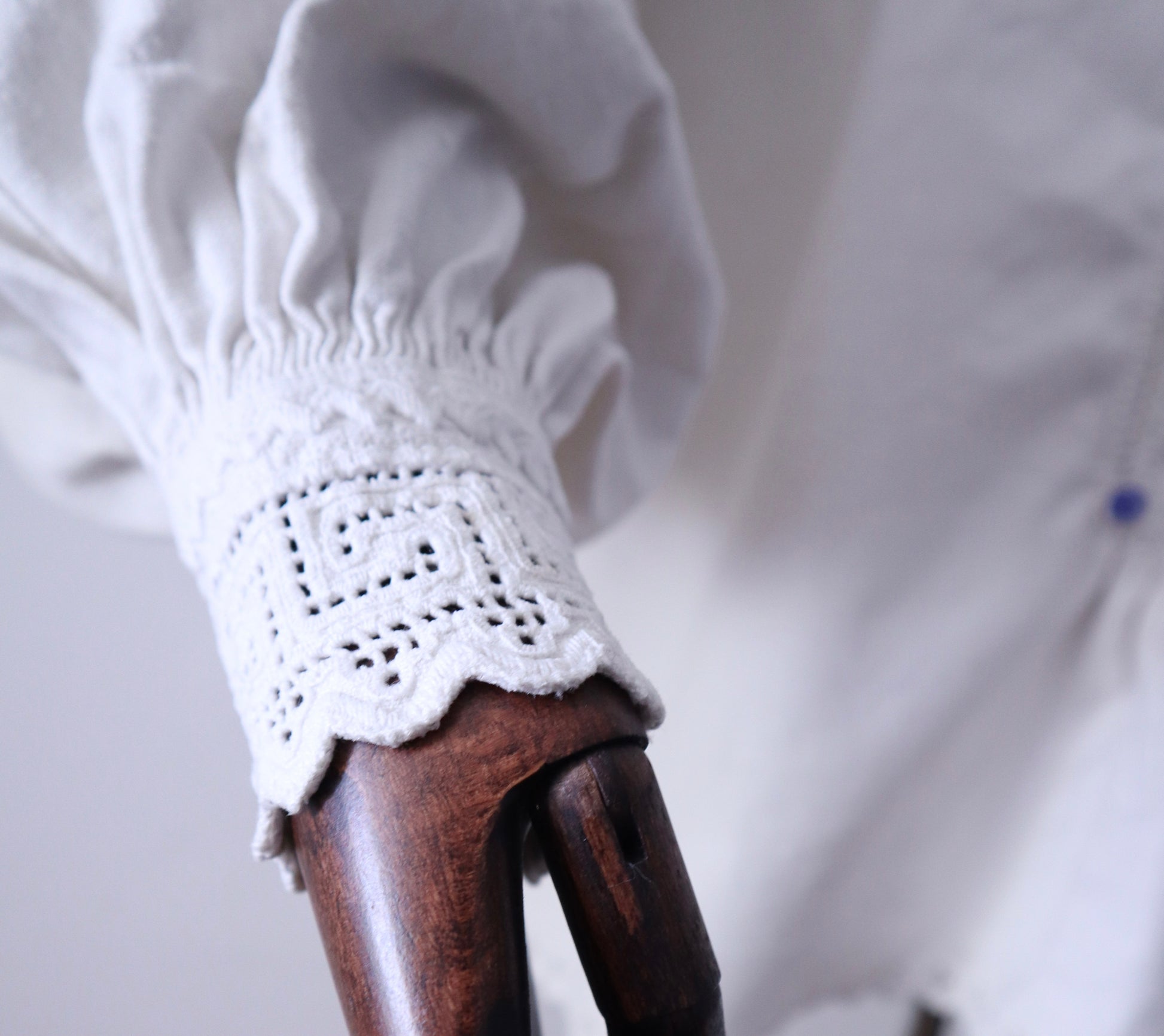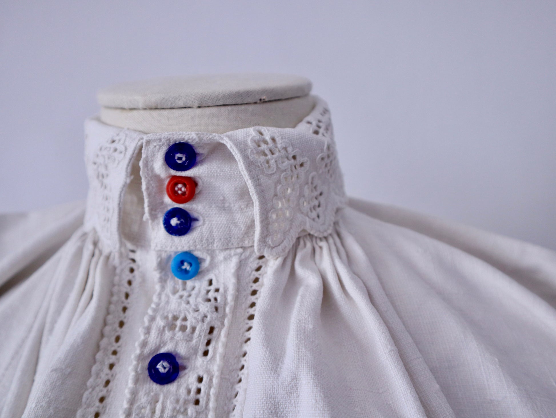It features decorative white cutwork embroidery along the front placket, high standing collar, and wide cuffs. Pressed glass buttons in tones of red, blue and turquoise finish the front closure. The collar can be worn standing or folded down, depending on preference.