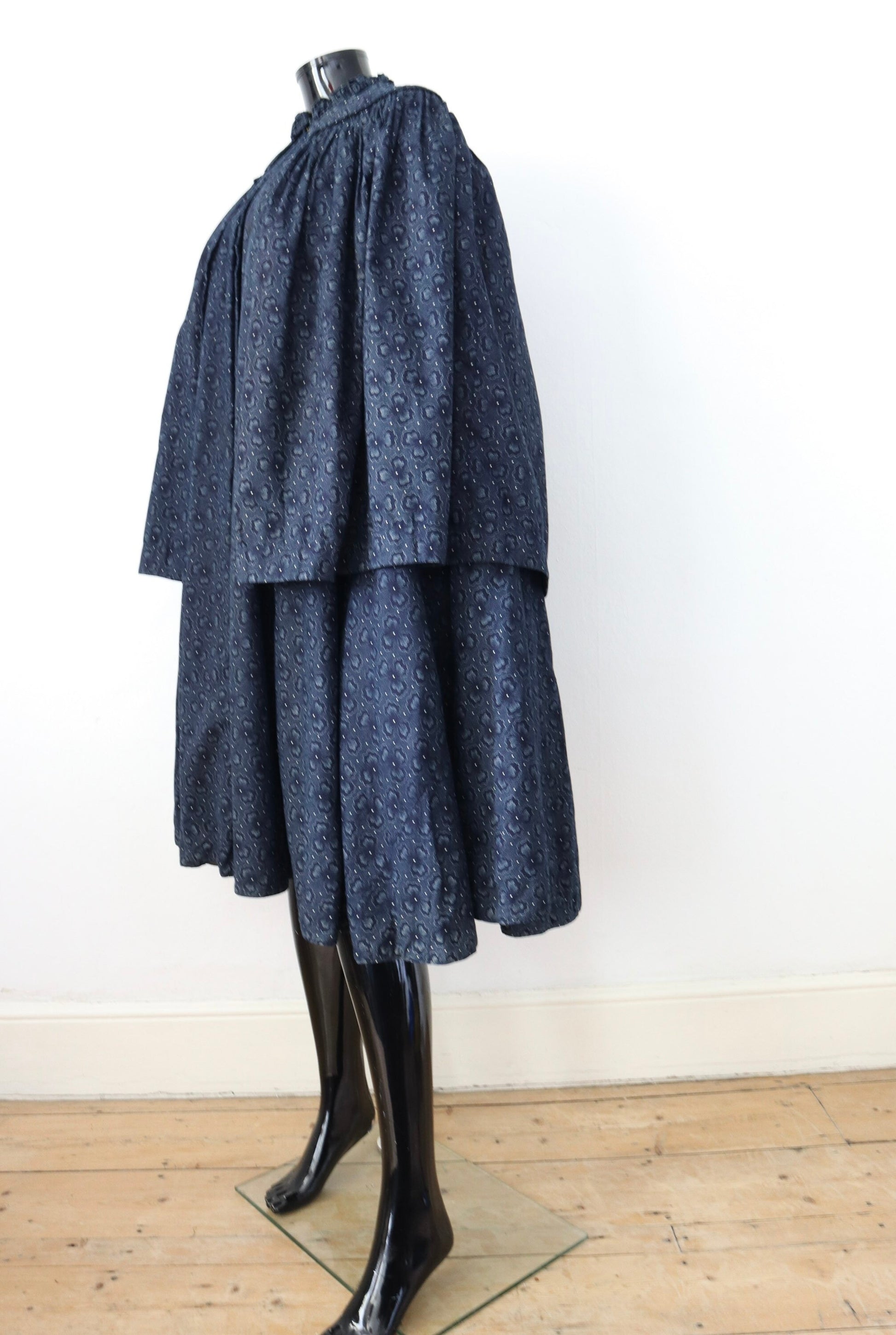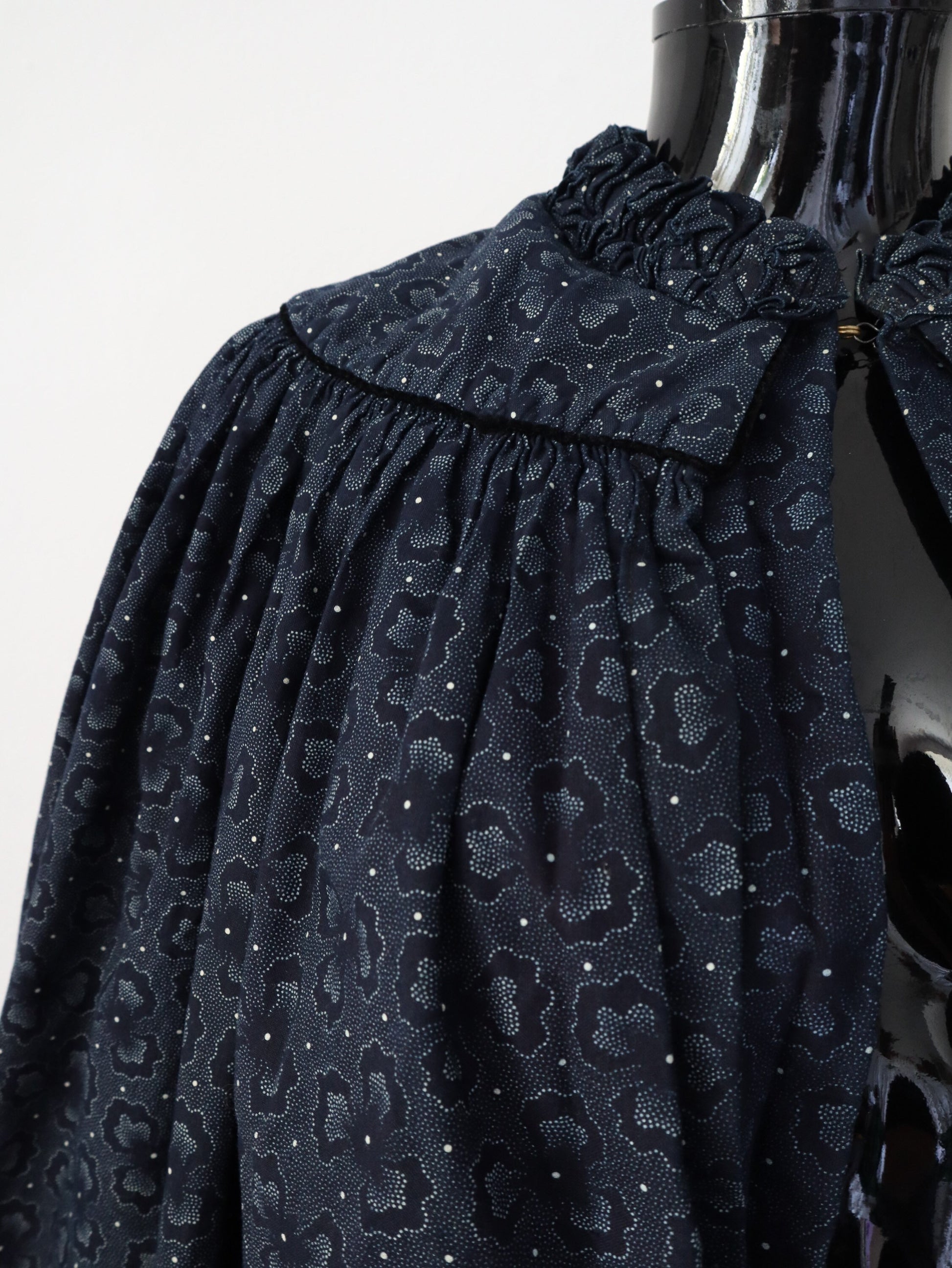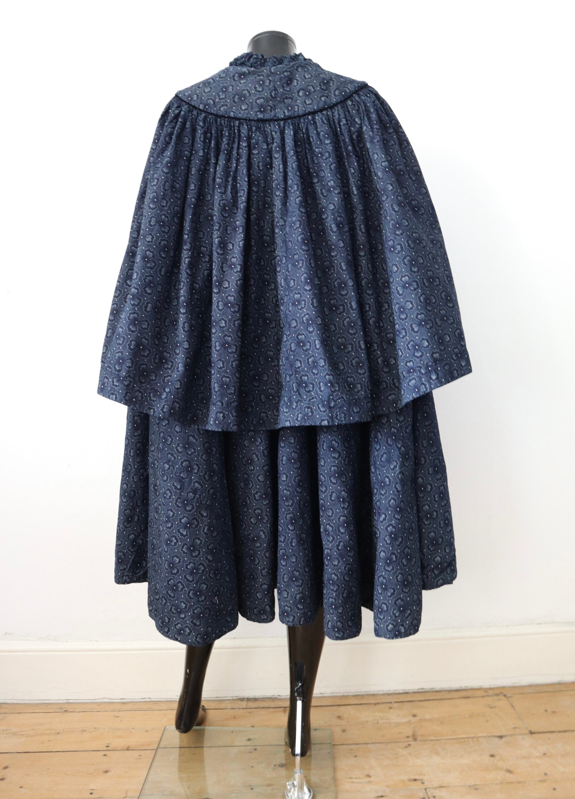 Beautiful 1880s indigo-dyed cotton cape from Germany featuring a traditional block print pattern, part of the historic Blaudruck resist-dyeing tradition. Soft woven wool lining, likely repurposed from a blanket. Ruffle collar and hook-and-eye front closure.