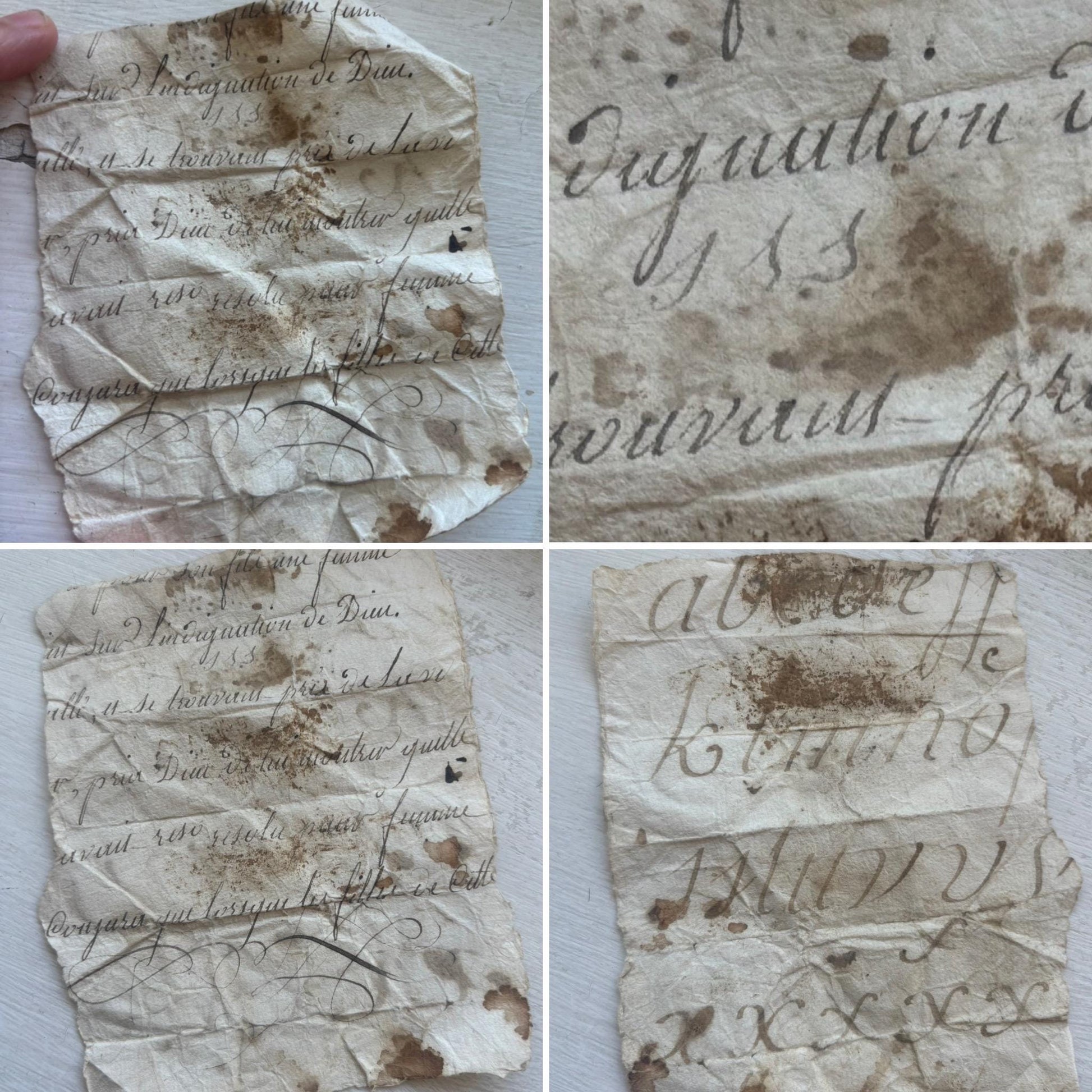 Sourced in France by myself. I was very excited and delighted to find a folded handwritten French note, dating from the same period. This was discovered inside the interior pocket and will be included in the sale. One side of the note contains a carefully written alphabet, while the other features lines of religious or moral text in French, likely copied as part of handwriting exercises. The use of laid paper, brown ink, and the distinctive flourish at the foot of the text are characteristic of early 19th-century penmanship practice.