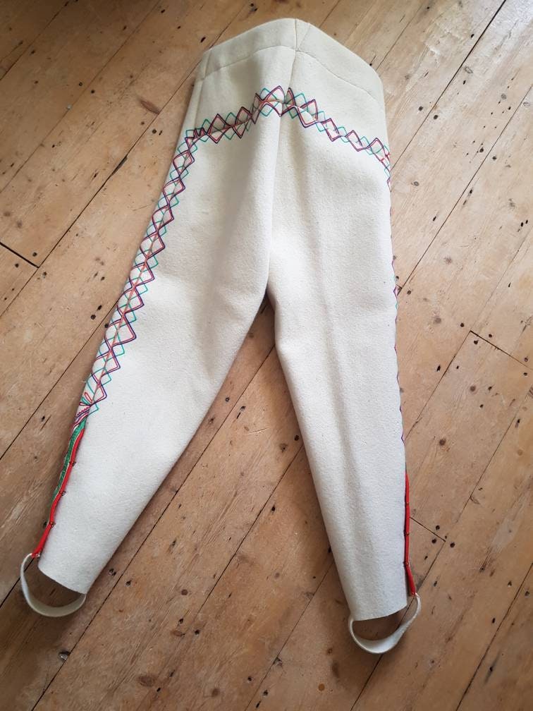 Slovakian wool folkwear trousers. These are traditional clothing worn by men in Slovakia. Colourful wool threads are embroidered in decorative designs on the front and down each leg. The lower legs have brass hook and eye fastenings. One front pocket with embroidered floral ribbon trim. The front section is open ready to thread through a belt. Foot stirrups.