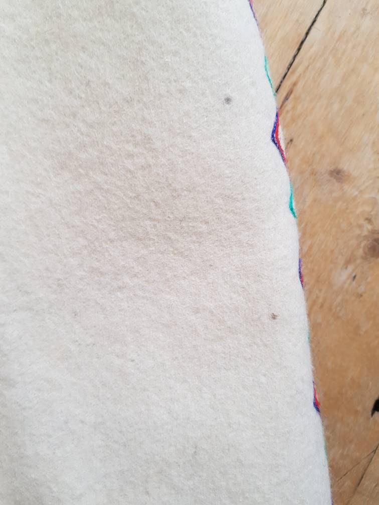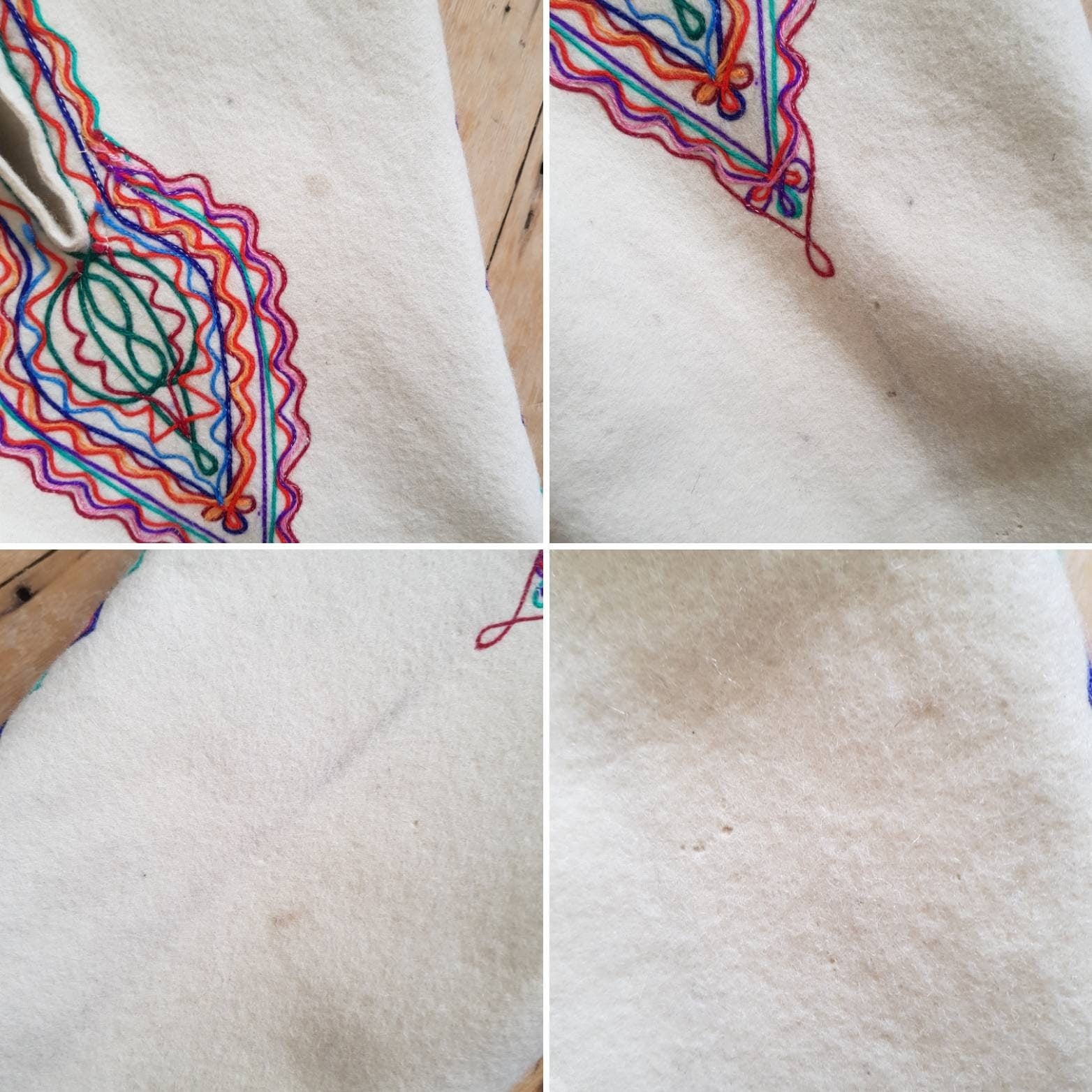 Great condition overall. There are a few marks and a few moth nibbles. These have been steamed.