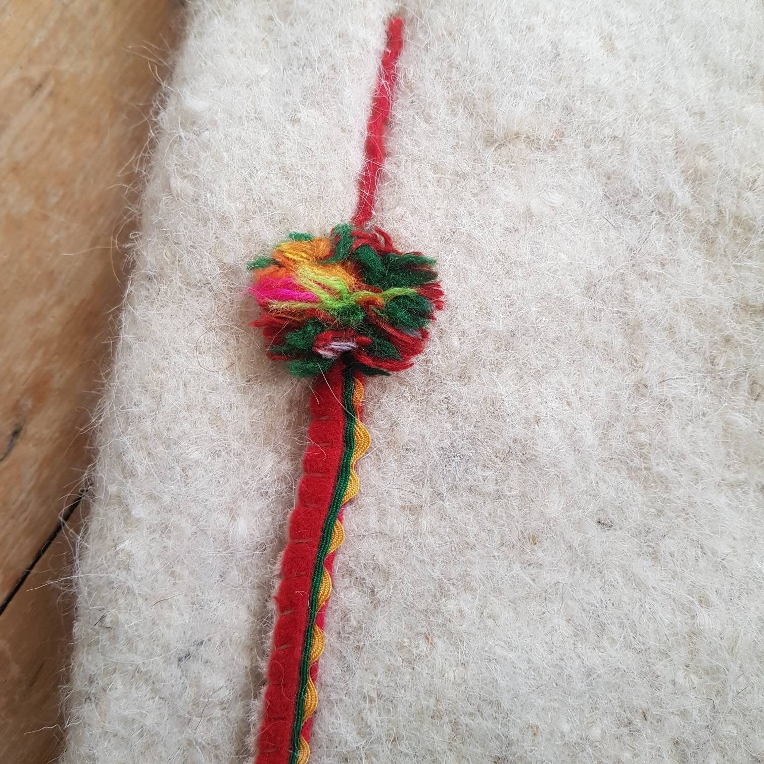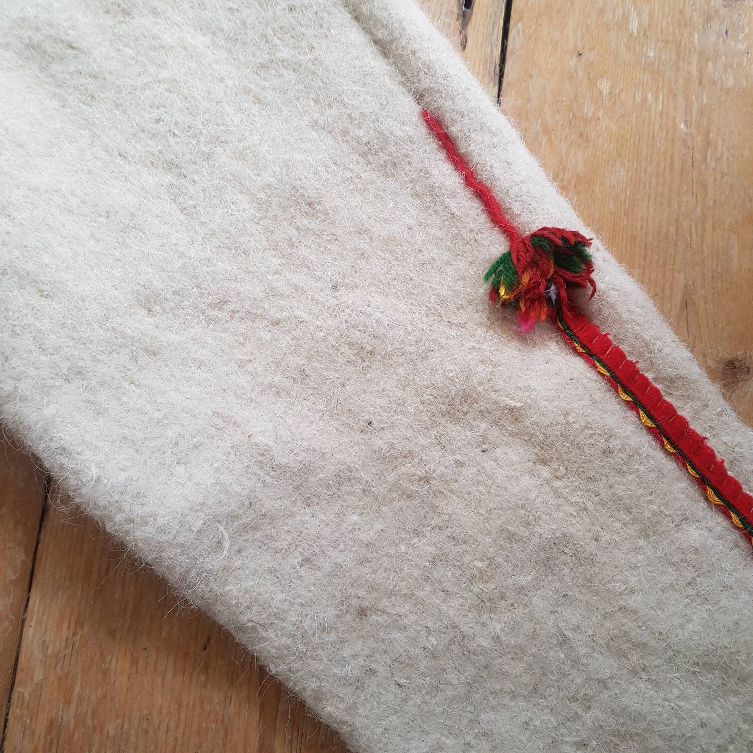 Amazing c.1930s Slovakian wool folkwear trousers. These are traditional clothing worn by men in Slovakia. Great ribbon trim with pompoms. The front section is open ready to thread through a belt. More of a collectors piece rather than something to wear. They are fairly heavy and unlined.