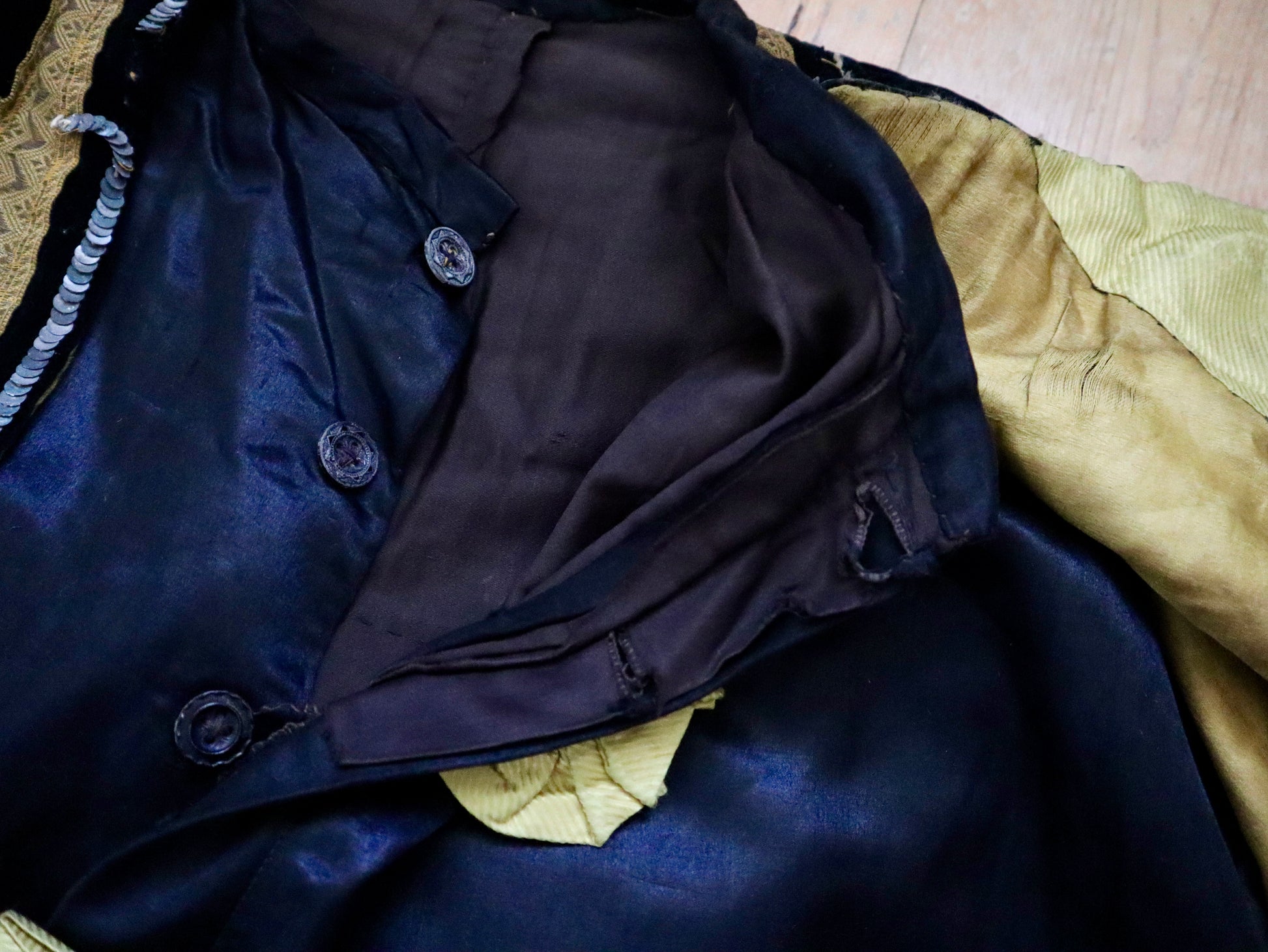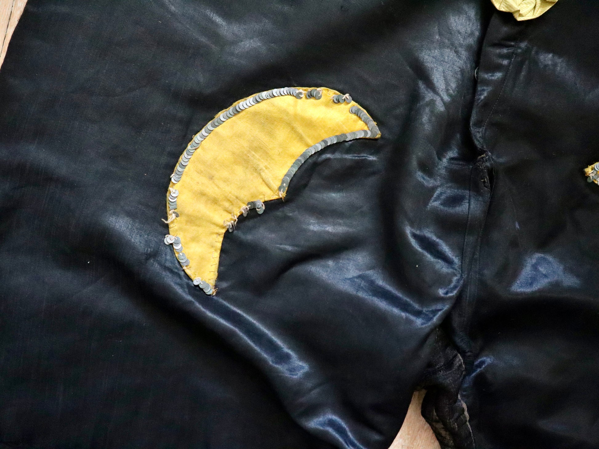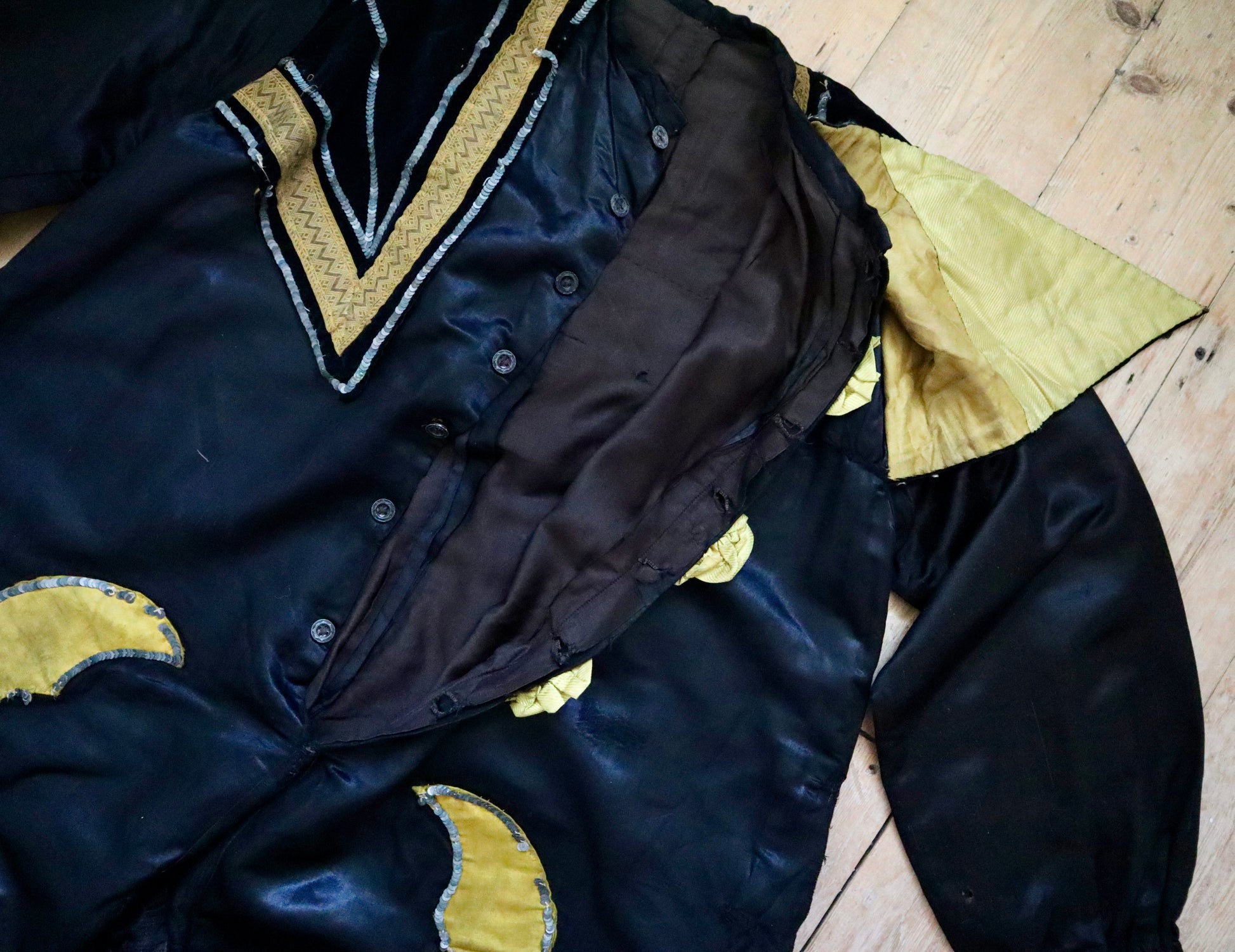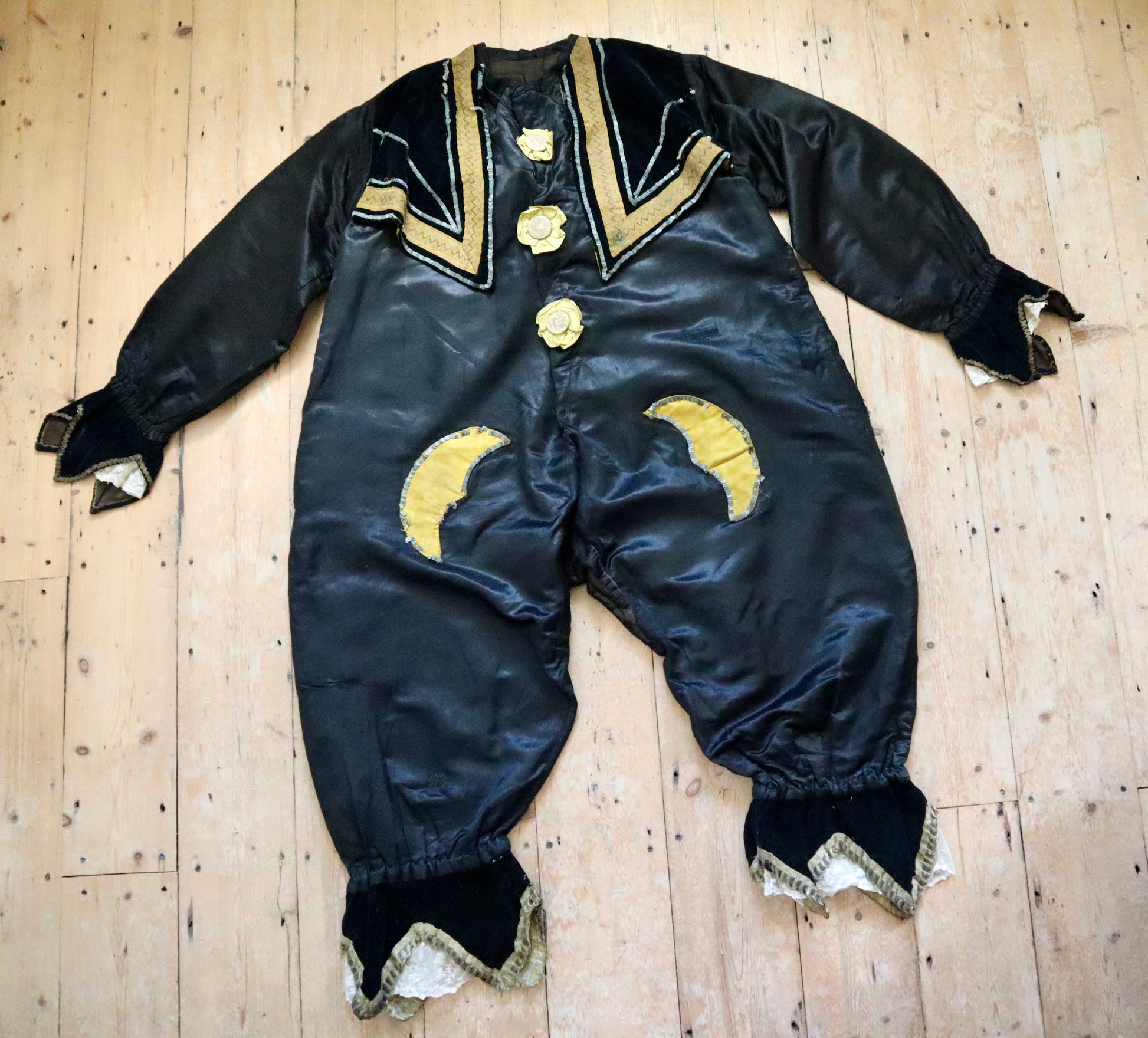 This rare French clown costume from the 1910s–1920s is a beautifully hand-stitched piece made from black silk with a brown cotton lining. The legs are decorated with appliquéd moons, and the entire suit is trimmed with gold metal ribbon, antique lace, and sequins.