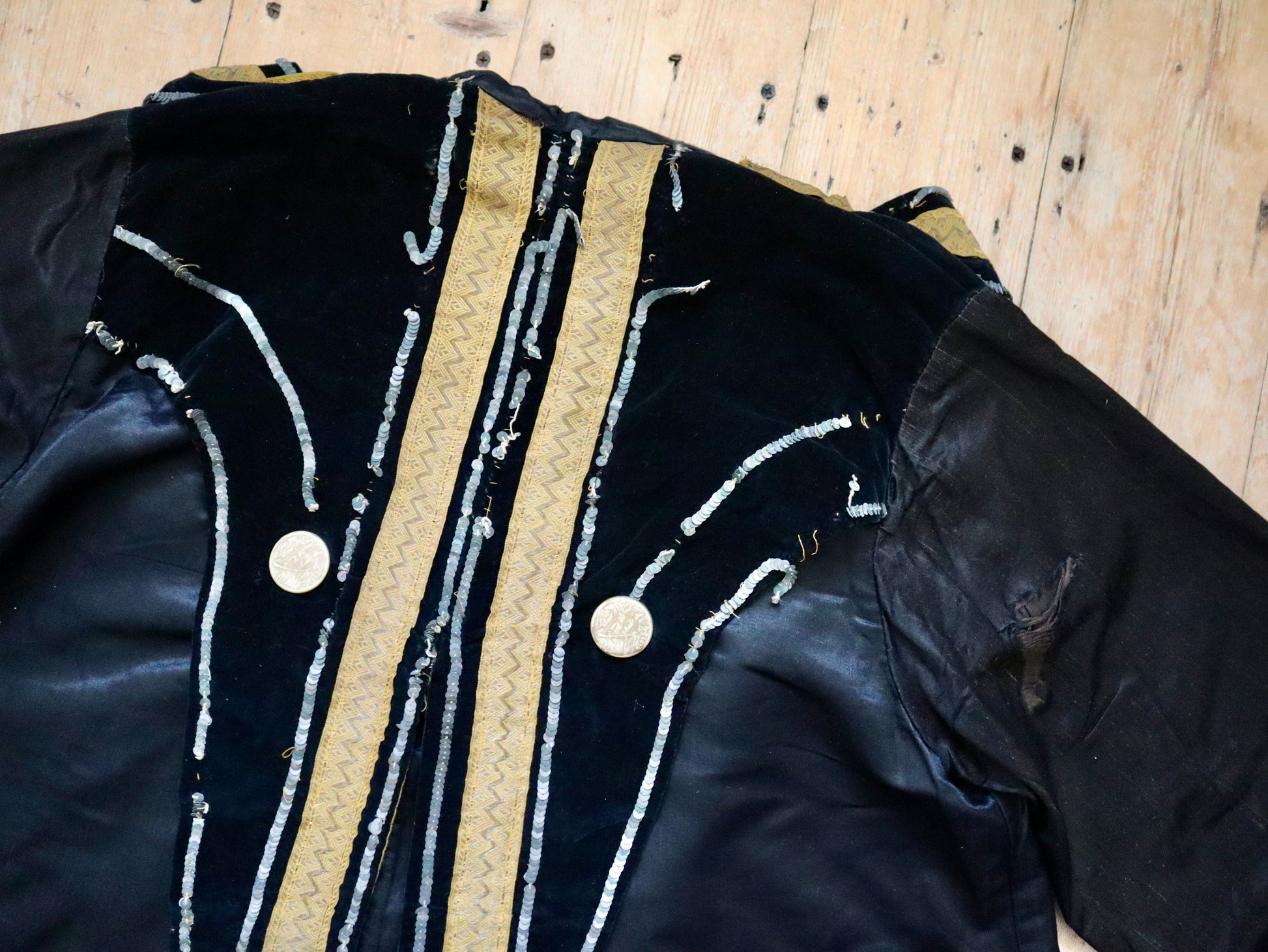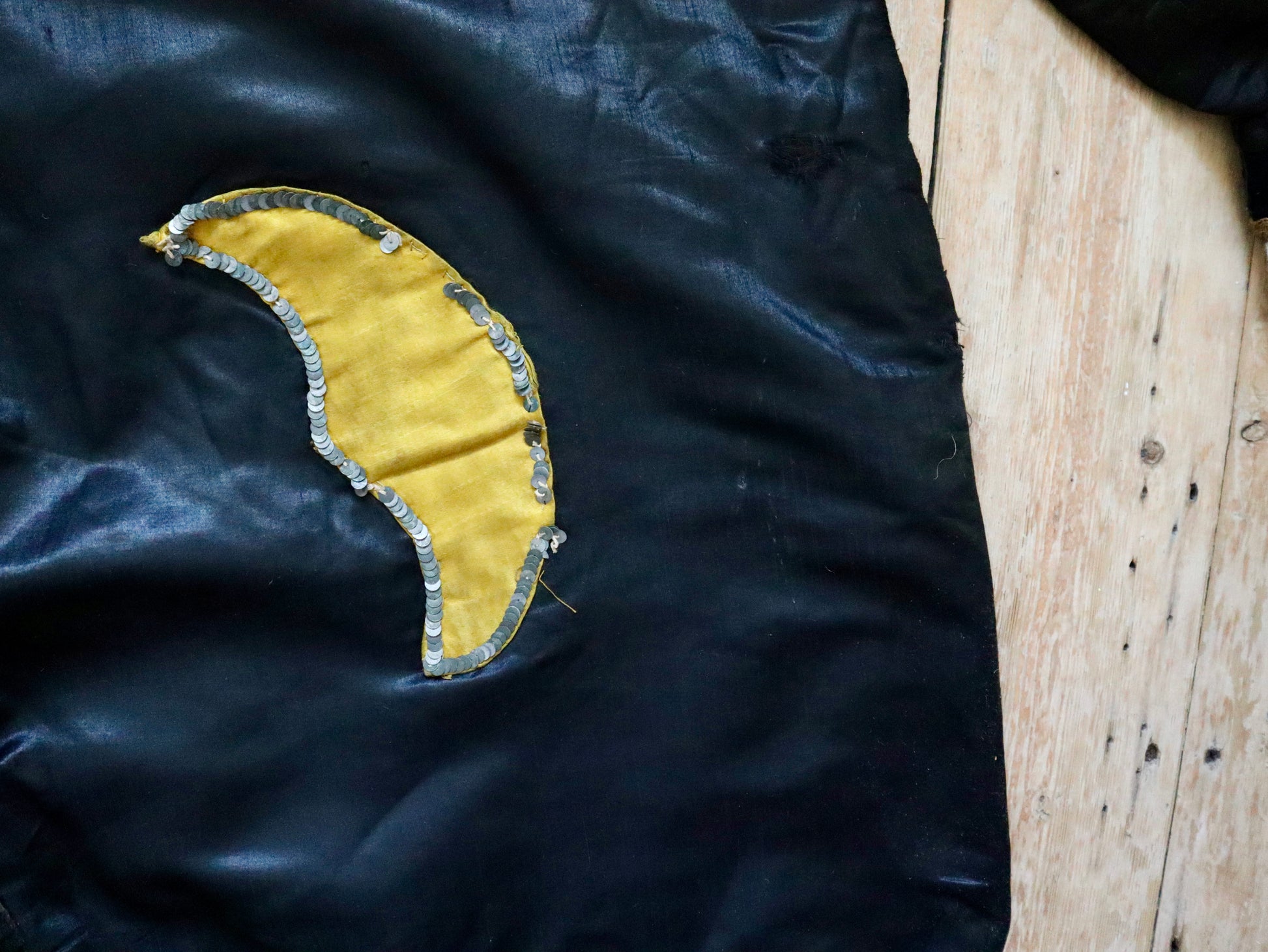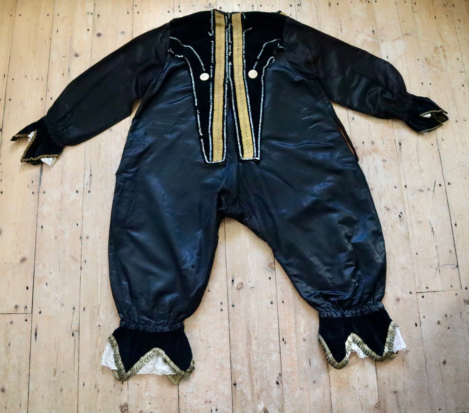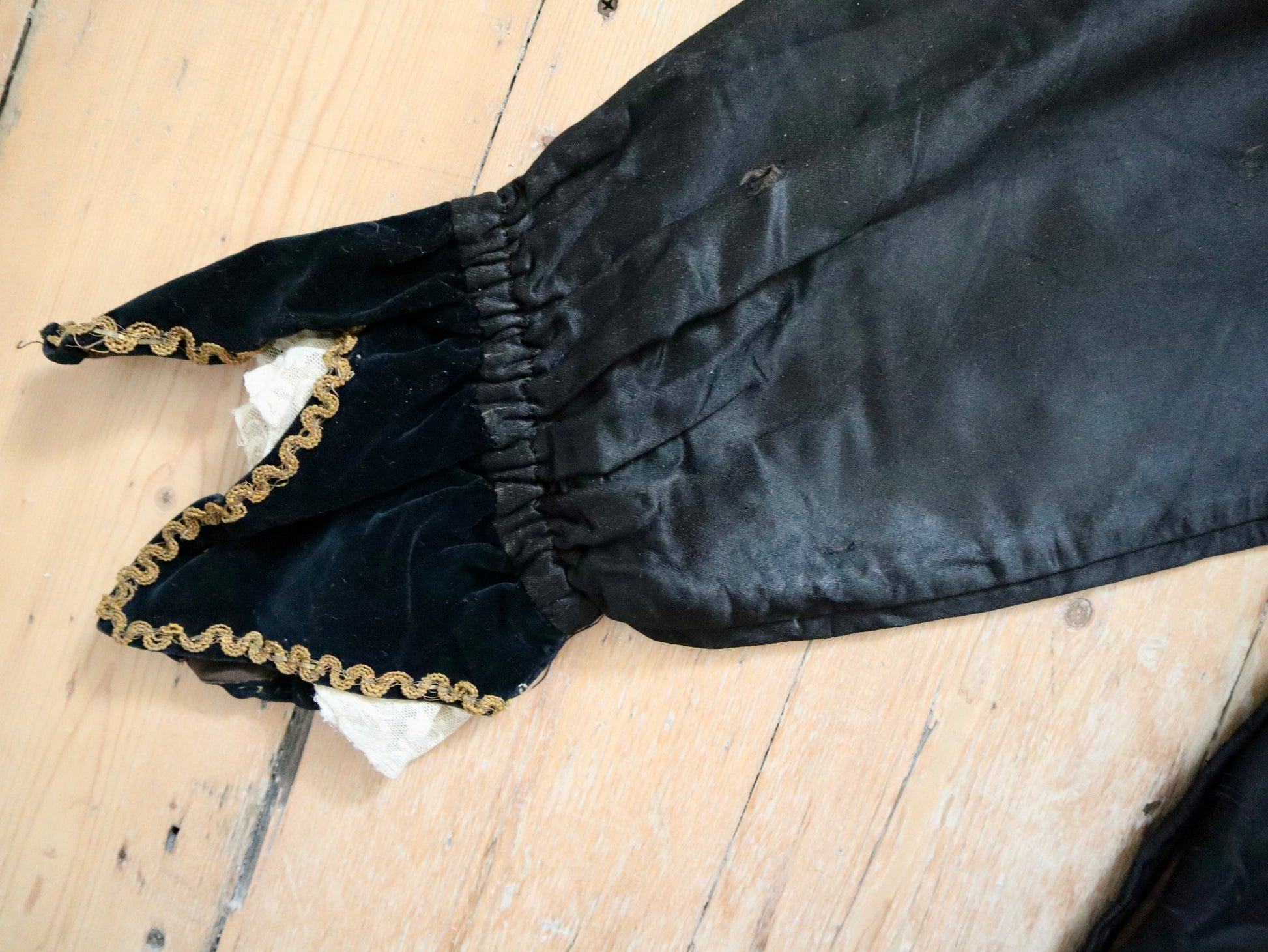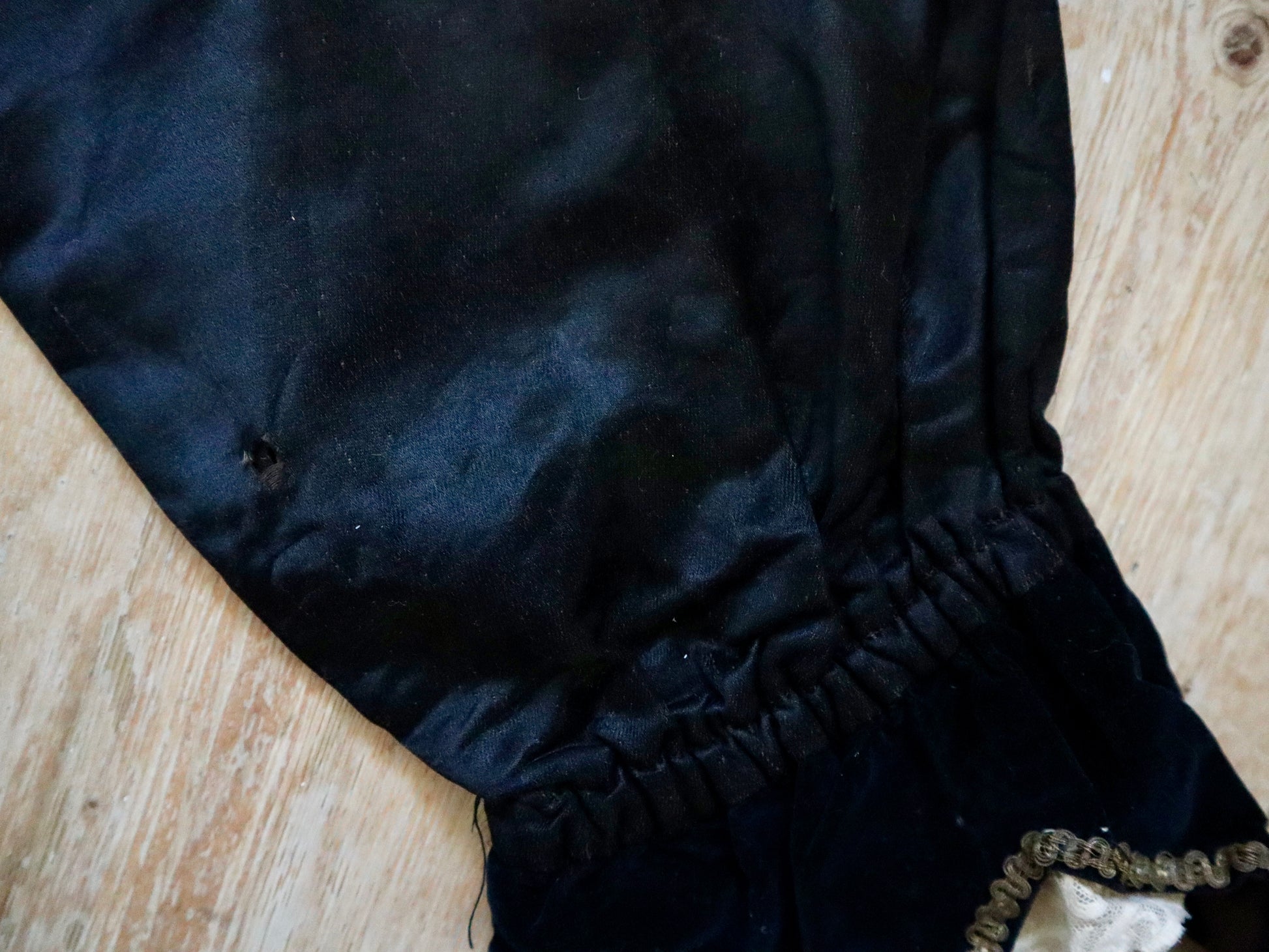 This rare French clown costume from the 1910s–1920s is a beautifully hand-stitched piece made from black silk with a brown cotton lining. The legs are decorated with appliquéd moons, and the entire suit is trimmed with gold metal ribbon, antique lace, and sequins.