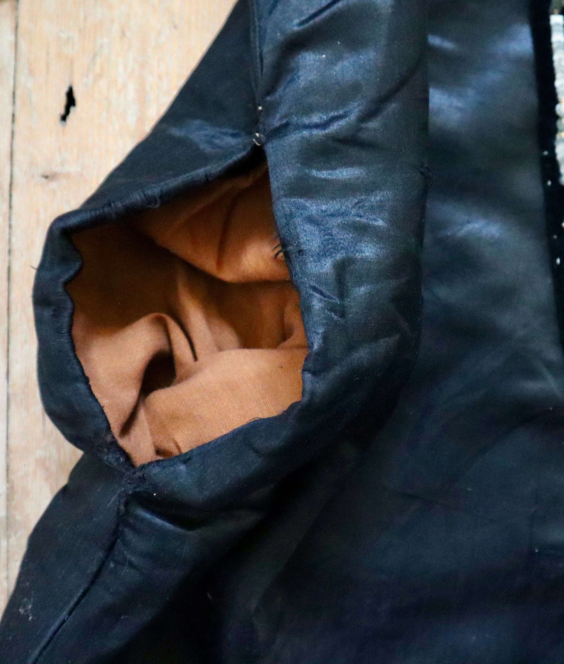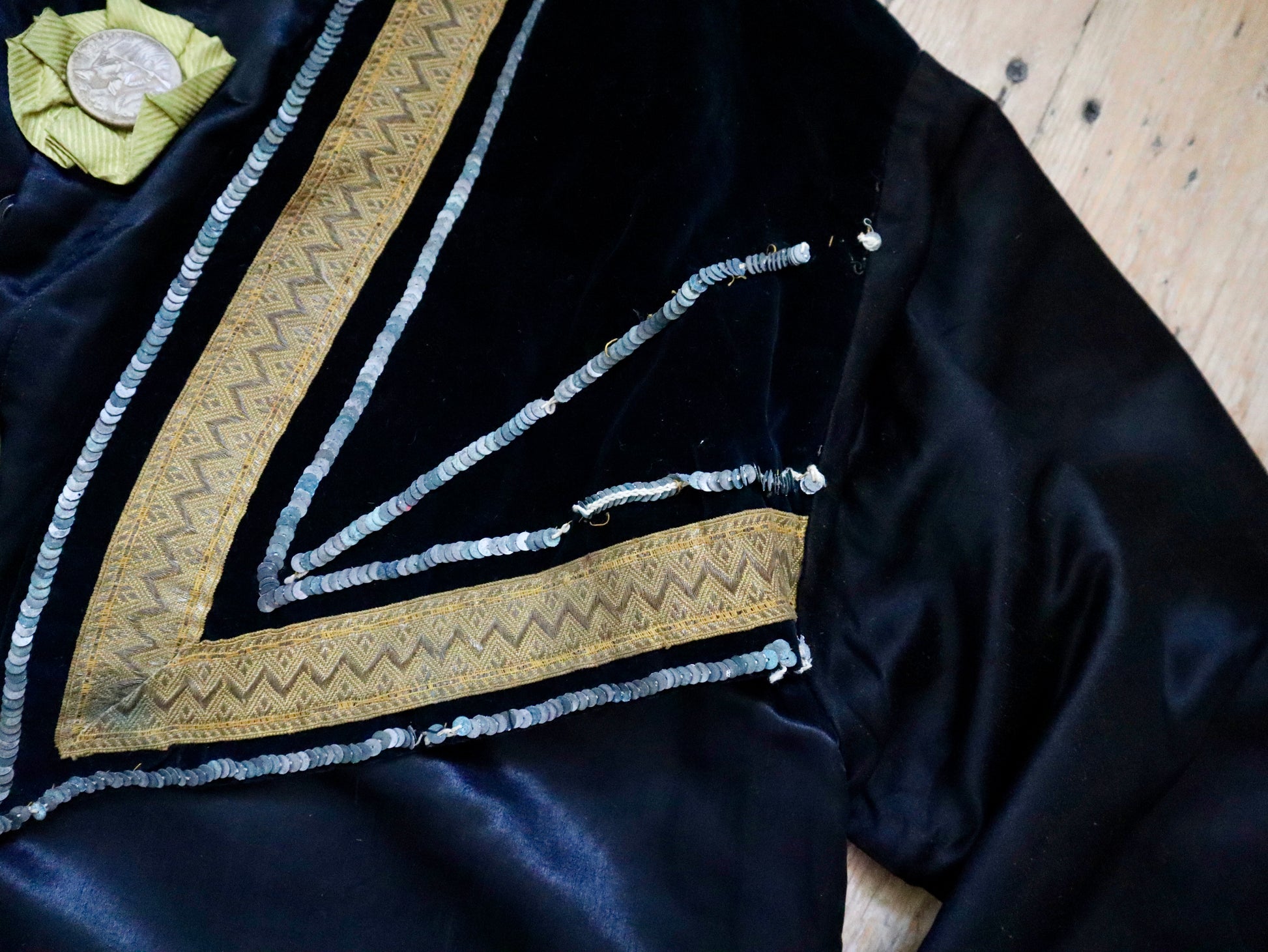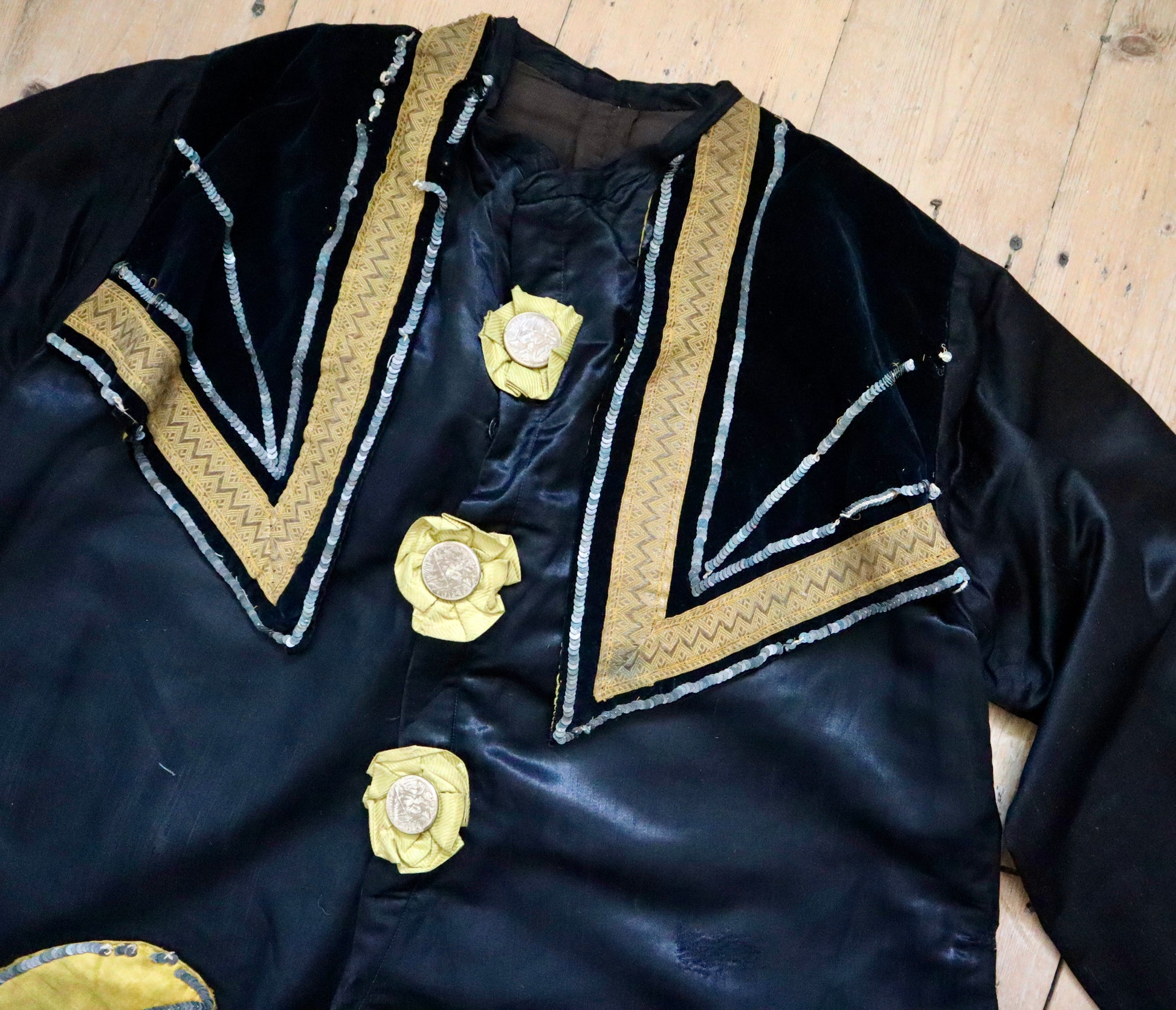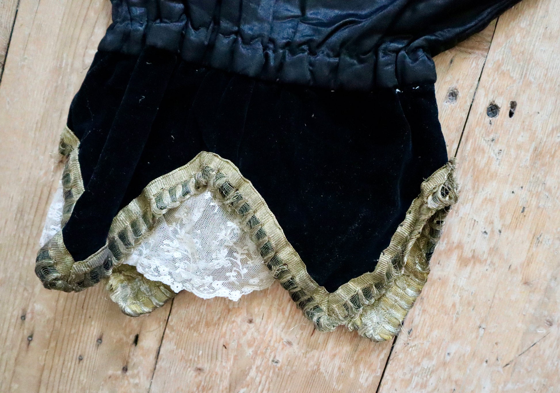 This rare French clown costume from the 1910s–1920s is a beautifully hand-stitched piece made from black silk with a brown cotton lining. The legs are decorated with appliquéd moons, and the entire suit is trimmed with gold metal ribbon, antique lace, and sequins.