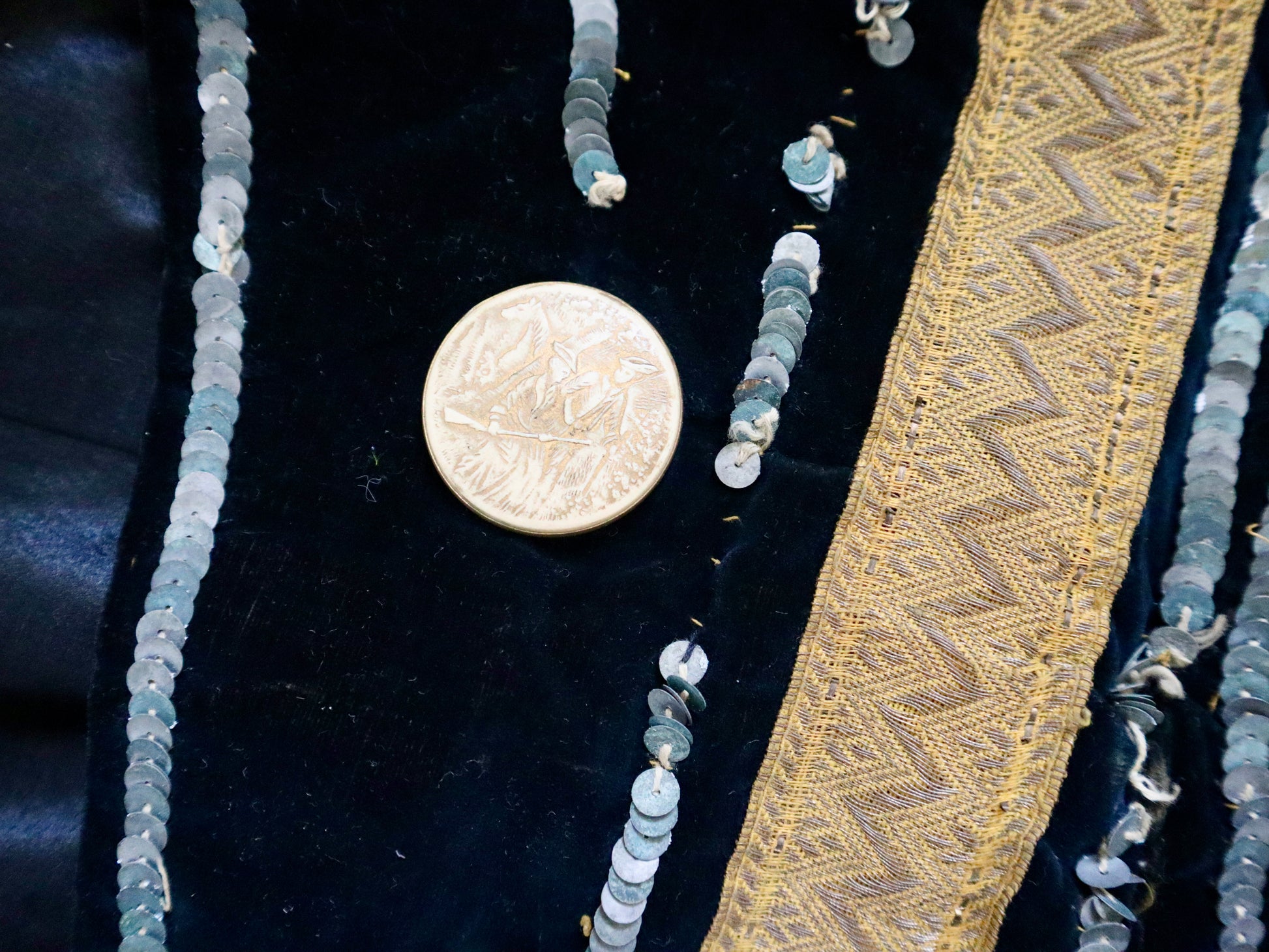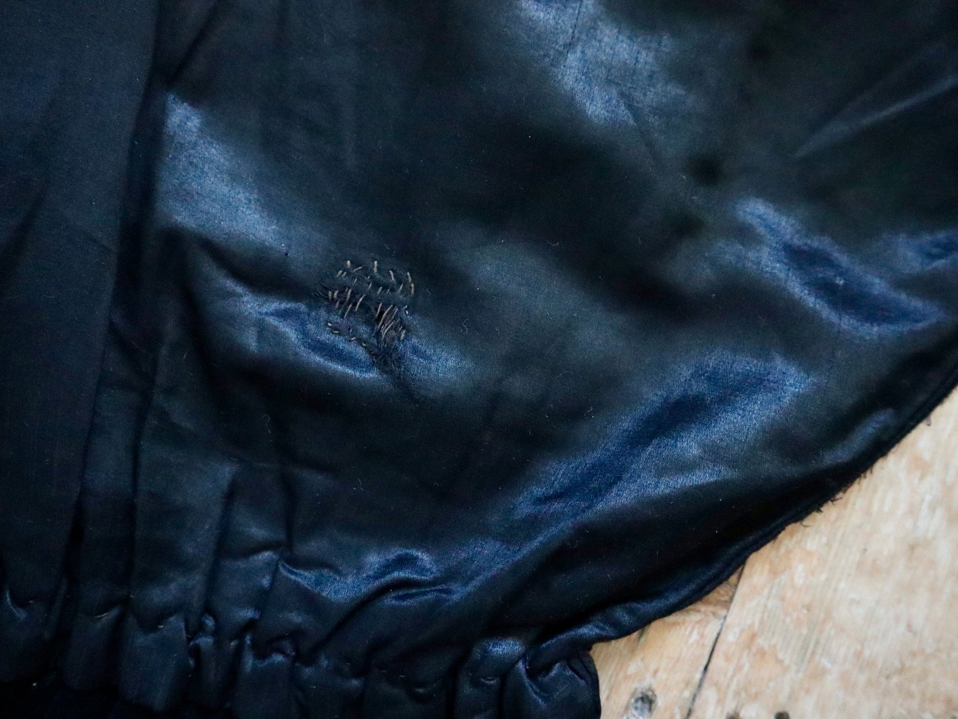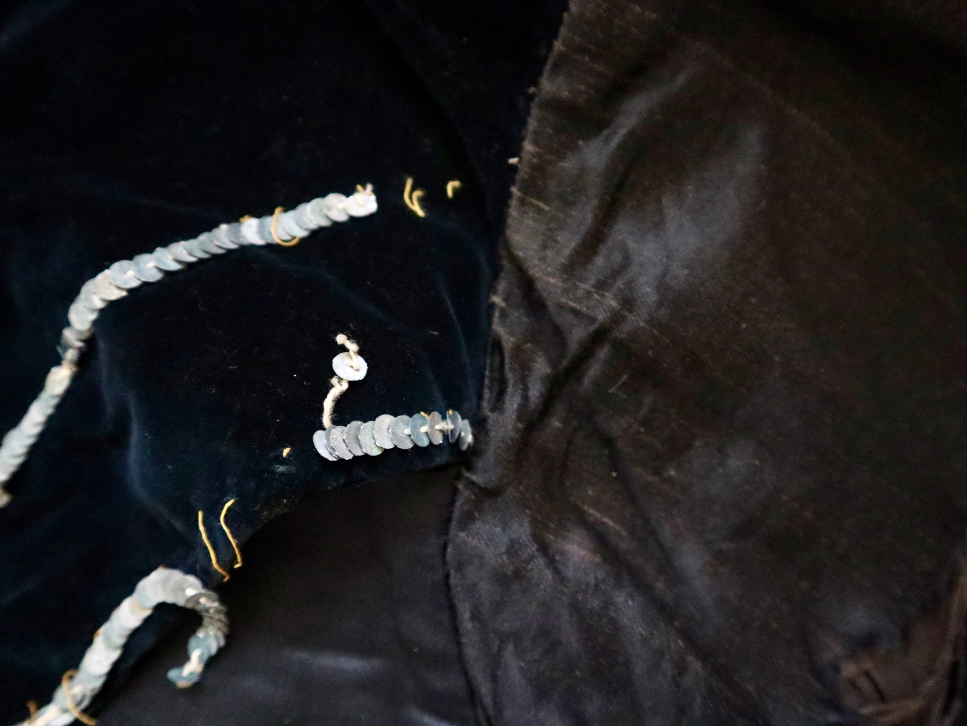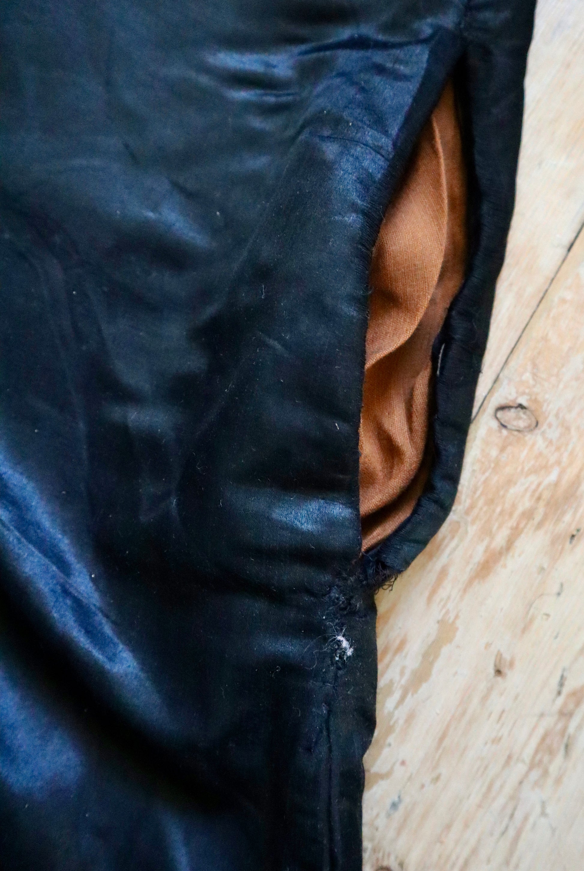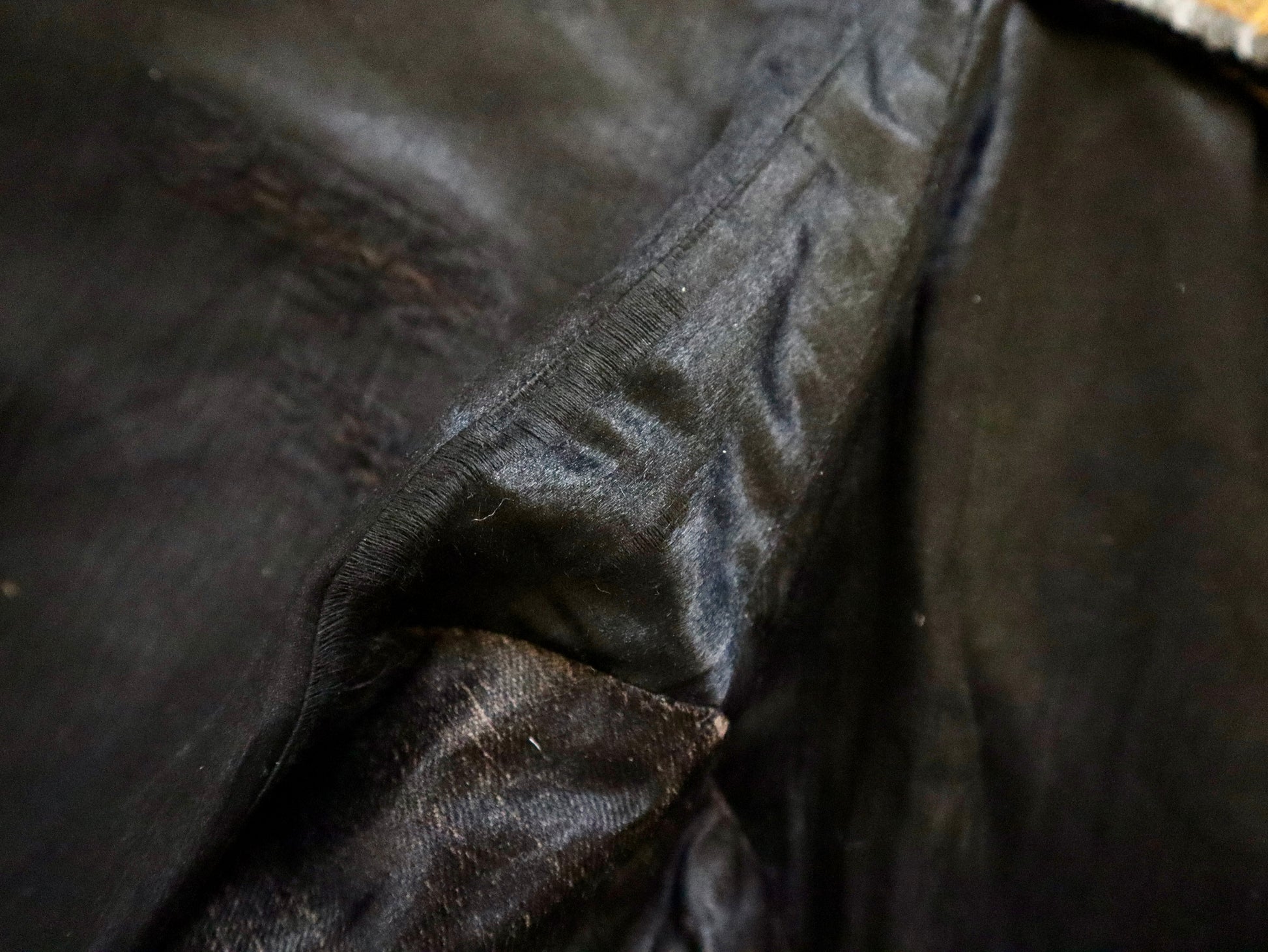 This rare French clown costume from the 1910s–1920s is a beautifully hand-stitched piece made from black silk with a brown cotton lining. The legs are decorated with appliquéd moons, and the entire suit is trimmed with gold metal ribbon, antique lace, and sequins.