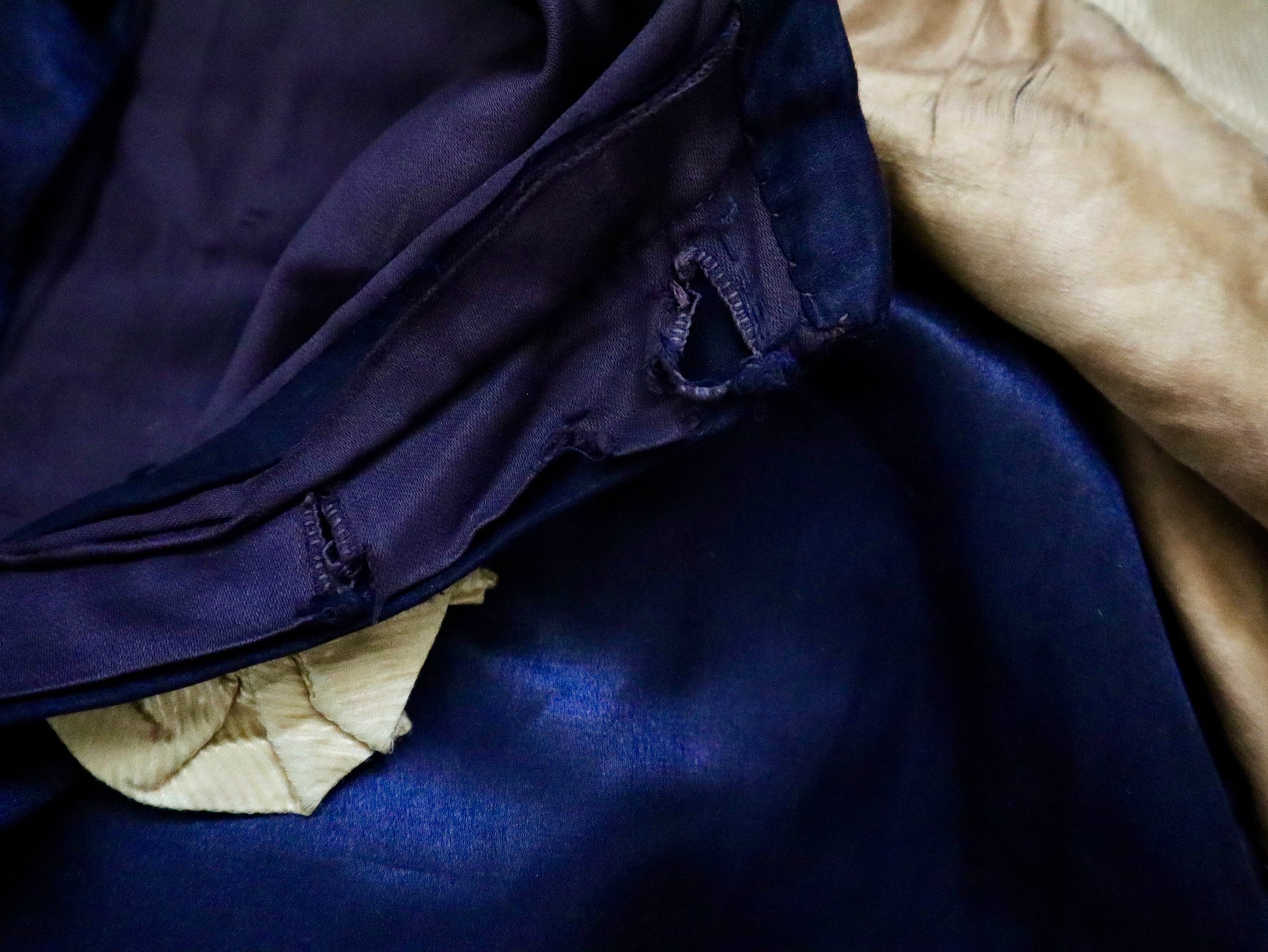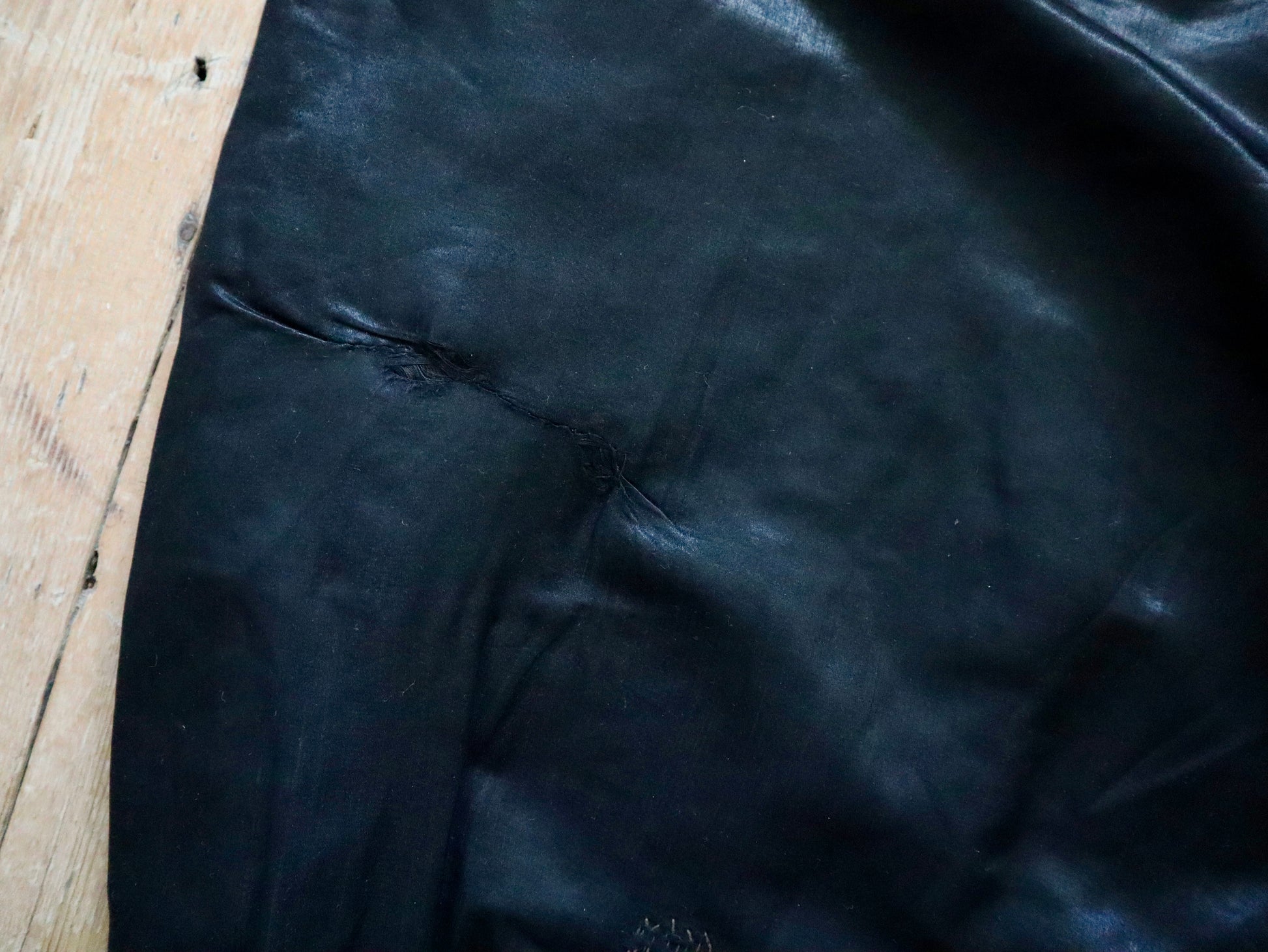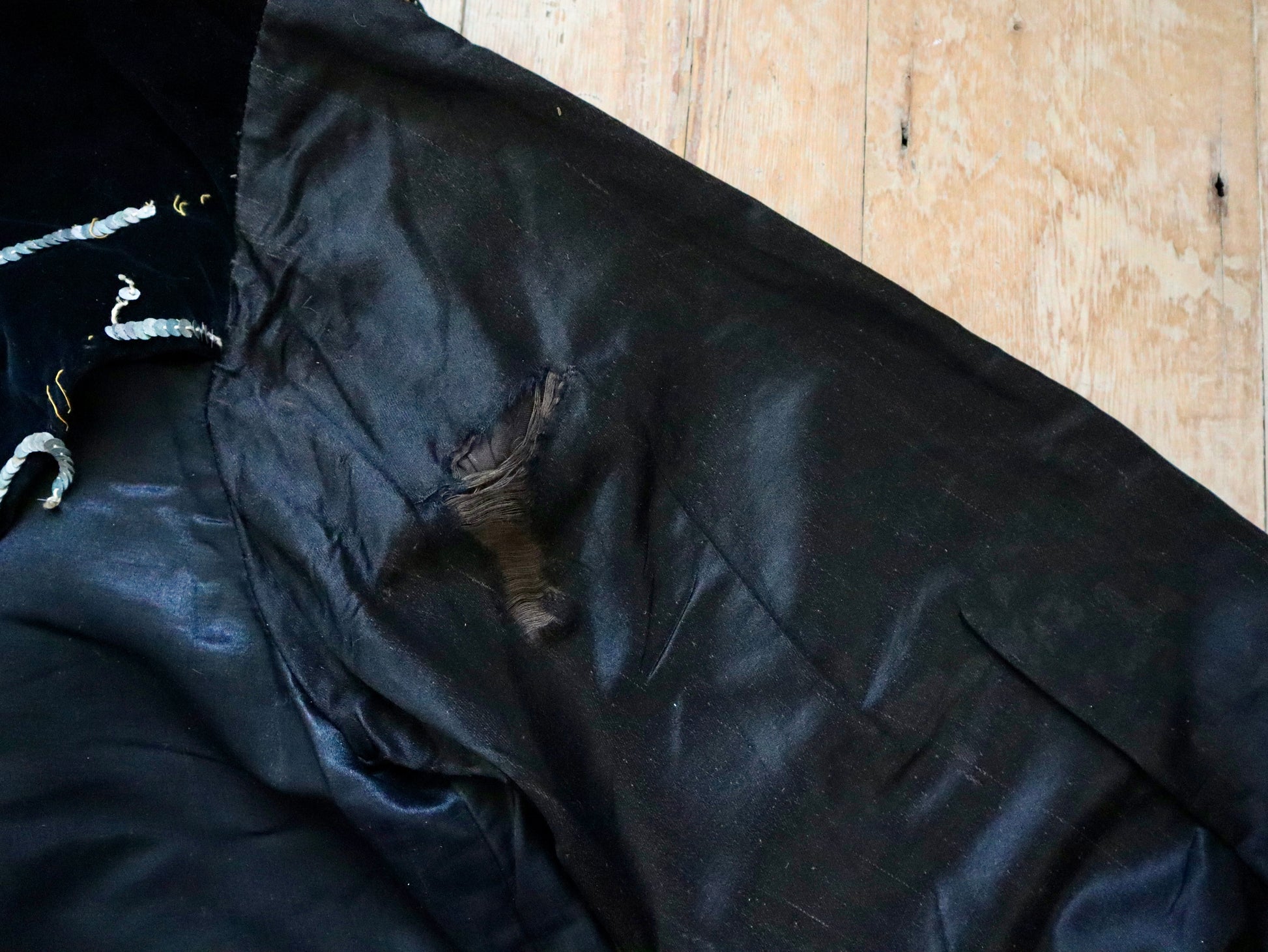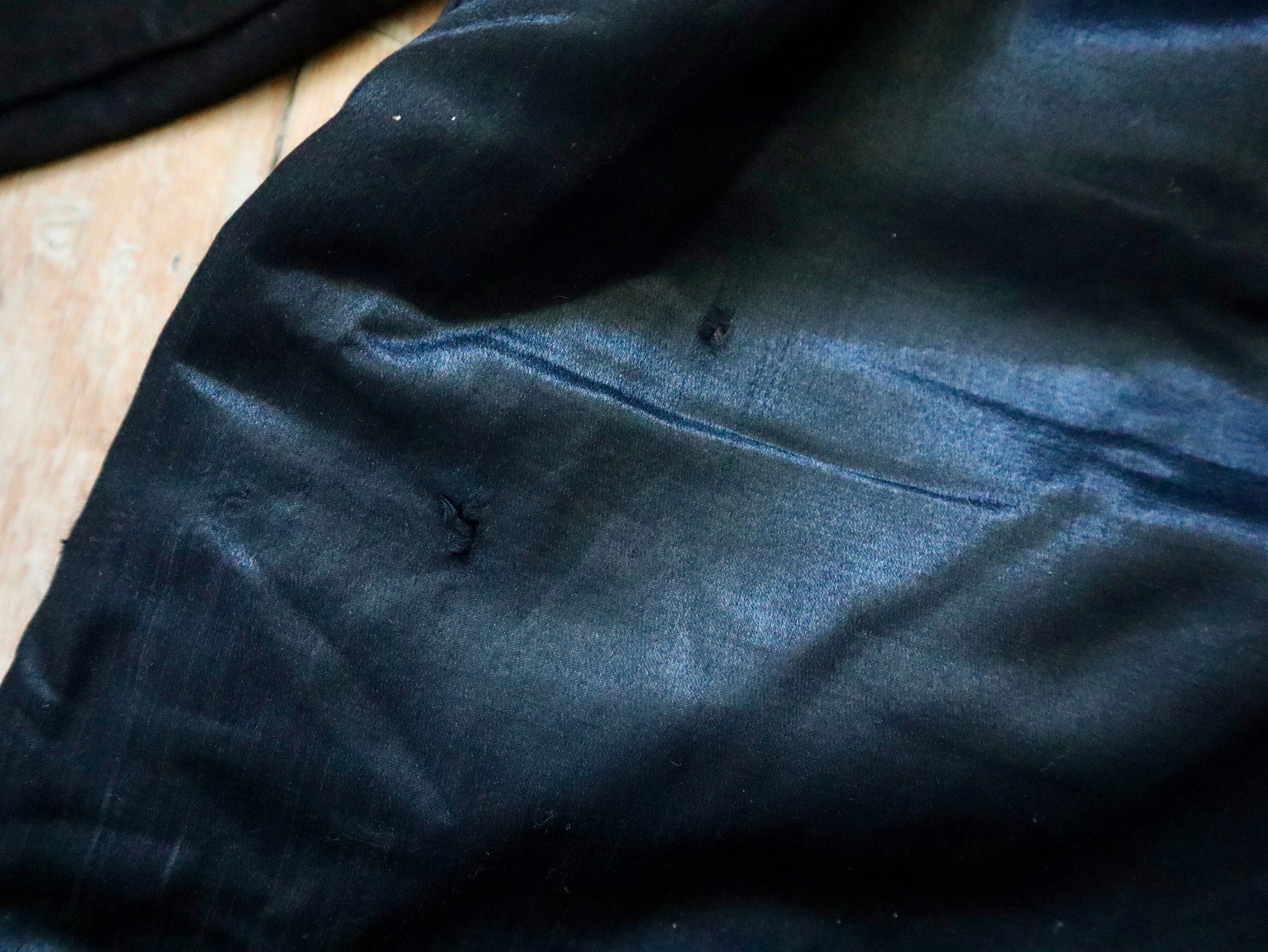 - A few small holes and thinning in the silk, including a larger area on the back of the right arm