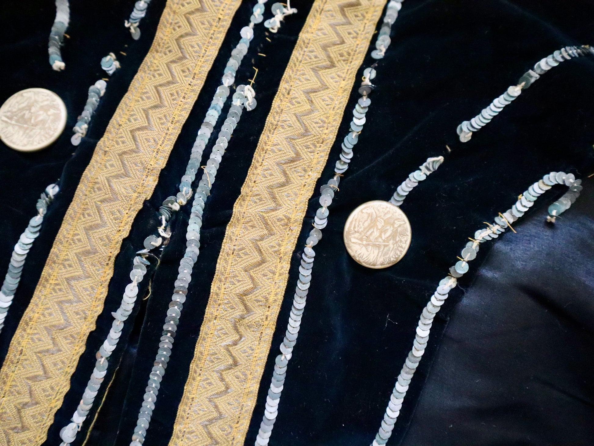 Unique brass buttons, embossed with 18th-century hunting scenes, fasten the front. The shoulders feature long, pointed panels that drape like a collar at the front and hang dramatically low at the back. It also includes two side pockets for function and form.