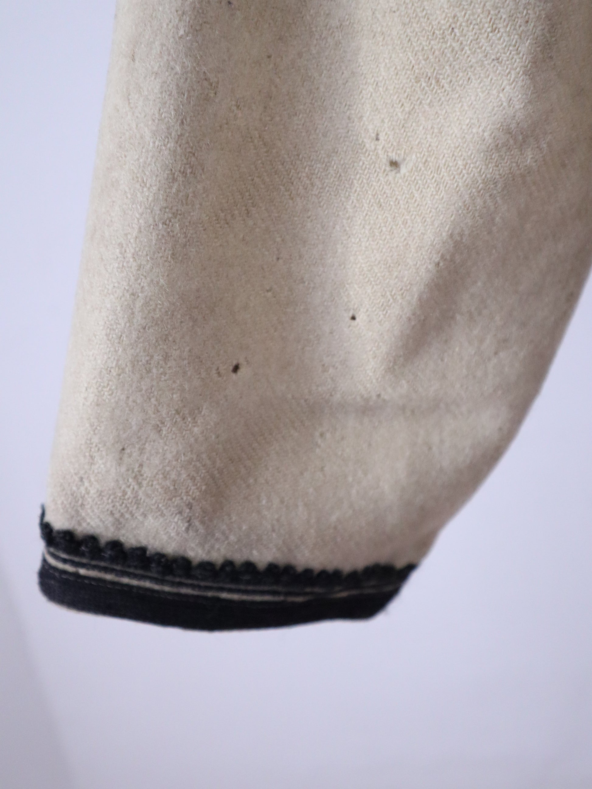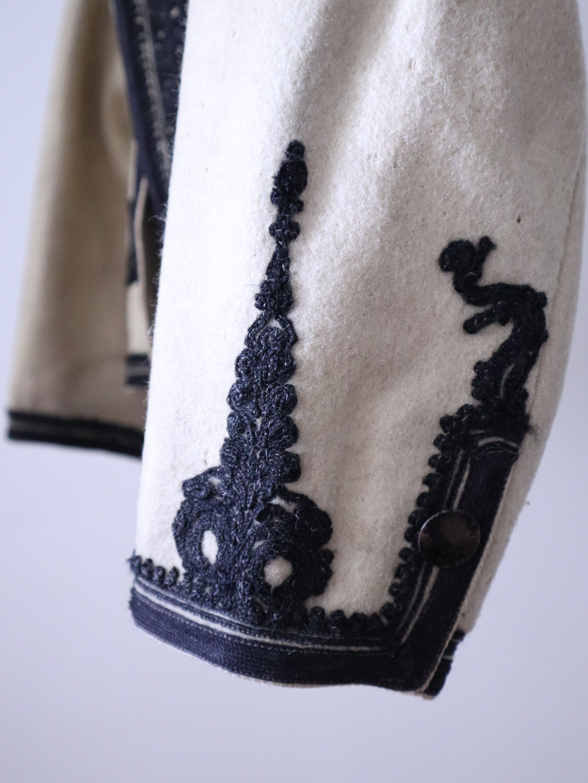 1930s Transylvanian Folk Jacket – Cream Wool with Black Soutache Embroidery – Indigo Cotton Twill Lining – Traditional Vintage Coat