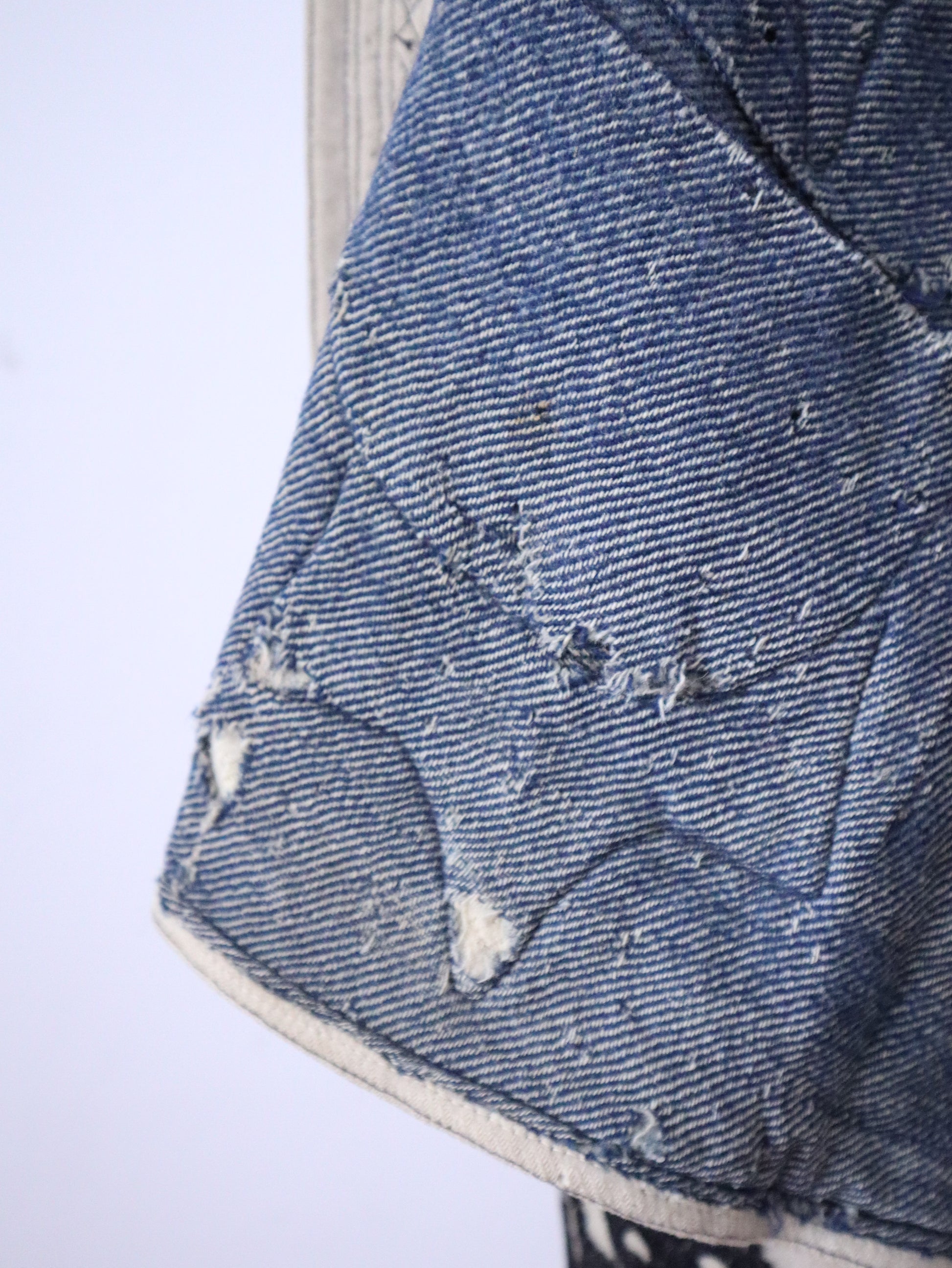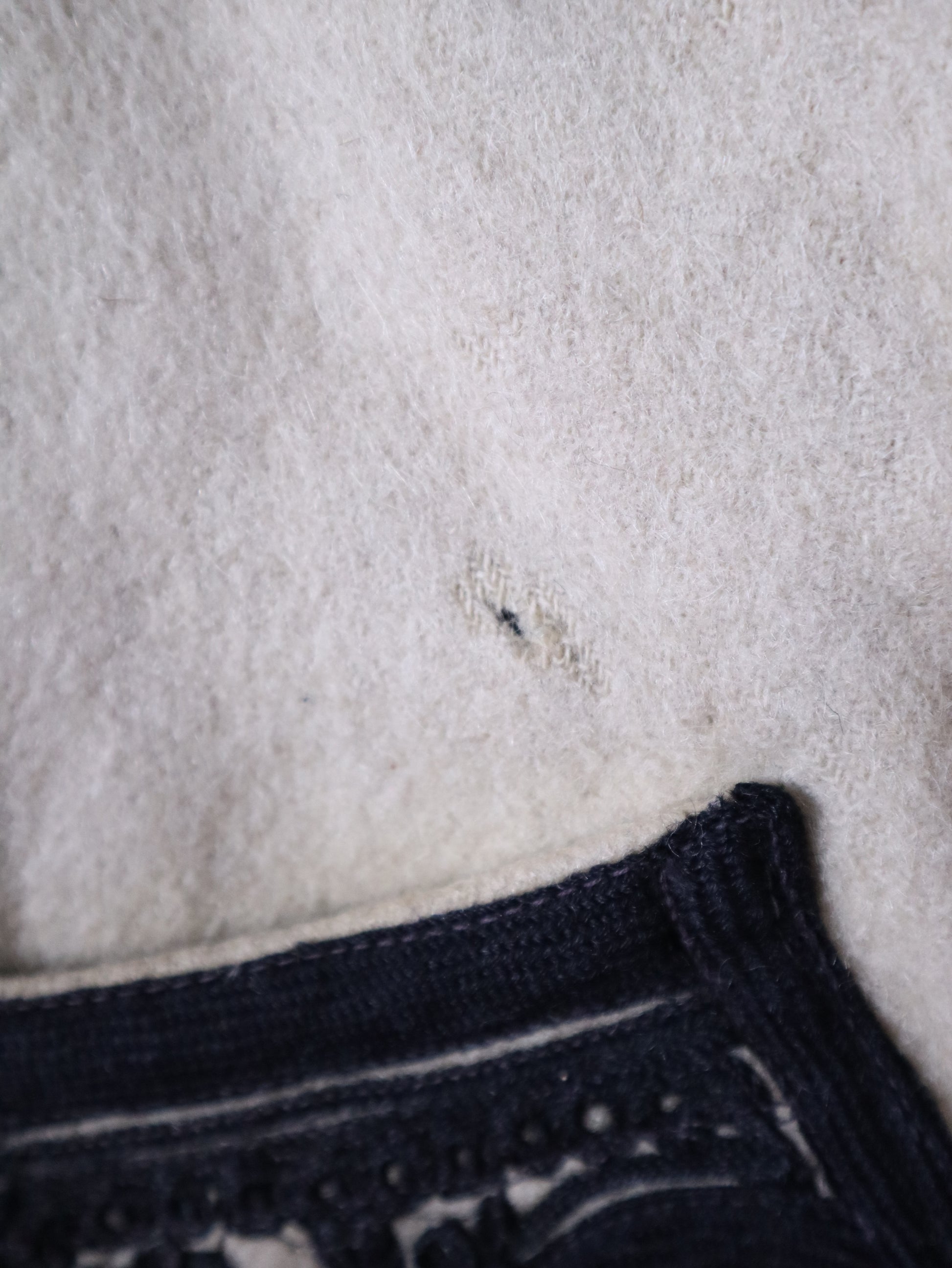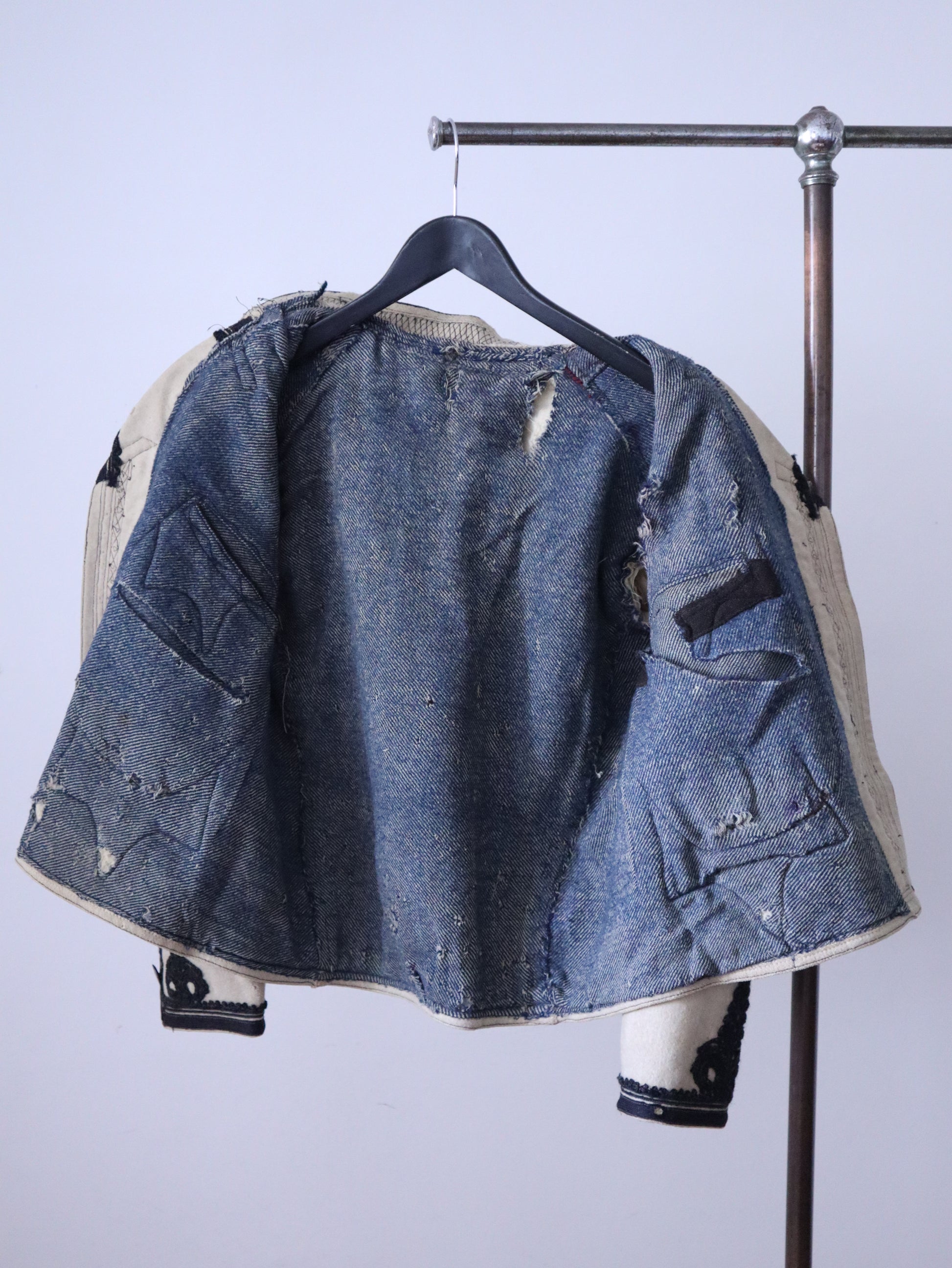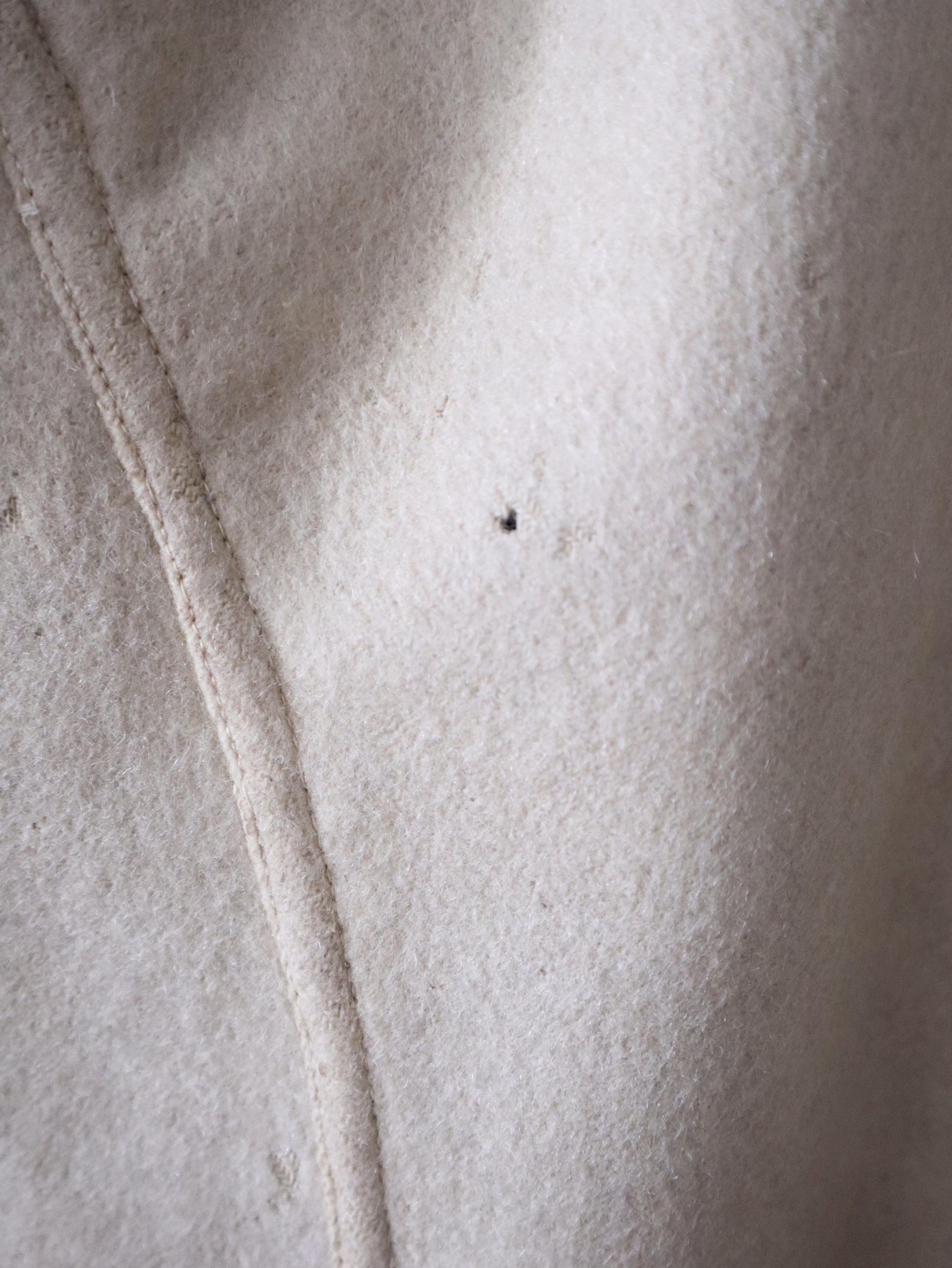 Freshly laundered and structurally strong. The cream wool shows widespread moth damage, with scattered holes and surface nibbles, particularly on the sleeves and back. The indigo cotton twill lining is heavily worn, with multiple holes, tears, and fraying, as shown in the photos.