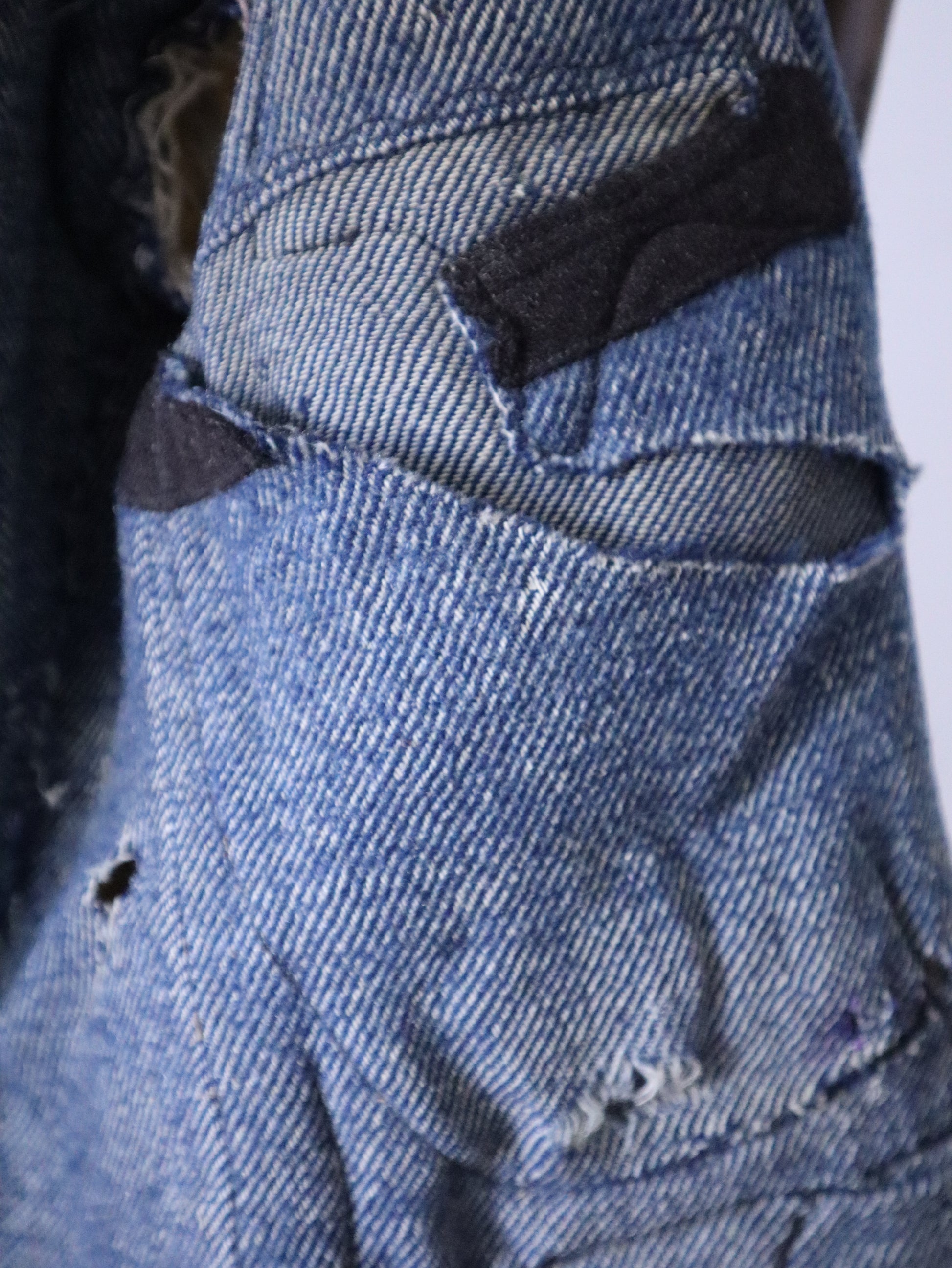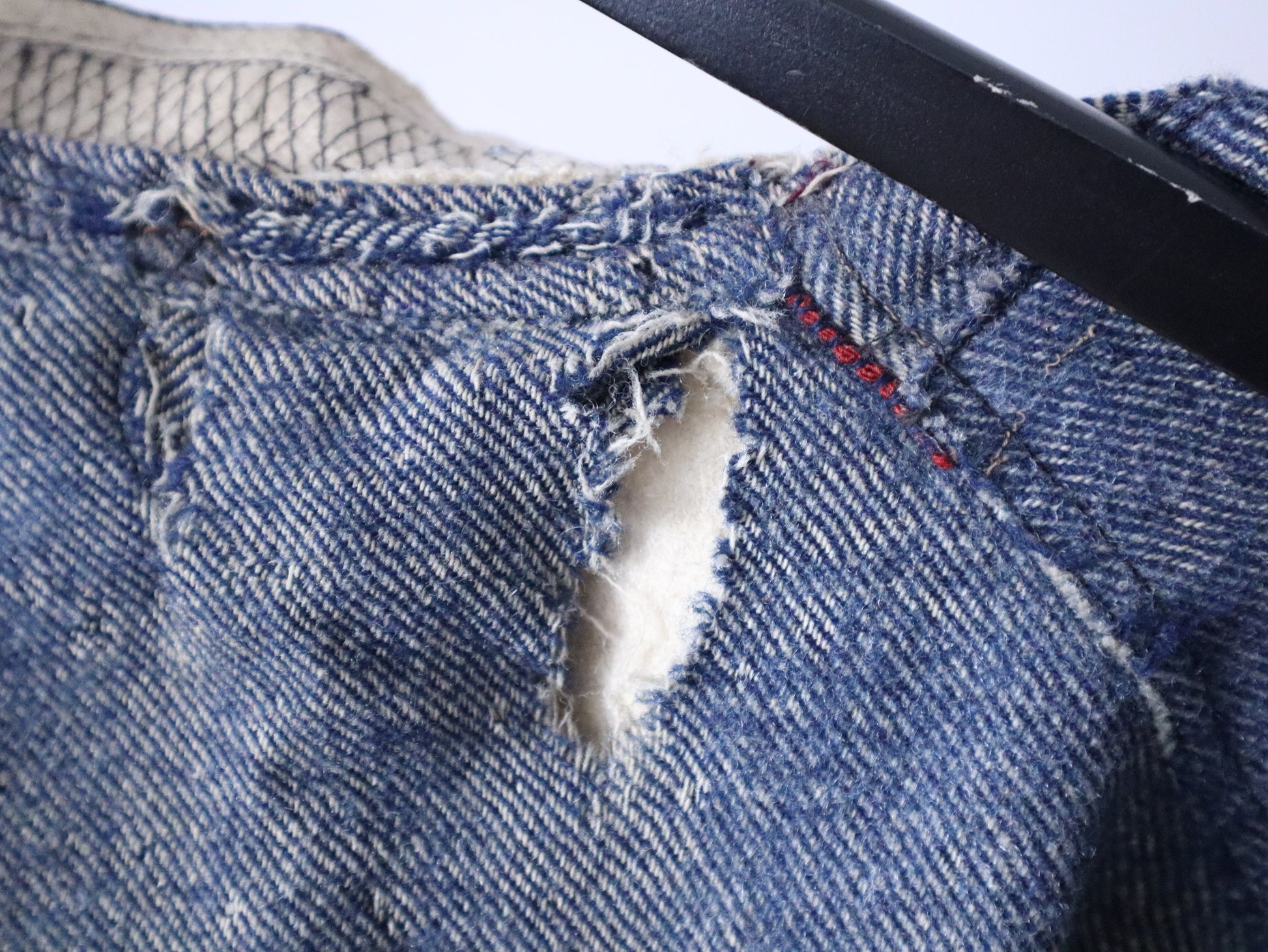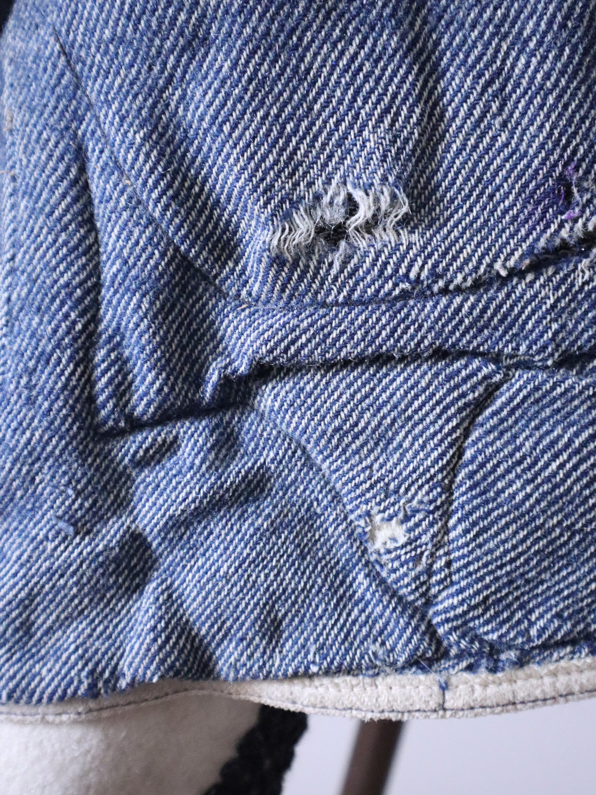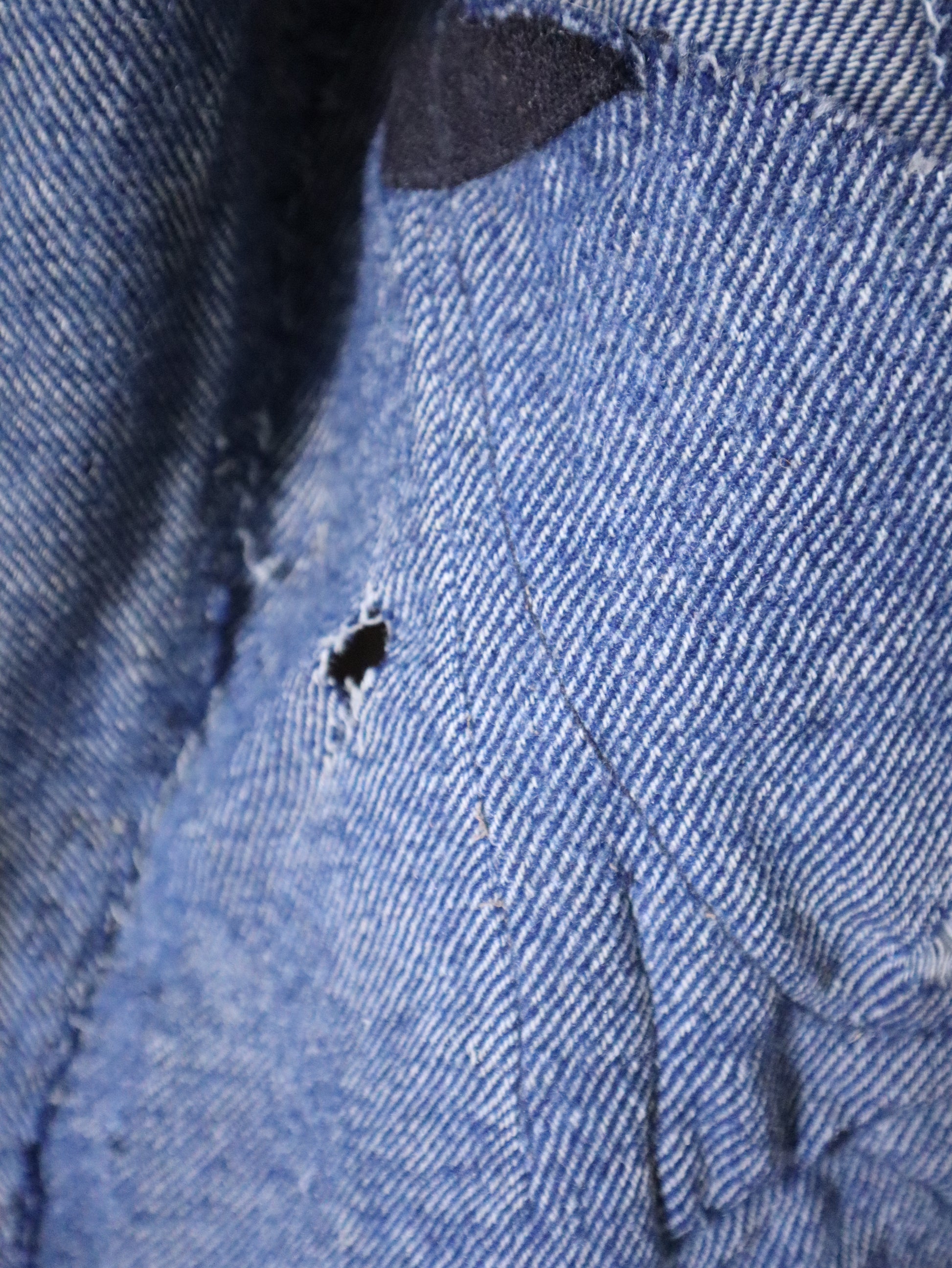 Freshly laundered and structurally strong. The cream wool shows widespread moth damage, with scattered holes and surface nibbles, particularly on the sleeves and back. The indigo cotton twill lining is heavily worn, with multiple holes, tears, and fraying, as shown in the photos.