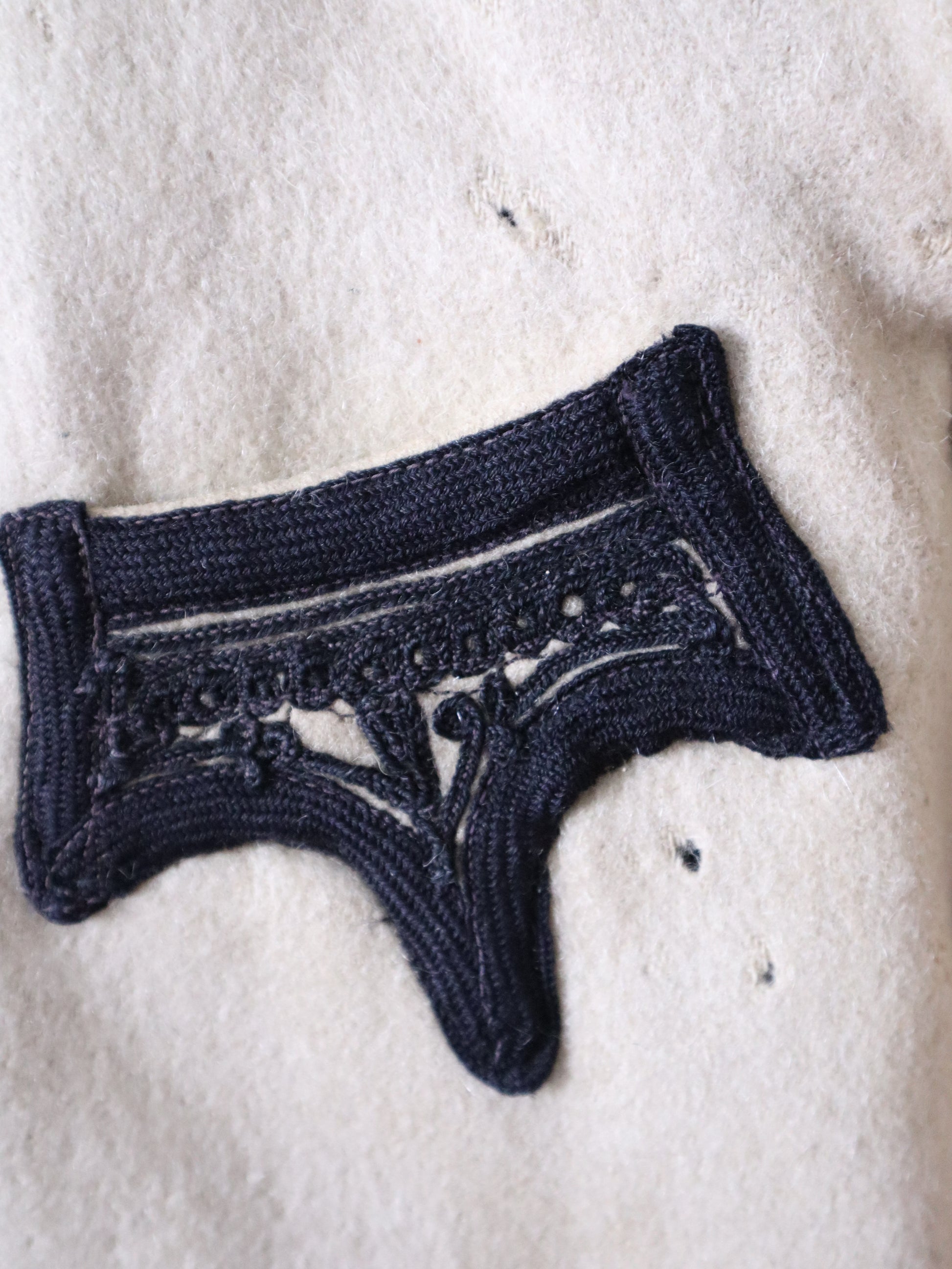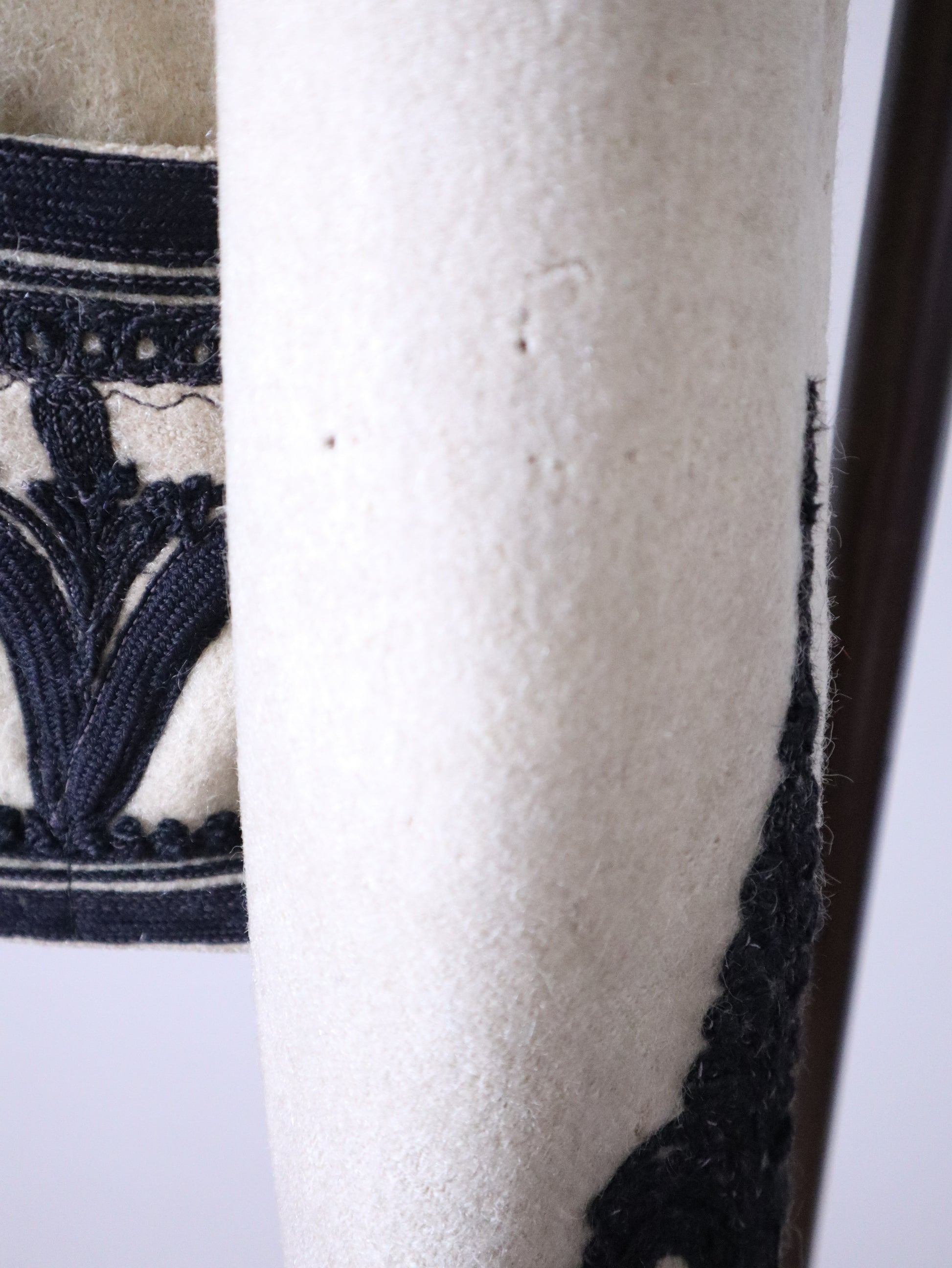 The embroidery is especially dense around the collar and front, and continues in pointed and linear motifs at the cuffs, back yoke, and hem. The interior is fully lined in a deep indigo cotton twill — a beautiful, sturdy textile that contrasts strikingly with the cream wool outer.